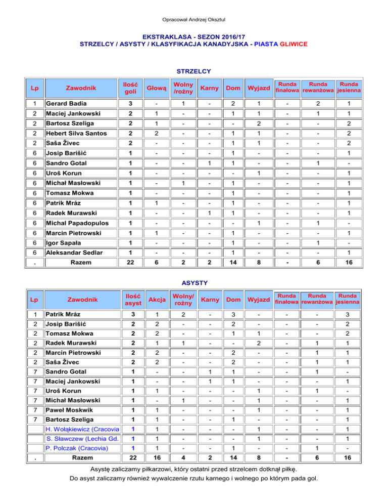Opracował Andrzej Oksztul EKSTRAKLASA - SEZON 2016/17 STRZELCY / ASYSTY / KLASYFIKACJA KANADYJSKA - PIASTA GLIWICE STRZELCY Lp Zawodnik Ilość goli Głową Wolny /rożny Karny Dom Runda Runda Runda Wyjazd finałowa rewanżowa jesienna 1 Gerard Badía 3 - 1 - 2 1 - 2 1 2 Maciej Jankowski 2 1 - - 1 1 - 1 1 2 Bartosz Szeliga 2 1 - - - 2 - - 2 2 Hebert Silva Santos 2 2 - - 1 1 - - 2 2 Saša Živec 2 - - - 1 1 - - 2 6 Josip Barišić 1 - - - 1 - - - 1 6 Sandro Gotal 1 - - 1 1 - - 1 - 6 Uroš Korun 1 - - - - 1 - - 1 6 Michał Masłowski 1 - 1 - 1 - - - 1 6 Tomasz Mokwa 1 - - - 1 - - - 1 6 Patrik Mráz 1 1 - - 1 - - - 1 6 Radek Murawski 1 - - 1 1 - - - 1 6 Michal Papadopulos 1 - - - - 1 - 1 - 6 Marcin Pietrowski 1 1 - - 1 - - - 1 6 Igor Sapała 1 - - - 1 - - 1 - 6 Aleksandar Sedlar 1 - - - 1 - - - 1 22 6 2 2 14 8 - 6 16 Runda Runda Runda . Razem ASYSTY Lp Zawodnik Ilość asyst Akcja Wolny/ rożny Karny Dom Wyjazd finałowa rewanżowa jesienna 1 Patrik Mráz 3 1 2 - 3 - - - 3 2 Josip Barišić 2 2 - - 2 - - - 2 2 Tomasz Mokwa 2 2 - - 1 1 - - 2 2 Radek Murawski 2 1 1 - - 2 - 1 1 2 Marcin Pietrowski 2 2 - - 2 - - 1 1 2 Saša Živec 2 2 - - 2 - - 1 1 7 Sandro Gotal 1 - - 1 1 - - 1 - 7 Maciej Jankowski 1 - - 1 1 - - - 1 7 Uroš Korun 1 1 - - - 1 - 1 - 7 Michał Masłowski 1 - 1 - - 1 - - 1 7 Paweł Moskwik 1 1 - - - 1 - - 1 7 Bartosz Szeliga 1 1 - - 1 - - - 1 H. Wołąkiewicz (Cracovia 1 1 - - - 1 - - 1 S. Sławczew (Lechia Gd. 1 1 - - - 1 - - 1 P. Polczak (Cracovia) 1 1 - - 1 - - 1 - 22 16 4 2 14 8 - 6 16 . Razem Asystę zaliczamy piłkarzowi, który ostatni przed strzelcem dotknął piłkę. Do asyst zaliczamy również wywalczenie rzutu karnego i wolnego po którym pada gol. KLASYFIKACJA KANADYJSKA Lp Zawodnik Razem Bramki Asysty 1 Saša Živec 4 2 2 2 Patrik Mráz 4 1 3 3 Gerard Badía 3 3 - 4 Maciej Jankowski 3 2 1 4 Bartosz Szeliga 3 2 1 6 Josip Barišić 3 1 2 6 Tomasz Mokwa 3 1 2 6 Radek Murawski 3 1 2 6 Marcin Pietrowski 3 1 2 10 Hebert Silva Santos 2 2 - 11 Sandro Gotal 2 1 1 11 Uroš Korun 2 1 1 11 Michał Masłowski 2 1 1 14 Michal Papadopulos 1 1 - 14 Igor Sapała 1 1 - 14 Aleksandar Sedlar 1 1 - 17 Paweł Moskwik 1 - 1 H. Wołąkiewicz (Cracovia) 1 - 1 S. Sławczew (Lechia Gd.) 1 - 1 P. Polczak (Cracovia) 1 - 1 44 22 22 . Razem Przy równej ilości punktów o kolejności w punktacji kanadyjskiej decyduje większa ilość strzelonych bramek.