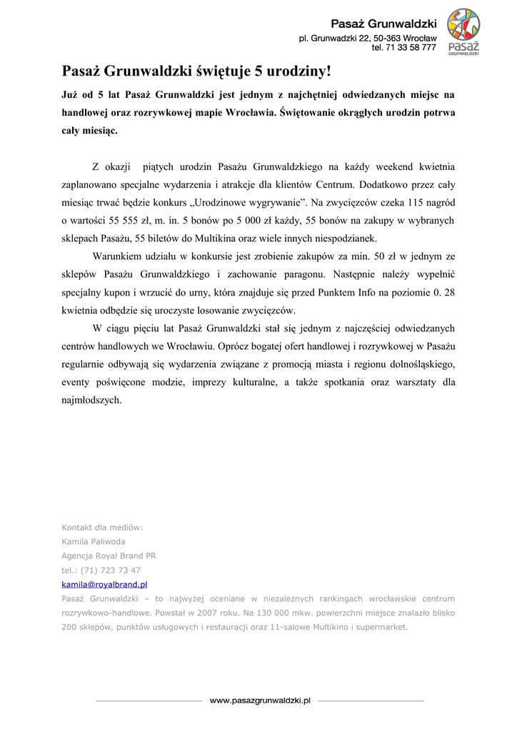 Pasaż Grunwaldzki świętuje 5 urodziny! Już od 5 lat Pasaż Grunwaldzki jest jednym z najchętniej odwiedzanych miejsc na handlowej oraz rozrywkowej mapie Wrocławia. Świętowanie okrągłych urodzin potrwa cały miesiąc. Z okazji piątych urodzin Pasażu Grunwaldzkiego na każdy weekend kwietnia zaplanowano specjalne wydarzenia i atrakcje dla klientów Centrum. Dodatkowo przez cały miesiąc trwać będzie konkurs „Urodzinowe wygrywanie”. Na zwycięzców czeka 115 nagród o wartości 55 555 zł, m. in. 5 bonów po 5 000 zł każdy, 55 bonów na zakupy w wybranych sklepach Pasażu, 55 biletów do Multikina oraz wiele innych niespodzianek. Warunkiem udziału w konkursie jest zrobienie zakupów za min. 50 zł w jednym ze sklepów Pasażu Grunwaldzkiego i zachowanie paragonu. Następnie należy wypełnić specjalny kupon i wrzucić do urny, która znajduje się przed Punktem Info na poziomie 0. 28 kwietnia odbędzie się uroczyste losowanie zwycięzców. W ciągu pięciu lat Pasaż Grunwaldzki stał się jednym z najczęściej odwiedzanych centrów handlowych we Wrocławiu. Oprócz bogatej ofert handlowej i rozrywkowej w Pasażu regularnie odbywają się wydarzenia związane z promocją miasta i regionu dolnośląskiego, eventy poświęcone modzie, imprezy kulturalne, a także spotkania oraz warsztaty dla najmłodszych. Kontakt dla mediów: Kamila Paliwoda Agencja Royal Brand PR tel.: (71) 723 73 47 [email protected] Pasaż Grunwaldzki – to najwyżej oceniane w niezależnych rankingach wrocławskie centrum rozrywkowo-handlowe. Powstał w 2007 roku. Na 130 000 mkw. powierzchni miejsce znalazło blisko 200 sklepów, punktów usługowych i restauracji oraz 11-salowe Multikino i supermarket.