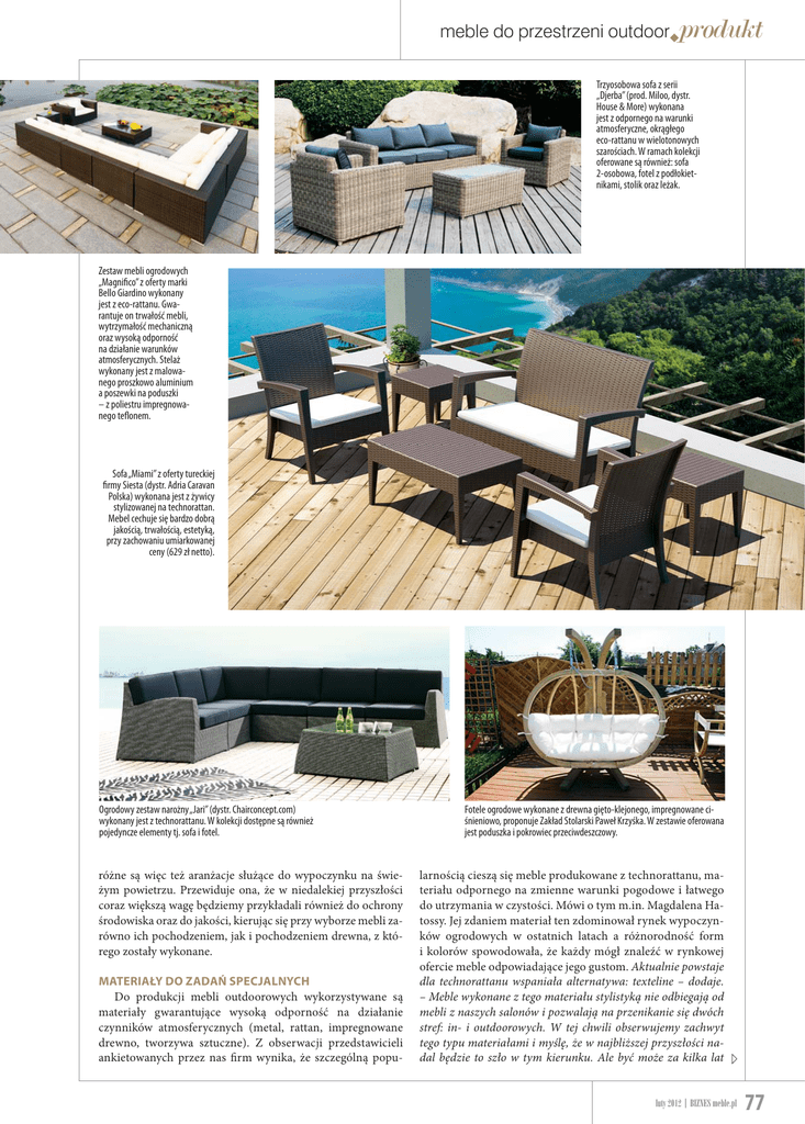 meble do przestrzeni outdoorX produkt Trzyosobowa sofa z serii „Djerba” (prod. Miloo, dystr. House & More) wykonana jest z odpornego na warunki atmosferyczne, okrągłego eco-rattanu w wielotonowych szarościach. W ramach kolekcji oferowane są również: sofa 2-osobowa, fotel z podłokietnikami, stolik oraz leżak. Zestaw mebli ogrodowych „Magnifico” z oferty marki Bello Giardino wykonany jest z eco-rattanu. Gwarantuje on trwałość mebli, wytrzymałość mechaniczną oraz wysoką odporność na działanie warunków atmosferycznych. Stelaż wykonany jest z malowanego proszkowo aluminium a poszewki na poduszki – z poliestru impregnowanego teflonem. Sofa „Miami” z oferty tureckiej firmy Siesta (dystr. Adria Caravan Polska) wykonana jest z żywicy stylizowanej na technorattan. Mebel cechuje się bardzo dobrą jakością, trwałością, estetyką, przy zachowaniu umiarkowanej ceny (629 zł netto). Ogrodowy zestaw narożny „Jari” (dystr. Chairconcept.com) wykonany jest z technorattanu. W kolekcji dostępne są również pojedyncze elementy tj. sofa i fotel. różne są więc też aranżacje służące do wypoczynku na świeżym powietrzu. Przewiduje ona, że w niedalekiej przyszłości coraz większą wagę będziemy przykładali również do ochrony środowiska oraz do jakości, kierując się przy wyborze mebli zarówno ich pochodzeniem, jak i pochodzeniem drewna, z którego zostały wykonane. MATERIAŁY DO ZADAŃ SPECJALNYCH Do produkcji mebli outdoorowych wykorzystywane są materiały gwarantujące wysoką odporność na działanie czynników atmosferycznych (metal, rattan, impregnowane drewno, tworzywa sztuczne). Z obserwacji przedstawicieli ankietowanych przez nas firm wynika, że szczególną popu- Fotele ogrodowe wykonane z drewna gięto-klejonego, impregnowane ciśnieniowo, proponuje Zakład Stolarski Paweł Krzyśka. W zestawie oferowana jest poduszka i pokrowiec przeciwdeszczowy. larnością cieszą się meble produkowane z technorattanu, materiału odpornego na zmienne warunki pogodowe i łatwego do utrzymania w czystości. Mówi o tym m.in. Magdalena Hatossy. Jej zdaniem materiał ten zdominował rynek wypoczynków ogrodowych w ostatnich latach a różnorodność form i kolorów spowodowała, że każdy mógł znaleźć w rynkowej ofercie meble odpowiadające jego gustom. Aktualnie powstaje dla technorattanu wspaniała alternatywa: texteline – dodaje. – Meble wykonane z tego materiału stylistyką nie odbiegają od mebli z naszych salonów i pozwalają na przenikanie się dwóch stref: in- i outdoorowych. W tej chwili obserwujemy zachwyt tego typu materiałami i myślę, że w najbliższej przyszłości nadal będzie to szło w tym kierunku. Ale być może za kilka lat f luty 2012 [ BIZNES meble.pl 77