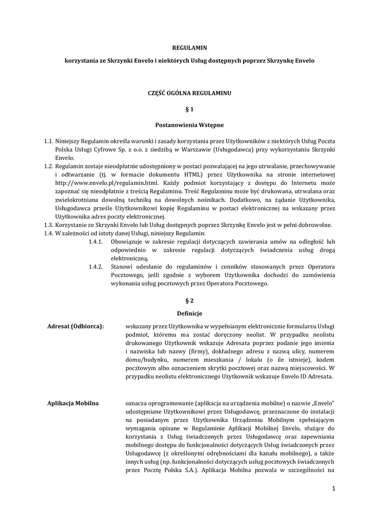 REGULAMIN korzystania ze Skrzynki Envelo i niektórych Usług dostępnych poprzez Skrzynkę Envelo CZĘŚĆ OGÓLNA REGULAMINU §1 Postanowienia Wstępne 1.1. Niniejszy Regulamin określa warunki i zasady korzystania przez Użytkowników z niektórych Usług Poczta Polska Usługi Cyfrowe Sp. z o.o. z siedzibą w Warszawie (Usługodawca) przy wykorzystaniu Skrzynki Envelo. 1.2. Regulamin zostaje nieodpłatnie udostępniony w postaci pozwalającej na jego utrwalanie, przechowywanie i odtwarzanie (tj. w formacie dokumentu HTML) przez Użytkownika na stronie internetowej http://www.envelo.pl/regulamin.html. Każdy podmiot korzystający z dostępu do Internetu może zapoznać się nieodpłatnie z treścią Regulaminu. Treść Regulaminu może być drukowana, utrwalana oraz zwielokrotniana dowolną techniką na dowolnych nośnikach. Dodatkowo, na żądanie Użytkownika, Usługodawca prześle Użytkownikowi kopię Regulaminu w postaci elektronicznej na wskazany przez Użytkownika adres poczty elektronicznej. 1.3. Korzystanie ze Skrzynki Envelo lub Usług dostępnych poprzez Skrzynkę Envelo jest w pełni dobrowolne. 1.4. W zależności od istoty danej Usługi, niniejszy Regulamin: 1.4.1. Obowiązuje w zakresie regulacji dotyczących zawierania umów na odległość lub odpowiednio w zakresie regulacji dotyczących świadczenia usług drogą elektroniczną, 1.4.2. Stanowi odesłanie do regulaminów i cenników stosowanych przez Operatora Pocztowego, jeśli zgodnie z wyborem Użytkownika dochodzi do zamówienia wykonania usług pocztowych przez Operatora Pocztowego. §2 Definicje Adresat (Odbiorca): wskazany przez Uzytkownika w wypełnianym elektronicznie formularzu Usługi podmiot, ktoremu ma zostac doręczony neolist. W przypadku neolistu drukowanego Uzytkownik wskazuje Adresata poprzez podanie jego imienia i nazwiska lub nazwy (firmy), dokładnego adresu z nazwą ulicy, numerem domu/budynku, numerem mieszkania / lokalu (o ile istnieje), kodem pocztowym albo oznaczeniem skrytki pocztowej oraz nazwą miejscowosci. W przypadku neolistu elektronicznego Uzytkownik wskazuje Envelo ID Adresata. Aplikacja Mobilna oznacza oprogramowanie (aplikacja na urządzenia mobilne) o nazwie „Envelo” udostępniane Uzytkownikowi przez Usługodawcę, przeznaczone do instalacji na posiadanym przez Uzytkownika Urządzeniu Mobilnym spełniającym wymagania opisane w Regulaminie Aplikacji Mobilnej Envelo, słuzące do korzystania z Usług swiadczonych przez Usługodawcę oraz zapewniania mobilnego dostępu do funkcjonalnosci dotyczących Usług swiadczonych przez Usługodawcę (z okreslonymi odrębnosciami dla kanału mobilnego), a takze innych usług (np. funkcjonalnosci dotyczących usług pocztowych swiadczonych przez Pocztę Polska S.A.). Aplikacja Mobilna pozwala w szczegolnosci na 1 przeglądanie zbioru Awersow Usługodawcy, wprowadzanie i przeglądanie Awersow Uzytkownika, komponowanie własnej Neokartki Mobilnej, przesyłanie Neokartki Mobilnej do Systemu Informatycznego w celu jej konwersji na dokument nadający się do druku oraz w szczegolnosci na: wyszukanie najblizszej dla Uzytkownika placowki pocztowej lub skrzynki pocztowej, zamowienie kuriera, sledzenie przesyłki, znalezienie kodu pocztowego i odbieranie Neorachunkow. Aplikacja Mobilna pozwala rowniez na dostęp do innych usług dostępnych poprzez Skrzynkę Envelo z odrębnosciami dotyczącymi tego kanału mobilnego wskazanymi w Regulaminie Aplikacji Mobilnej Envelo, Regulaminie korzystania z Usługi Neokartka Mobilna, z Usługi Neorachunki oraz z usługi Skrzynka Envelo (z wykorzystaniem Aplikacji Mobilnej Envelo), w Cennikach dotyczących usług dostępnych za pomocą Aplikacji Mobilnej lub w samej Aplikacji Mobilnej. BOK PPUC: Biuro Obsługi Klientów Usługodawcy z siedzibą w Warszawie, ul. Rodziny Hiszpańskich 8, 02-685 Warszawa. Kontakt z BOK PPUC możliwy jest pod numerem telefonu: (+48) 22 276 28 28 (opłata zgodnie z taryfa dostawcy usług telekomunikacyjnych, z której korzysta Użytkownik) lub e-mailem na adres: [email protected]. Data nadania: Użytkownik, korzystając z Usługi neolistu drukowanego, korzysta z automatycznej daty nadania przesyłki u Operatora Pocztowego (następującej w ciągu dwóch dni roboczych po dniu zawarcia Umowy o Usługę Neolistu drukowanego). Zawierając Umowę o Usługę Neolistu drukowanego Użytkownik będący Konsumentem wyraża zgodę na wykonanie przez Usługodawcę Usługi Neolistu drukowanego przed upływem 14-dniowego terminu na odstąpienie przez Konsumenta od umowy zawieranej na odległość i tym samym rezygnuje z ustawowego prawa do odstąpienia od Umowy o Usługę Neolistu drukowanego, (jeśli takie prawo mu przysługuje). Dane Użytkownika: wszelkie dane tekstowe, graficzne, zdjęcia, w tym również dane osobowe, które Użytkownik przetwarza w ramach korzystania ze Skrzynki Envelo lub wprowadza w trakcie zamawiania Usługi (zakupu neolistu) np. dane Adresata lub jako nadawcy wpisywane w wypełnianym elektronicznie formularzu Usługi Neolistu dostępnym w ramach Skrzynki Envelo lub dane Użytkownika w ramach Mojego Konta. Envelo (lub Platforma Envelo): prowadzona przez Usługodawcę platforma internetowa (w tym również webserwisy), w postaci zorganizowanego systemu teleinformatycznego (w rozumieniu regulacji dotyczących świadczenia usług drogą elektroniczną, obejmującego w szczególności sprzęt komputerowy, serwery, urządzenia peryferyjne, oprogramowanie i treści / content), utrzymywana przez Usługodawcę oraz dostępna pod adresem internetowym http://www.envelo.pl, w ramach, której Użytkownik może korzystać ze Skrzynki Envelo oraz dostępna jest m.in. Usługa neolistu. 2 indywidualny, dziewięciocyfrowy numer nadawany w sposób zautomatyzowany każdemu Użytkownikowi Skrzynki Envelo podczas jej zakładania (aktywowania) przez Użytkownika. Envelo ID jest jednocześnie identyfikatorem Użytkownika i jego adresem wirtualnym na Platformie Envelo. Envelo ID: Moje Konto: funkc