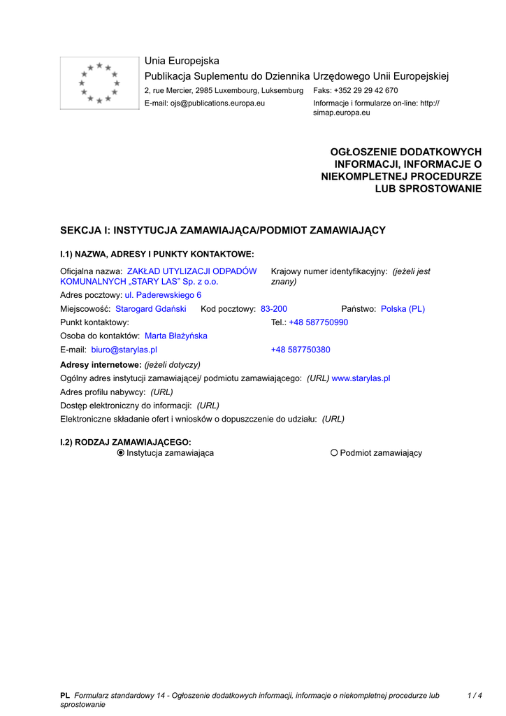 Unia Europejska Publikacja Suplementu do Dziennika Urzędowego Unii Europejskiej 2, rue Mercier, 2985 Luxembourg, Luksemburg Faks: +352 29 29 42 670 E-mail: [email protected] Informacje i formularze on-line: http:// simap.europa.eu OGŁOSZENIE DODATKOWYCH INFORMACJI, INFORMACJE O NIEKOMPLETNEJ PROCEDURZE LUB SPROSTOWANIE SEKCJA I: INSTYTUCJA ZAMAWIAJĄCA/PODMIOT ZAMAWIAJĄCY I.1) NAZWA, ADRESY I PUNKTY KONTAKTOWE: Oficjalna nazwa: ZAKŁAD UTYLIZACJI ODPADÓW KOMUNALNYCH „STARY LAS” Sp. z o.o. Krajowy numer identyfikacyjny: (jeżeli jest znany) _____ Adres pocztowy: ul. Paderewskiego 6 Miejscowość: Starogard Gdański Kod pocztowy: 83-200 Punkt kontaktowy: _____ Państwo: Polska (PL) Tel.: +48 587750990 Osoba do kontaktów: Marta Błażyńska E-mail: [email protected] +48 587750380 Adresy internetowe: (jeżeli dotyczy) Ogólny adres instytucji zamawiającej/ podmiotu zamawiającego: (URL) www.starylas.pl Adres profilu nabywcy: (URL) _____ Dostęp elektroniczny do informacji: (URL) _____ Elektroniczne składanie ofert i wniosków o dopuszczenie do udziału: (URL) _____ I.2) RODZAJ ZAMAWIAJĄCEGO: Instytucja zamawiająca Podmiot zamawiający PL Formularz standardowy 14 - Ogłoszenie dodatkowych informacji, informacje o niekompletnej procedurze lub sprostowanie 1/4 SEKCJA II: PRZEDMIOT ZAMÓWIENIA II.1.1) Nazwa nadana zamówieniu: Dostawa maszyn i urządzeń do Zakładu Utylizacji Odpadów Komunalnych „Stary Las” II.1.2) Krótki opis zamówienia lub zakupu:(podano w pierwotnym ogłoszeniu) 1. Przedmiotem niniejszego zamówienia są Dostawy – maszyn / urządzeń do zakładu zagospodarowania odpadów, realizowanego w ramach Przedsięwzięcia: Racjonalizacja gospodarki odpadami poprzez budowę Zakładu Utylizacji Odpadów Komunalnych „Stary Las”, dla którego Zamawiający uzyskał dofinansowanie z Funduszu Spójności, zarejestrowanego przez Komisję Europejską pod numerem POIS.02.01.00-00-005/09. 5. Przedmiot zamówienia składa się z następujących zamówień częściowych: 1) Zamówienie częściowe Partia 1 – dostawa ładowarek kołowych czołowych a. ładowarka kołowa czołowa – szt. 2 2) Zamówienie częściowe Partia 2 – dostawa ładowarek kołowych teleskopowych a. ładowarka kołowa teleskopowa – szt. 2 3) Zamówienie częściowe Partia 3 – dostawa koparko-ładowarki a. koparko-ładowarka – szt. 1 4) Zamówienie częściowe Partia 4 – dostawa ciągnika rolniczego z oprzyrządowaniem a. ciągnik rolniczy z oprzyrządowaniem – szt. 1 i. przyczepa samowyładowcza – szt. 1 ii. przyczepa asenizacyjna – szt. 1 iii. piaskarka – szt. 1 iv. kosiarka rotacyjna – szt. 1 v. pług do odśnieżania – szt. 1 vi. zamiatarka ciągniona z opcją zraszania i szczotką boczną – szt. 1 vii. rębak do gałęzi – szt. 1 5) Zamówienie częściowe Partia 5 – dostawa mobilnej kruszarki do odpadów budowlanych a. mobilna kruszarka do odpadów budowlanych – szt. 1 3. Przedsięwzięcie to będzie realizowane w ramach niniejszego Kontraktu przez Wykonawcę wyłonionego w ramach niniejszego postępowania przetargowego oraz wykonawców wyłonionych dla niżej wymienionych kontraktów na roboty budowlane oraz usługi: 1) Kontrakt nr 1- Usługa Inżyniera Kontraktu dla kontraktów na Roboty i Dostawy, 2) Kontrakt nr 2Roboty budowlano- montażowe 3) Kontrakt nr 4b- budowa drogi dojazdowej do ZUOK „Stary Las” (odcinek Rokocin- Stary Las), wraz z przebudową infrastruktury technicznej kolidującej z zamierzoną inwestycją 4) Kontrakt nr 5- KAMPANII PROMOCYJNEJ dla projektu nr POIS.02.01.00-00-005/09 pn. „Racjonalizacja gospodarki odpadami poprzez budowę Zakładu Utylizacji Odpadów Komunalnych „Stary Las”. 5) Kontrakt nr 6zakup instalacji energetycznego wykorzystania biogazu 6) Kontrakt 7- usługi inżyniera kontraktu dla kontraktu na budowę drogi dojazdowej od ZUOK „Stary Las” wraz z przebudową infrastruktury technicznej kolidującej z zamierzoną inwestycją. II.1.3) Wspólny Słownik Zamówień (CPV) Główny przedmiot Dodatkowe przedmioty Słownik główny 16000000 16310000 16311100 16500000 16700000 16810000 34000000 42996100 43000000 43250000 43260000 43261000 43261100 Słownik uzupełniający (jeżeli dotyczy) PL Formularz standardowy 14 - Ogłoszenie dodatkowych informacji, informacje o niekompletnej procedurze lub sprostowanie 2/4 SEKCJA IV: PROCEDURA IV.1)RODZAJ PROCEDURY(podano w pierwotnym ogłoszeniu) Otwarta Ograniczona Ograniczona przyspieszona Negocjacyjna Negocjacyjna przyspieszona Dialog konkurencyjny Negocjacyjna z uprzednim ogłoszeniem Negocjacyjna bez uprzedniego ogłoszenia Negocjacyjna z publikacją ogłoszenia o zamówieniu Negocjacyjna bez publikacji ogłoszenia o zamówieniu Udzielenie zamówienia bez uprzedniej publikacji ogłoszenia o zamówieniu w Dzienniku Urzędowym Unii Europejskiej IV.2)INFORMACJE ADMINISTRACYJNE IV.2.1)Numer referencyjny: (podano w pierwotnym ogłoszeniu) ZP/POIS.02.01.00-00-005/09/6/2011 IV.2.2)Dane referencyjne ogłoszenia w przypadku ogłoszeń przesłanych drogą elektroniczną: Pierwotne ogłoszenie przesłane przez eNotices TED eSender Login: ENOTICES_ZUO_S_Las Dane referencyjne ogłoszenia: 2011-153805 rok i numer dokumentu IV.2.3)Ogłoszenie, którego dotyczy niniejsza publikacja: Numer ogłoszenia w Dz.U.: 2011/S 215-350659 z dnia: 09/11/2011 (dd/mm/rrrr) IV.2.4)Data wysłania pierwotnego ogłoszenia: 04/11/2011 (dd/mm/rrrr) PL Formularz standardowy 14 - Ogłoszenie dodatkowych informacji, informacje o niekompletnej procedurze lub sprostowanie 3/4 SEKCJA VI: INFORMACJE UZUPEŁNIAJĄCE VI.1) OGŁOSZENIE DOTYCZY: Procedury niepełnej Sprostowania Informacji dodatkowych VI.2) INFORMACJE NA TEMAT NIEPEŁNEJ PROCEDURY UDZIELENIA ZAMÓWIENIA: Postępowanie o udzielenie zamówienia zostało przerwane Postępowanie o udzielenie zamówienia uznano za nieskuteczne Zamówienia nie udzielono Zamówienie może być przedmiotem ponownej publikacji VI.3) INFORMACJE DO POPRAWIENIA LUB DODANIA : VI.3.1) Zmi
