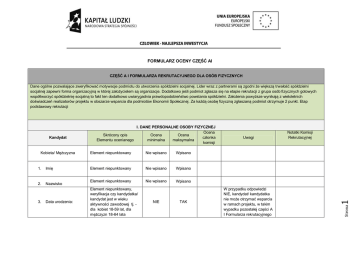 FORMULARZ OCENY CZĘŚĆ AI CZĘŚĆ A I FORMULARZA REKRUTACYJNEGO DLA OSÓB FIZYCZNYCH Dane ogólne pozwalające zweryfikować motywacje podmiotu do utworzenia spółdzielni socjalnej. Lider wraz z partnerami są zgodni że większą trwałość spółdzielni socjalnej zapewni forma organizacyjną w której założycielem są organizacje. Dodatkowo jeśli podmiot zgłasza się na etapie rekrutacji z grupa osób fizycznych gotowych współtworzyć spółdzielnię socjalną to fakt ten dodatkowo uwiarygadnia prawdopodobieństwo powstania spółdzielni. Założenia powyższe wynikają z wieloletnich doświadczeń realizatorów projektu w obszarze wsparcia dla podmiotów Ekonomii Społecznej. Za każdą osobę fizyczną zgłaszaną podmiot otrzymuje 2 punkt. Etap podstawowy rekrutacji 1. Imię 2. Nazwisko 3. Data urodzenia: Element niepunktowany Nie wpisano Wpisano Element niepunktowany Nie wpisano Wpisano Element niepunktowany Nie wpisano Wpisano Element niepunktowany, weryfikacja czy kandydatka/ kandydat jest w wieku aktywności zawodowej tj. dla kobiet 18-59 lat, dla mężczyzn 18-64 lata NIE TAK W przypadku odpowiedzi NIE, kandydat/ kandydatka nie może otrzymać wsparcia w ramach projektu, w takim wypadku pozostałej części A I Formularza rekrutacyjnego Notatki Komisji Rekrutacyjnej 1 Kobieta/ Mężczyzna Uwagi Strona Kandydat I. DANE PERSONALNE OSOBY FIZYCZNEJ Ocena Skrócony opis Ocena Ocena członka Elementu ocenianego minimalna maksymalna komisji 0 1 Adres zamieszkania (jeśli jest inny niż zameldowania) Wypełniane tylko gdy adres zameldowania znajduje się poza Dolnym Śląskiem, w przypadku kiedy adres zamieszkania znajduje się na terenie Dolnego Śląska przyznane zostaje 1 punkt w przeciwnym wypadku 0 0 1 2 5. Adres zameldowania Strona 4. W przypadku gdy miejsce zameldowania kandydata/ ki znajduje się na Dolnym Śląsku, przyznaje się 1 punkt w przeciwnym wypadku 0 dla kandydata/ kandydatki nie poddaje się dalszej ocenie, osoby zgłaszane razem z kandydatem/ kandydatką nie otrzymują dodatkowych punktów za kandydata/ kandydatki nr…. W przypadku gdy kandydat/ kandydatka otrzyma w p. I.4 i I.5 liczbę punktów równą 0 , kandydat/ kandydatka nie może otrzymać wsparcia w ramach projektu, w takim wypadku pozostałej części A I Formularza rekrutacyjnego dla kandydata/ kandydatki nie poddaje się dalszej ocenie, osoby zgłaszane razem z kandydatem/ kandydatką nie otrzymują dodatkowych punktów za kandydata/ kandydatkę nr…. W przypadku gdy kandydat/ kandydatka otrzyma w p. I.4 i I.5 liczbę punktów równą 0 , kandydat/ kandydatka nie może otrzymać wsparcia w ramach projektu, w takim wypadku pozostałej części A I Formularza rekrutacyjnego dla kandydata/ kandydatki nie poddaje się dalszej ocenie, osoby zgłaszane razem z kandydatem/ kandydatką nie otrzymują dodatkowych punktów za kandydata nr…. 7. Status osoby: - osoba jest zarejestrowana we właściwym ze względu na miejsce zameldowania stałego lub czasowego powiatowym Urzędzie Pracy 9. Kandydat/ ka zamierza ubiegać się o środki finansowe na: założenie spółdzielni socjalnej przystąpienie do spółdzielni socjalnej Element niepunktowany Element punktowany, weryfikowana jest fakt zarejestrowania Kandydata/ki we właściwym ze względu na miejsce zameldowania stałego lub czasowego powiatowym Urzędzie Pracy oraz jest to potwierdzone dołączonym zaświadczeniem z właściwego Urzędu Pracy Element niepunktowany Nie wpisano Wpisano 0 1 Nie wpisano Wpisano W przypadku uzyskania 0 punktów, kandydat/ kandydatka nie może otrzymać wsparcia w ramach projektu, w takim wypadku pozostałej części A I Formularza rekrutacyjnego dla kandydata/ kandydatki nie poddaje się dalszej ocenie, osoby zgłaszane razem z kandydatem/ kandydatką nie otrzymują dodatkowych punktów za kandydata/ę nr…. 3 Dane kontaktowe(telefon, mail) Strona 6. 10. Status na rynku pracy: Po 5 punktów przyznawanych za każdą z odpowiedzi - osoba powracająca na rynek pracy przerwie związanej z urodzeniem dziecka - osoba długotrwale bezrobotna 0 30 - osoba nieposiadająca kwalifikacji zawodowych - osoba niepełnosprawna - samotny rodzic 12. Czy kandydat/kandydatka prowadził/ prowadziła działalność 5 punktów przyznanych za brak wykształcenia Element niepunktowany 0 5 Nie wpisano Wpisano Punkty przyznawane tylko wtedy gdy osoba zaznaczyła w Formularzu rekrutacyjnym „brak” wyksztalcenia punkty przyznawane tylko w sytuacji kiedy Kandydat/Kandydatka zakończył prowadzenie Strona 11. Wykształcenie 4 - osoba do 25 lat gospodarczą? działalności gospodarczej na 12 miesięcy przed przystąpieniem do projektu. Element niepunktowany Tak Nie W przypadku odpowiedzi TAK, kandydat/ kandydatka nie może otrzymać wsparcia w ramach projektu 14. Czy kandydat/ W przypadku odpowiedzi 0 5 Punkty przyznawane tylko w Strona 5 13. Czy kandydat/ kandydatka prowadził/a działalność gospodarczą/ zawiesił/a działalność lub był/a członkiem spółdzielni socjalnej w okresie 12 miesięcy przed przystąpieniem do projektu oraz czy kandydat/ka korzystał/a z innych środków publicznych na założenie lub przystąpienie do spółdzielni socjalnej, w tym zwłaszcza ze środków Funduszu Pracy, PFRON oraz środków oferowanych w ramach PO KL na pokrycie wydatków związanych z założeniem i/lub przystąpieniem osoby fizycznej do spółdzielni socjalnej. Za każdą osobę fizyczną zgłoszoną do projektu, która spełnia kryteria formalne uczestnictwa w projekcie grupa założycielska otrzymuje dodatkowo po 2 punkty Ocena doradcy zawodowego – max 10 punktów dla 1 osoby, zgłoszonej przez organizację W przypadku odpowiedzi TAK przyznawane jest 10 punktów Element niepunktowany sytuacji gdy Kandydat/Kandydatka nie otrzymał punktów w p. I.15 0 10 Nie wpisano Wpisano Punkty przyznawane tylko w sytuacji gdy Kandydat/Kandydatka nie otrzymał punktów w p. I.14 Punkty przyznawane są tylko za osoby które spełniły warunki formalne 