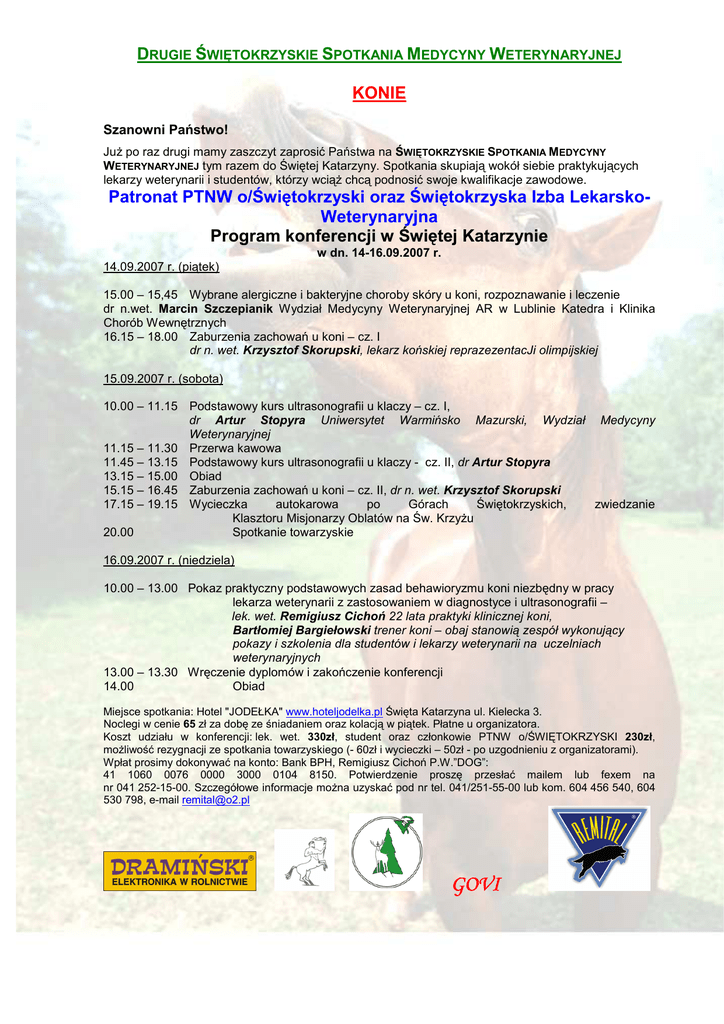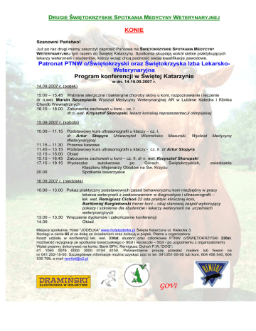 DRUGIE ŚWIĘTOKRZYSKIE SPOTKANIA MEDYCYNY WETERYNARYJNEJ KONIE Szanowni Państwo! JuŜ po raz drugi mamy zaszczyt zaprosić Państwa na ŚWIĘTOKRZYSKIE SPOTKANIA MEDYCYNY WETERYNARYJNEJ tym razem do Świętej Katarzyny. Spotkania skupiają wokół siebie praktykujących lekarzy weterynarii i studentów, którzy wciąŜ chcą podnosić swoje kwalifikacje zawodowe. Patronat PTNW o/Świętokrzyski oraz Świętokrzyska Izba LekarskoWeterynaryjna Program konferencji w Świętej Katarzynie w dn. 14-16.09.2007 r. 14.09.2007 r. (piątek) 15.00 – 15,45 Wybrane alergiczne i bakteryjne choroby skóry u koni, rozpoznawanie i leczenie dr n.wet. Marcin Szczepianik Wydział Medycyny Weterynaryjnej AR w Lublinie Katedra i Klinika Chorób Wewnętrznych 16.15 – 18.00 Zaburzenia zachowań u koni – cz. I dr n. wet. Krzysztof Skorupski, lekarz końskiej reprazezentacJi olimpijskiej 15.09.2007 r. (sobota) 10.00 – 11.15 Podstawowy kurs ultrasonografii u klaczy – cz. I, dr Artur Stopyra Uniwersytet Warmińsko Mazurski, Wydział Medycyny Weterynaryjnej 11.15 – 11.30 Przerwa kawowa 11.45 – 13.15 Podstawowy kurs ultrasonografii u klaczy - cz. II, dr Artur Stopyra 13.15 – 15.00 Obiad 15.15 – 16.45 Zaburzenia zachowań u koni – cz. II, dr n. wet. Krzysztof Skorupski 17.15 – 19.15 Wycieczka autokarowa po Górach Świętokrzyskich, zwiedzanie Klasztoru Misjonarzy Oblatów na Św. KrzyŜu 20.00 Spotkanie towarzyskie 16.09.2007 r. (niedziela) 10.00 – 13.00 Pokaz praktyczny podstawowych zasad behawioryzmu koni niezbędny w pracy lekarza weterynarii z zastosowaniem w diagnostyce i ultrasonografii – lek. wet. Remigiusz Cichoń 22 lata praktyki klinicznej koni, Bartłomiej Bargiełowski trener koni – obaj stanowią zespół wykonujący pokazy i szkolenia dla studentów i lekarzy weterynarii na uczelniach weterynaryjnych 13.00 – 13.30 Wręczenie dyplomów i zakończenie konferencji 14.00 Obiad Miejsce spotkania: Hotel "JODEŁKA" www.hoteljodelka.pl Święta Katarzyna ul. Kielecka 3. Noclegi w cenie 65 zł za dobę ze śniadaniem oraz kolacją w piątek. Płatne u organizatora. Koszt udziału w konferencji: lek. wet. 330zł, student oraz członkowie PTNW o/ŚWIĘTOKRZYSKI 230zł, moŜliwość rezygnacji ze spotkania towarzyskiego (- 60zł i wycieczki – 50zł - po uzgodnieniu z organizatorami). Wpłat prosimy dokonywać na konto: Bank BPH, Remigiusz Cichoń P.W.”DOG”: 41 1060 0076 0000 3000 0104 8150. Potwierdzenie proszę przesłać mailem lub fexem na nr 041 252-15-00. Szczegółowe informacje moŜna uzyskać pod nr tel. 041/251-55-00 lub kom. 604 456 540, 604 530 798, e-mail [email protected] GOVI