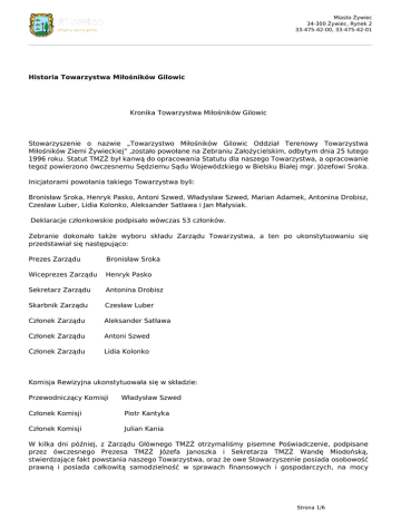 Miasto Żywiec 34-300 Żywiec, Rynek 2 33-475-42-00, 33-475-42-01 Historia Towarzystwa Miłośników Gilowic Kronika Towarzystwa Miłośników Gilowic Stowarzyszenie o nazwie „Towarzystwo Miłośników Gilowic Oddział Terenowy Towarzystwa Miłośników Ziemi Żywieckiej” ,zostało powołane na Zebraniu Założycielskim, odbytym dnia 25 lutego 1996 roku. Statut TMZŻ był kanwą do opracowania Statutu dla naszego Towarzystwa, a opracowanie tegoż powierzono ówczesnemu Sędziemu Sądu Wojewódzkiego w Bielsku Białej mgr. Józefowi Sroka. Inicjatorami powołania takiego Towarzystwa byli: Bronisław Sroka, Henryk Pasko, Antoni Szwed, Władysław Szwed, Marian Adamek, Antonina Drobisz, Czesław Luber, Lidia Kolonko, Aleksander Satława i Jan Małysiak. Deklaracje członkowskie podpisało wówczas 53 członków. Zebranie dokonało także wyboru składu Zarządu Towarzystwa, a ten po ukonstytuowaniu się przedstawiał się następująco: Prezes Zarządu Bronisław Sroka Wiceprezes Zarządu Henryk Pasko Sekretarz Zarządu Antonina Drobisz Skarbnik Zarządu Czesław Luber Członek Zarządu Aleksander Satława Członek Zarządu Antoni Szwed Członek Zarządu Lidia Kolonko Komisja Rewizyjna ukonstytuowała się w składzie: Przewodniczący Komisji Władysław Szwed Członek Komisji Piotr Kantyka Członek Komisji Julian Kania W kilka dni później, z Zarządu Głównego TMZŻ otrzymaliśmy pisemne Poświadczenie, podpisane przez ówczesnego Prezesa TMZŻ Józefa Janoszka i Sekretarza TMZŻ Wandę Miodońską, stwierdzające fakt powstania naszego Towarzystwa, oraz że owe Stowarzyszenie posiada osobowość prawną i posiada całkowitą samodzielność w sprawach finansowych i gospodarczych, na mocy Strona 1/6 Miasto Żywiec 34-300 Żywiec, Rynek 2 33-475-42-00, 33-475-42-01 zatwierdzonego Statutu. Towarzystwo Miłośników Gilowic zostało zarejestrowane najpierw w Sądzie Wojewódzkim w Bielsku Białej w Dziale A w Rejestrze Stowarzyszeń rej. A-6 w 1996 r. a następnie przerejestrowano Towarzystwo do nowo utworzonego Sądu Rejestrowego KRS także w Bielsku Białej w roku 2001 Nr. KRS 0000114620. Potwierdzony wydanym Postępowaniem z roku 2007. Towarzystwo nasze powstało z inicjatywy wcześniej założonego Zespołu Redakcyjnego którego zadaniem było opracowanie i wydanie drukiem „Monografii Gilowic”. Ponieważ Zespół ten nie dysponował środkami finansowymi na pokrycie tej edycji, koniecznym było ogłoszenie przedpłat dla potencjalnych nabywców tegoż opracowania. W tym celu Towarzystwo zgłosiło akces do Sądu Wojewódzkiego w Bielsku Białej i Banku Spółdzielczego w Gilowicach, celem utworzenia odpowiedniego konta na określony cel. Jednak w miarę upływu czasu włączyliśmy się w nurt zaangażowania społecznego, widząc potrzebę takich działań. Już w maju, skoordynowaliśmy uroczystość Dnia Strażaka ze Świętem Trzeciomajowym. Uczestniczyły w uroczystościach: OSP Gilowice wraz z orkiestrą, Zespoły Regionalne „Gilowianka” i „Gronicek, Koło Gospodyń Wiejskich, Członkowie TMG, GOK, i pracownicy Gminy, uświetniając je najpierw uroczystą Mszą Świętą koncelebrowaną w tutejszym kościele, po czym wszyscy uczestnicy uroczystości poprzedzani zwartym szeregiem strażaków udali się do lokalu GOK, gdzie odbyła się wspaniała jubileuszowa akademia, uświęcająca rocznicę uchwalenia Trzeciomajowej Konstytucji. Okolicznościowy referat wygłosił prof. Stanisław Sroka – Dyrektor Wydziału Historycznego Uniwersytetu Jagiellońskiego. Wieczorem, w obejściu strażnicy OSP odbył się festyn, na którym licznie zgromadziła się miejscowa ludność. Wiele uwagi poświęcaliśmy poszukiwaniu odpowiedniego wydawcy, celem wydruku opracowanej „Monografii”, kumulując równocześnie środki pieniężne na utworzonym koncie. Udało nam się to dopiero w 1999 roku, u prywatnego wydawcy w Raciborzu, ale ten nie w pełni wywiązał się z należytego wykonania zadania. Cierpliwie jednak oczekiwał na ratalne spłaty naszych zobowiązań. Nawiązaliśmy także ścisłą współpracę z macierzystym TMZŻ, uczestnicząc w każdym Zebraniu, korzystając z ich doświadczeń i bieżącego instruktarzu. Szczególnie ciepło traktowali nas członkowie Zarządu: Prezes Józef Janoszek, Pani Zofia Rączka, Pani Wanda Miodońska, a także i inni członkowie Towarzystwa. Na Zebraniu ogólnym w następnym, 1997 roku podjęliśmy uchwałę o gruntownym odnowieniu pięciu starych nagrobków istniejących na naszym cmentarzu, ludzi zasłużonych dla Gilowic. Dotyczyło to: najstarszego nagrobka, pochodzącego z 1895 roku, ufundowanego przez pierwszą nauczycielkę w naszej szkole, Klementynę Kunzekową dla swojej zmarłej matki, Marii Mynarskiej, pod którym spoczęła także ona sama w 1926 roku. Drugim była kamienna rzeźba anioła na nagrobku ks. Ludwika Olszańskiego, tutejszego ekspozyta, zmarłego w 1895 r. #℣佐⌡⌀渀愀最爀漀戀攀欀 稀 㤀 ㈀爀⌡⍃倣℣ ks. Proboszcza Franciszka Zajdy zm. W 1958 r., mogiły dwóch nieznanych mężczyzn, zastrzelonych przez hitlerowców w 1939 r. i nagrobka Stanisława Beriniego – powstańca z 1830 r. zmarłego w roku 1905. Na odnowienie przez nas tego ostatniego nagrobka nie wyraziła zgody rodzina. Pomimo, że wydatki związane z renowacją nadszarpnęły nasze finanse. Uznaliśmy jednak, że renowacja jest konieczna. Do wykonania tych prac zaangażowaliśmy miejscowego kamieniarza, Pana Bogusława Przeworczyka i ten z powierzonych prac wywiązał się należycie. W 1998 roku, mając na uwadze mizerne pojęcie o Historii Polski panujące szczególnie wśród młodzieży, a będące reliktem wybiórczego nauczania historii w okresie PRL, podjęliśmy inicjatywę zorganizowania cotygodniowych wieczornic, poświęconych tej właśnie tematyce. Na spektaklach Strona 2/6 Miasto Żywiec 34-300 Żywiec, Rynek 2 33-475-42-00, 33-475-42-01 gromadziło się sporo osób chcących nie tylko poznać zaszłości dziejo