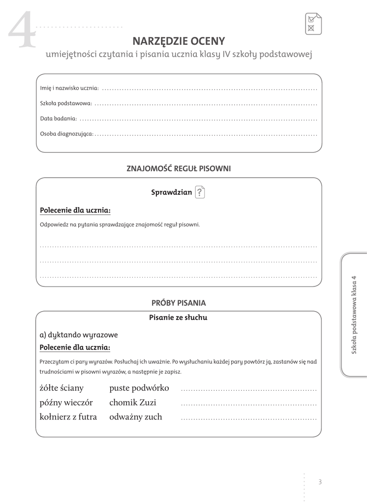 NARZĘDZIE OCENY umiejętności czytania i pisania ucznia klasy IV szkoły podstawowej Imię i nazwisko ucznia: . . . . . . . . . . . . . . . . . . . . . . . . . . . . . . . . . . . . . . . . . . . . . . . . . . . . . . . . . . . . . . . . . . . . . . . . . . . . . . . . . . . . . . . Szkoła podstawowa: . . . . . . . . . . . . . . . . . . . . . . . . . . . . . . . . . . . . . . . . . . . . . . . . . . . . . . . . . . . . . . . . . . . . . . . . . . . . . . . . . . . . . . . . . . Data badania: . . . . . . . . . . . . . . . . . . . . . . . . . . . . . . . . . . . . . . . . . . . . . . . . . . . . . . . . . . . . . . . . . . . . . . . . . . . . . . . . . . . . . . . . . . . . . . . . Osoba diagnozująca: . . . . . . . . . . . . . . . . . . . . . . . . . . . . . . . . . . . . . . . . . . . . . . . . . . . . . . . . . . . . . . . . . . . . . . . . . . . . . . . . . . . . . . . . . . ZNAJOMOŚĆ REGUŁ PISOWNI Sprawdzian Polecenie dla ucznia: 123 abc ? 123 abc Odpowiedz na pytania sprawdzające znajomość reguł pisowni. ................................................................................................................ ................................................................................................................ ................................................................................................................ Szkoła podstawowa klasa 4 4 PRÓBY PISANIA Pisanie ze słuchu a) dyktando wyrazowe Polecenie dla ucznia: Przeczytam ci pary wyrazów. Posłuchaj ich uważnie. Po wysłuchaniu każdej pary powtórz ją, zastanów się nad trudnościami w pisowni wyrazów, a następnie je zapisz. żółte ściany puste podwórko . . . . . . . . . . . . . . . . . . . . . . . . . . . . . . . . . . . . . . . . . . . . . . . . . . . . . . . późny wieczór chomik Zuzi . . . . . . . . . . . . . . . . . . . . . . . . . . . . . . . . . . . . . . . . . . . . . . . . . . . . . . . kołnierz z futra odważny zuch . . . . . . . . . . . . . . . . . . . . . . . . . . . . . . . . . . . . . . . . . . . . . . . . . . . . . . . 3 4 b) dyktando zdaniowe Polecenie dla ucznia: Posłuchaj uważnie tekstu. Nie staraj się zapamiętać go w całości. Za chwilę podyktuję ci po kolei pojedyncze zdania. Po wysłuchaniu każdego z nich powtórz je, zastanów się nad trudnościami w pisowni wyrazów, a następnie zapisz. Nie martw się, jeśli nie zapamiętasz całego zdania. Dłuższe zdania będę czytać cząstkami. Duży mróz Na dworze jest duży mróz. Temperatura spadła do minus dwunastu stopni. Nocą mróz jest jeszcze większy. Zza okna widok jest urzekający. Oszronione drzewa wyglądają bajecznie. Czapy śniegu otulają choinki. Mróz ozdobił okna niezwykłymi wzorami. Dobrze jest siedzieć w ciepłym domu. Gorzej, gdy trzeba opuścić domowe pielesze. ................................................................................................................ ................................................................................................................ ................................................................................................................ ................................................................................................................ ? Szkoła podstawowa klasa 4 123 Pisanie z pamięci abc 123 abc 2a Polecenia dla ucznia: 1. Przeczytaj tekst. O czym jest w nim mowa? 2. Przyjrzyj się uważnie zdaniu. Zapamiętaj je, a następnie zapisz to zdanie. Postępuj w ten sam sposób z kolejnymi zdaniami. Szybka pomoc Późnym popołudniem odebrałem telefon. Dzwonił mój przyjaciel Przemek. Wydawało się, że płacze, więc się przestraszyłem. Okazało się, że Przemek miał gorączkę i ostry ból gardła. Był sam w domu. Poprosiłem mamę o pomoc. Jest pielęgniarką. Mój przyjaciel potrzebował fachowej pomocy. ................................................................................................................ ................................................................................................................ ................................................................................................................ ................................................................................................................ 4 4 ? 123 Przepisywanie abc 123 abc 2a Polecenie dla ucznia: Przepisz uważnie tekst. Postaraj się nie zrobić żadnego błędu. Awaria ogrzewania Z powodu awarii ogrzewania jutro lekcje zostaną skrócone. W klasie zapanowała radość. Być może przepadnie zaplanowana kartkówka z matematyki. Będzie więcej czasu na powtórkę materiału. Tylko klasowa prymuska jest rozczarowana. Ona zawsze jest przygotowana do sprawdzianu. A przecież sprawdzian i tak się odbędzie. Może tylko nieco później. ................................................................................................................ ................................................................................................................ ................................................................................................................ ................................................................................................................ Szkoła podstawowa klasa 4 ................................................................................................................ Pisanie samodzielne na zadany temat Przykładowe tematy do pisania samodzielnego: Przepisz uważnie tekst. Postaraj się nie zrobić żadnego błędu. Napisz, dlaczego lubisz swojego nauczyciela (swoją nauczycielkę). Napisz i uzasadnij, która dyscyplina sportowa najbardziej ci się podoba. Opisz szczególnie radosny dla ciebie dzień. Opisz pokój, w którym spędzasz najwięcej czasu. Napisz, kto i dlaczego jest dla ciebie ważną osobą. Opisz swojego kolegę (swoją koleżankę) z ławki. .....................................................................................