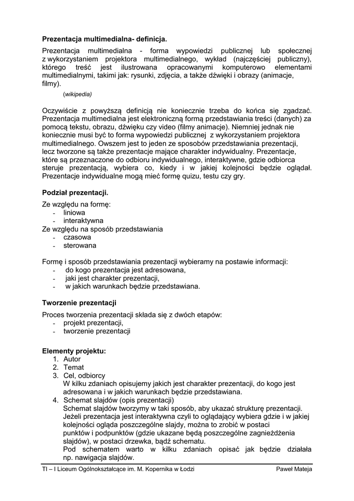 Prezentacja multimedialna- definicja. Prezentacja multimedialna - forma wypowiedzi publicznej lub społecznej z wykorzystaniem projektora multimedialnego, wykład (najczęściej publiczny), którego treść jest ilustrowana opracowanymi komputerowo elementami multimedialnymi, takimi jak: rysunki, zdjęcia, a także dźwięki i obrazy (animacje, filmy). (wikipedia) Oczywiście z powyższą definicją nie koniecznie trzeba do końca się zgadzać. Prezentacja multimedialna jest elektroniczną formą przedstawiania treści (danych) za pomocą tekstu, obrazu, dźwięku czy video (filmy animacje). Niemniej jednak nie koniecznie musi być to forma wypowiedzi publicznej z wykorzystaniem projektora multimedialnego. Owszem jest to jeden ze sposobów przedstawiania prezentacji, lecz tworzone są także prezentacje mające charakter indywidualny. Prezentacje, które są przeznaczone do odbioru indywidualnego, interaktywne, gdzie odbiorca steruje prezentacją, wybiera co, kiedy i w jakiej kolejności będzie oglądał. Prezentacje indywidualne mogą mieć formę quizu, testu czy gry. Podział prezentacji. Ze względu na formę: - liniowa - interaktywna Ze względu na sposób przedstawiania - czasowa - sterowana Formę i sposób przedstawiania prezentacji wybieramy na postawie informacji: - do kogo prezentacja jest adresowana, - jaki jest charakter prezentacji, - w jakich warunkach będzie przedstawiana. Tworzenie prezentacji Proces tworzenia prezentacji składa się z dwóch etapów: - projekt prezentacji, - tworzenie prezentacji Elementy projektu: 1. Autor 2. Temat 3. Cel, odbiorcy W kilku zdaniach opisujemy jakich jest charakter prezentacji, do kogo jest adresowana i w jakich warunkach będzie przedstawiana. 4. Schemat slajdów (opis prezentacji) Schemat slajdów tworzymy w taki sposób, aby ukazać strukturę prezentacji. Jeżeli prezentacja jest interaktywna czyli to oglądający wybiera gdzie i w jakiej kolejności ogląda poszczególne slajdy, można to zrobić w postaci punktów i podpunktów (gdzie ukazane będą poszczególne zagnieżdżenia slajdów), w postaci drzewka, bądź schematu. Pod schematem warto w kilku zdaniach opisać jak będzie działała np. nawigacja slajdów. TI – I Liceum Ogólnokształcące im. M. Kopernika w Łodzi Paweł Mateja Jeżeli prezentacja jest prezentacją liniową, opisujemy grupy slajdów np..: slajd 1 – tytuł Prezentacji, slajd 2 – dane kontaktowe, grupa slajdów (3-6) opis profili klas, grupa slajdów (7-10) zdjęcia przedstawiające zajęcia … itp.. Prezentacja – wytyczne Do oceny oddajemy pliki: 1. Plik w dowolnym formacie tekstowym zawierający projekt prezentacji (np. nazwiskoGrupa.txt lub nazwiskoGrupa.doc ) 2. Prezentację multimedialną, która: a) przedstawia naszą Szkołę b) zawiera minimum 15 slajdów c) jest multimedialna (zawiera tekst, grafikę, może zawierać dźwięk czy animację) d) jest interaktywna (czyli sterowana przez osobę oglądającą tzn. zawiera przyciski nawigacyjne, menu) lub jest prezentacją liniową czasową lub liniową sterowaną e) ma rozmiar nie większy niż 10 MB TI – I Liceum Ogólnokształcące im. M. Kopernika w Łodzi Paweł Mateja