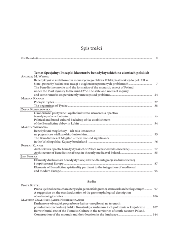 Spis treści Od Redakcji........................................................................................................................................................ 5 Temat Specjalny: Początki klasztorów benedyktyńskich na ziemiach polskich Andrzej M. Wyrwa Benedyktyni w kształtowaniu monastycznego oblicza Polski piastowskiej do poł. XII w. Stan i potrzeby badań oraz uwagi o ciągle nierozpoznanych problemach............................... The Benedictine monks and the formation of the monastic aspect of Poland under the Piast dynasty to the mid-12th c. The state and needs of inquiry and some remarks on persistently unrecognised problems........................................................ Marian Kanior Początki Tyńca.................................................................................................................................. The beginnings of Tyniec................................................................................................................ Zofia Kurnatowska Okoliczności polityczne i ogólnokulturowe utworzenia opactwa benedyktynów w Lubiniu................................................................................................................ Political and broad cultural backdrop of the establishment of the Benedictine abbey in Lubiń ................................................................................................ Marcin Wiewióra Benedyktyni mogileńscy – ich rola i znaczenie na pograniczu wielkopolsko-kujawskim....................................................................................... The Benedictines of Mogilno – their role and significance in the Wielkopolska-Kujawy borderland ..................................................................................... Robert Kunkel Architektura opactw benedyktyńskich w Polsce wczesnośredniowiecznej.............................. Architecture of Benedictine abbeys in the early mediaeval Poland........................................... Jan Bereza Elementy duchowości benedyktyńskiej istotne dla integracji średniowiecznej i współczesnej Europy...................................................................................................................... Elements of Benedictine spirituality pertinent to the integration of mediaeval and modern Europe.......................................................................................................................... Studia Piotr Kittel Próba ujednolicenia charakterystyki geomorfologicznej stanowisk archeologicznych.......... A suggestion on the standardusation of the geomorphological description of archaeological sites ..................................................................................................................... Mateusz Cwaliński, Jakub Niebieszczański Kurhanowy obrządek pogrzebowy kultury mogiłowej na terenach południowo-zachodniej Polski. Konstrukcja kurhanów i ich położenie w krajobrazie......... Barrow burial rite of the Tumulus Culture in the territories of south-western Poland. Construction of the mounds and their location in the landscape............................................. 7 24 27 38 39 54 55 76 77 85 87 95 97 106 107 144 Materiały Magdalena Stasiak Topory kamienne kultury ceramiki sznurowej z międzyrzecza Gwdy i Łobżonki. Przyczynek do badań nad rozpoznaniem osadnictwa ludności kultury ceramiki sznurowej w Krajnie........................................................................................................ Stone shaft-hole axes of Corded Ware culture from the area between Gwda and Łobżonka rivers. A note on the research into the reconnaissance of Corded Ware settlement in Pojezierze Krajeńskie................................................................... Janusz Czebreszuk, Mateusz Jaeger, Łukasz Pospieszny, Mateusz Cwaliński, Jakub Niebieszczański, Mateusz Stróżyk Modelowe badania nieinwazyjne obszarów leśnych – Las Krotoszyn. Z badań nad przemianami krajobrazu kulturowego w pradziejach Wielkopolski................................. Exemplary non-invasive survey of forest areas – Krotoszyn Forest. Study of cultural landscape transformations in the prehistory of Wielkopolska (Great Poland)........................ Jacek Gackowski, Grzegorz Osipowicz Przedmioty krzemienne z osady obronnej ludności kultury łużyckiej w Mirakowie-Grodnie (stanowisko 6), pow. toruński................................................................. Flint objects from the Lusatian culture stronghold in Mirakowo-Grodno (site 6), Toruń powiat................................................................................ Urszula Narożna-Szamałek Skarb ozdób z Podbieli, pow. otwocki........................................................................................... The jewellery hoard from Podbiel, Otwock powiat..................................................................... Aldona Kurzawska Muszle porcelanek w skarbie ozdób z Podbieli, pow. otwocki................................................... Cowrie shells in the jewellery hoard from Podbiel, Otwock powiat......................................... Małgorzata Mrozek-Wysocka Analiza petrograficzna i chemiczna paciorków z Podbieli, pow. otwocki................................ Petrographic and chemical analysis of beads from Podbiel, Otwock powiat........................... Paweł Pawlak “Byłem we wnętrzu, wszystko obejrzałem”. Obłaczkowo – od neolitycznych osadników po średniowieczną wieś............................................................................................... ”I myself was inside there, and saw all.” Obłaczkowo – from Neolithic settlers to a medieaval village....................................................................................................................... 145 149 157 175 177 191 193 211 213 220 223 224 231 302 Varia Robert Rogal Metodyczne aspekty transferu profili glebowych w rez