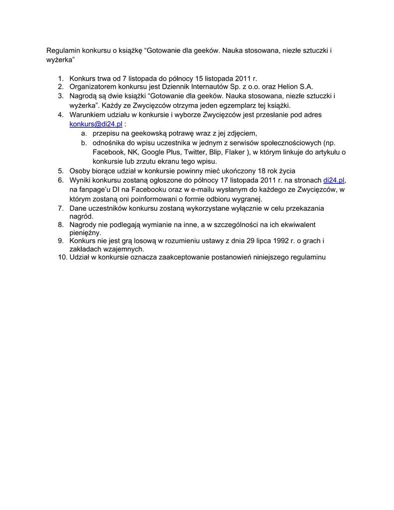 Regulamin konkursu o książkę “Gotowanie dla geeków. Nauka stosowana, niezłe sztuczki i wyżerka” 1. Konkurs trwa od 7 listopada do północy 15 listopada 2011 r. 2. Organizatorem konkursu jest Dziennik Internautów Sp. z o.o. oraz Helion S.A. 3. Nagrodą są dwie książki “Gotowanie dla geeków. Nauka stosowana, niezłe sztuczki i wyżerka”. Każdy ze Zwycięzców otrzyma jeden egzemplarz tej książki. 4. Warunkiem udziału w konkursie i wyborze Zwycięzców jest przesłanie pod adres [email protected] : a. przepisu na geekowską potrawę wraz z jej zdjęciem, b. odnośnika do wpisu uczestnika w jednym z serwisów społecznościowych (np. Facebook, NK, Google Plus, Twitter, Blip, Flaker ), w którym linkuje do artykułu o konkursie lub zrzutu ekranu tego wpisu. 5. Osoby biorące udział w konkursie powinny mieć ukończony 18 rok życia 6. Wyniki konkursu zostaną ogłoszone do północy 17 listopada 2011 r. na stronach di24.pl, na fanpage’u DI na Facebooku oraz w e-mailu wysłanym do każdego ze Zwycięzców, w którym zostaną oni poinformowani o formie odbioru wygranej. 7. Dane uczestników konkursu zostaną wykorzystane wyłącznie w celu przekazania nagród. 8. Nagrody nie podlegają wymianie na inne, a w szczególności na ich ekwiwalent pieniężny. 9. Konkurs nie jest grą losową w rozumieniu ustawy z dnia 29 lipca 1992 r. o grach i zakładach wzajemnych. 10. Udział w konkursie oznacza zaakceptowanie postanowień niniejszego regulaminu