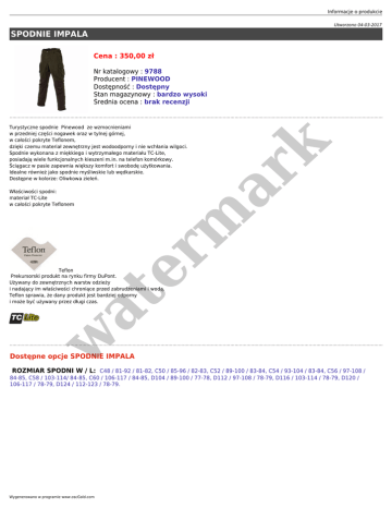 Informacje o produkcie Utworzono 04-03-2017 SPODNIE IMPALA Cena : 350,00 zł Nr katalogowy : 9788 Producent : PINEWOOD Dostępność : Dostępny Stan magazynowy : bardzo wysoki Średnia ocena : brak recenzji Właściwości spodni: materiał TC-Lite w całości pokryte Teflonem er m ar k Turystyczne spodnie Pinewood ze wzmocnieniami w przedniej części nogawek oraz w tylnej górnej, w całości pokryte Teflonem, dzięki czemu materiał zewnętrzny jest wodoodporny i nie wchłania wilgoci. Spodnie wykonana z miękkiego i wytrzymałego materiału TC-Lite, posiadają wiele funkcjonalnych kieszeni m.in. na telefon komórkowy. Ściągacz w pasie zapewnia większy komfort i swobodę użytkowania. Idealne również jako spodnie myśliwskie lub wędkarskie. Dostępne w kolorze: Oliwkowa zieleń. w at Teflon Prekursorski produkt na rynku firmy DuPont. Używany do zewnętrznych warstw odzieży i nadający im właściwości chroniące przed zabrudzeniami i wodą. Teflon sprawia, że dany produkt jest bardziej odporny i może być używany przez długi czas. Dostępne opcje SPODNIE IMPALA ROZMIAR SPODNI W / L: C48 / 81-92 / 81-82, C50 / 85-96 / 82-83, C52 / 89-100 / 83-84, C54 / 93-104 / 83-84, C56 / 97-108 / 84-85, C58 / 103-114/ 84-85, C60 / 106-117 / 84-85, D104 / 89-100 / 77-78, D112 / 97-108 / 78-79, D116 / 103-114 / 78-79, D120 / 106-117 / 78-79, D124 / 112-123 / 78-79. Wygenerowano w programie www.oscGold.com