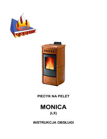 PIECYK NA PELET MONICA (LX) INSTRUKCJA OBSŁUGI Szanowni Państwo, Dziękujemy za wybór nowoczesnego piecyka naszej dopracowany technologicznie produkt. produkcji. Dostarczamy Państwu Na następnych stronach zamieszczamy instrukcje i wskazówki umoŜliwiające poznanie i uŜytkowanie naszego piecyka w najlepszy sposób, jak równieŜ jego utrzymanie w naleŜytym stanie. Nasz autoryzowany serwis techniczny pozostaje do Państwa dyspozycji. Z powaŜaniem Karmek S.R.L. WAśNE: Karmek zastrzega sobie wprowadzanie mało istotnych zmian w budowie piecyka, które mogą nie zostać odnotowane w niniejszej instrukcji. Sporadycznie pojawiające się zmiany spowodowane są normalnymi uaktualnieniami sezonowymi produktów. 2 A. INFORMACJE PODSTAWOWE a.1 Podstawowe zasady bezpieczeństwa a.2 Dane techniczne a.3 WyposaŜenie dodatkowe a.4 Tabliczka znamionowa a.5 Gwarancja a.6 Paliwo a.7 Zamawianie części zamiennych a.8 ZuŜyte materiały B. INSTRUKCJA INSTALACJI b.1 Uwagi wstępne b.2 Przemieszczanie i transport b.3 Umiejscowienie b.4 Instalacja przewodu kominowego b.5 Instalacja przewodu poboru powietrza b.6 Podłączenie do zasilania elektrycznego C. INSTRUKCJA OBSŁUGI c.1 Uwagi wstępne c.2 Wprowadzenie c.3 Wyświetlacz c.4 Pierwsze rozpalenie piecyka c.5 Uruchomienie piecyka c.6 Ustawienie temperatury w pomieszczeniu c.7 Wyłączenie piecyka c.8 Zdalne sterowanie c.9 Ustawianie automatycznego rozpalenia (chronotermostat) c.10 Zmienność podawania peletu D. FUNKCJE ELEMENTÓW MECHANICZNYCH I ELEKTRYCZNYCH d.1 Napęd podajnika ślimakowego d.2 Wentylator odciągowy spalin d.3 Wentylator nawiewu ciepłego powietrza d.4 Karta elektroniczna d.5 Wyłącznik główny 3 d.6 Czujnik spalin d.7 Czujnik pokojowy d.8 Świeca zapłonowa d.9 Wyłącznik termiczny E. PODSTAWOWA OBSŁUGA I CZYSZCZENIE PIECYKA e.1 Obsługa i czyszczenie piecyka przez klienta e.2 Obsługa okresowa wykonywana przez autoryzowany personel F. WYŚWIETLANIE SYMBOLI ALARMÓW f.1 Awaria czujnika temperatury spalin f.2 Nieudane rozpalenie f.3 Wyłączanie podczas pracy f.4 Awaria zasilania f.5 Awaria wyłącznika termicznego f.6 Temperatura spalin przekracza maksymalną wartość G. ROZWIĄZANIA MOśLIWYCH PROBLEMÓW 4 A. INFORMACJE PODSTAWOWE a.1 Podstawowe zasady bezpieczeństwa UWAGA!!! Nigdy nie jest się zbyt ostroŜnym: przed instalacją zapoznać się i stosować z podstawowymi zasadami: ● Wszystkie obowiązujące lokalnie przepisy, włączając krajowe i europejskie przepisy prawa , muszą być przestrzegane podczas instalacji piecyka. ● Sprawdzić, czy system elektryczny i zasilanie główne jest w stanie zapewnić zasilanie dla piecyka przy maksymalnym poborze energii, wskazanym na tabliczce. Podłączyć piecyk do zgodnego z normami zasilania 230 V - 50 Hz. Unikać uŜywania przejściówek, przedłuŜaczy lub rozdzielaczy. Upewnić się, Ŝe system elektryczny wyposaŜony jest w zgodne z normami uziemienie i wyłącznik róŜnicowy. ● W trakcie instalacji naleŜy respektować obowiązujące przepisy dotyczące wydalania spalin przez przewody kominowe. Zaleca się podłączyć piecyk do przewodu kominowego za pomocą łatwego do sprawdzenia podłączenia. Przypominamy, Ŝe naleŜy zwrócić się do autoryzowanej obsługi technicznej w celu instalacji i okresowych przeglądów piecyka, aby sprawdzić poprawność ciągu kominowego przed i po sezonie grzewczym. ● JeŜeli piecyk uŜywany jest sezonowo, w przypadku nieprawidłowego ciągu lub niesprzyjających warunkach pogodowych (temperatura niŜsza niŜ 0ºC), sprawdzić czy przewód kominowy jest idealnie osłonięty i droŜny aby uniknąć jego zamarznięcia i niebezpieczeństwa cofania spalin. ● W przypadku zapłonu wewnątrz komina, natychmiast wyłączyć piecyk. ● Piecyk zuŜywa tyle powietrza, ile jest konieczne do procesu spalania; zalecane jest podłączenie piecyka do poboru powietrza z zewnątrz, odpowiednią rurą, poprzez specjalne wyjście z tyłu piecyka. ● Przed instalacją upewnić się, czy podłoŜe wytrzyma nacisk piecyka, biorąc pod uwagę jego wagę. ● JeŜeli podłoŜe piecyka jest wykonane z materiałów łatwopalnych, takich jak parkiet lub wykładzina, umieścić pod piecykiem płytę ochronną (płyta powinna wystawać 25-30 cm od przodu piecyka). ● Dla własnego bezpieczeństwa zaleca się zachować odległość przynajmniej 20 cm między rozgrzanymi częściami piecyka a materiałami łatwopalnymi (np. tapety itp.); w innym wypadku 5 zastosować materiały izolacyjne dostępne w sprzedaŜy. Odnieść tą wskazówkę równieŜ do mebli, zasłon itp. • W celu ułatwienia ewentualnych interwencji przez personel techniczny, nie umieszczać piecyka wewnątrz zamkniętych przestrzeni oraz tuŜ przy ścianach, co moŜe równieŜ zakłócić pobór powietrza. • Brak ciągu kominowego (lub zatkanie albo zamknięcie dopływu powietrza do paleniska) zakłóca funkcjonowanie piecyka, który podczas automatycznego włączenia, moŜe wymusić nadmierne podawanie peletu do paleniska, w związku z opóźnionym zapłonem. Nadmierne zadymienie w komorze spalania moŜe spowodować automatyczne wydzielanie oparów (gazu), i gwałtowne spalanie; w tym przypadku nigdy nie otwierać drzwi komory spalania. • Całkowicie zabrania się uŜywanie cieczy łatwopalnych do rozpalania piecyka; po włączeniu piecyka pelet zapala się automatycznie. • Pelet uŜywany w piecyku musi spełniać warunki opisane w niniejszej instrukcji. • Nie dotykać szyby kiedy piecyk się rozgrzeje; zachować ostroŜność dotykając piecyk. • Nie dopuszczać dzieci w pobliŜe piecyka kiedy jest on włączony, poniewaŜ kaŜda rozgrzana powierzchnia moŜe spowodować oparzenia. • Nie podejmować Ŝadnych interwencji, poza tymi przewidzianymi do utrzymania prawidłowego funkcjonowania piecyka lub zalecanymi w niniejszej instrukcji w celu rozwiązania pojawiających się problemów. W kaŜdym przypadku zawsze odłączać piecyk od zasilania przed podjęciem interwe