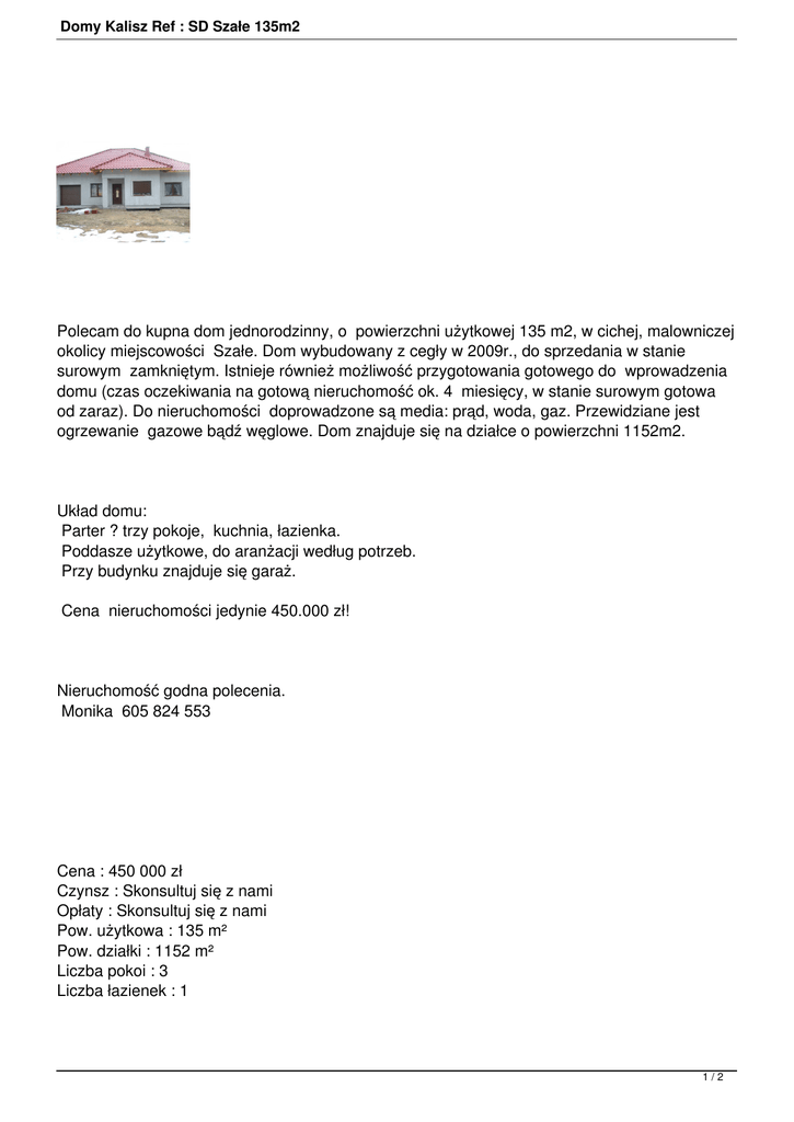Domy Kalisz Ref : SD Szałe 135m2 Polecam do kupna dom jednorodzinny, o powierzchni użytkowej 135 m2, w cichej, malowniczej okolicy miejscowości Szałe. Dom wybudowany z cegły w 2009r., do sprzedania w stanie surowym zamkniętym. Istnieje również możliwość przygotowania gotowego do wprowadzenia domu (czas oczekiwania na gotową nieruchomość ok. 4 miesięcy, w stanie surowym gotowa od zaraz). Do nieruchomości doprowadzone są media: prąd, woda, gaz. Przewidziane jest ogrzewanie gazowe bądź węglowe. Dom znajduje się na działce o powierzchni 1152m2. Układ domu: Parter ? trzy pokoje, kuchnia, łazienka. Poddasze użytkowe, do aranżacji według potrzeb. Przy budynku znajduje się garaż. Cena nieruchomości jedynie 450.000 zł! Nieruchomość godna polecenia. Monika 605 824 553 Cena : 450 000 zł Czynsz : Skonsultuj się z nami Opłaty : Skonsultuj się z nami Pow. użytkowa : 135 m² Pow. działki : 1152 m² Liczba pokoi : 3 Liczba łazienek : 1 1/2 Domy Kalisz Ref : SD Szałe 135m2 Adres : Szałe, 62-800 KALISZ http://destino.org.pl/index.php?view=properties&id=184%3Asd-szae-135m2&option=com_jea 2/2