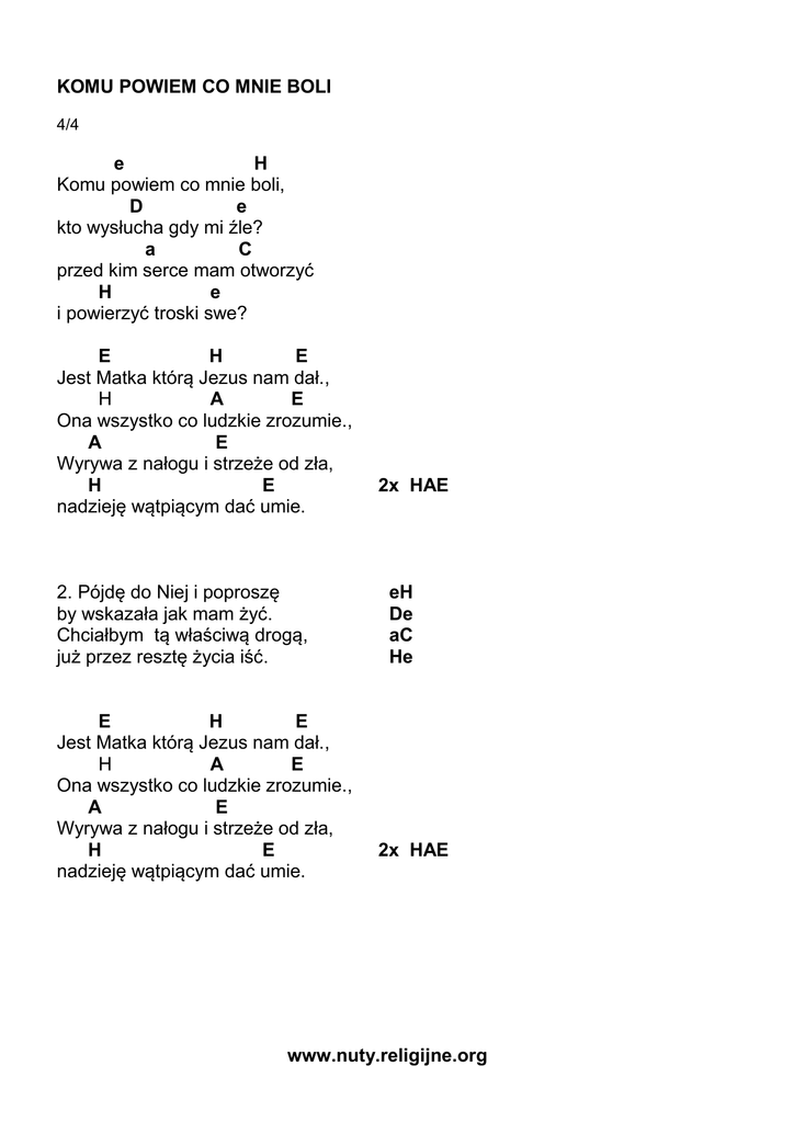 KOMU POWIEM CO MNIE BOLI 4/4 e H Komu powiem co mnie boli, D e kto wysłucha gdy mi źle? a C przed kim serce mam otworzyć H e i powierzyć troski swe? E H E Jest Matka którą Jezus nam dał., H A E Ona wszystko co ludzkie zrozumie., A E Wyrywa z nałogu i strzeże od zła, H E nadzieję wątpiącym dać umie. 2. Pójdę do Niej i poproszę by wskazała jak mam żyć. Chciałbym tą właściwą drogą, już przez resztę życia iść. E H E Jest Matka którą Jezus nam dał., H A E Ona wszystko co ludzkie zrozumie., A E Wyrywa z nałogu i strzeże od zła, H E nadzieję wątpiącym dać umie. 2x HAE eH De aC He 2x HAE www.nuty.religijne.org