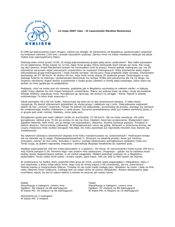 12 maja 2007 roku - II Leszczyński Maraton Rowerowy II LMR był jednocześnie moim drugim. Ładnie się zbiegło. W odróżnieniu od Bogdańca, postanowiłem pojechać na krótszym odcinku (100 km) i przede wszystkim szybciej. Oprócz mnie na trasie maratonu melduje się także Tadek oraz zaprzyjaźniony Siłacz. Startuję kilka minut przed 10.00. W mojej pięcioosobowej grupie jadą same „kolarzówki”. Bez walki pozwalam im na odjechanie. Mniej więcej na 12 km, łapie mnie grupa, która startowała dwie minuty po mnie. Nie czuję się zbyt pewnie. Przed Maratonem prawie nie trenowałem (ech ta praca). Powoli jednak rozkręcam się i na 20 kilometrze zaczynam mijać pierwszych uczestników na rowerach trekingowych. Kilka kilometrów dalej mijam kilkuosobową grupę trekingowców i moje morale wzrasta. Od tej pory moja prędkość stale wzrasta, momentami dochodząc do 37-38 km/h. W okolicy 40 km, mija mnie mniej więcej 20 osobowa grupa. Dostrzegam w niej jednego kolarza na trekingu i postanawiam dotrzymać mu tempa. Próba jest pozytywna ale nie na długo. Ku mojemu zdziwieniu mijam dwóch uczestników z mojej grupy (defekt) a chwilę dalej kolejnego, który stara się jechać za mną (gubię go na podjeździe). Podjazdy, choć na trasie jest ich niewiele, podobnie jak w Bogdańcu wychodzą mi całkiem nieźle i w dalszej części trasy właśnie na nich mijam kolejnych uczestników. Mamy już połowę trasy za sobą i czuję się świetnie. Dźwięk telefonu zaskakuje mnie. Początkowo go ignoruję, ale dzwoni na okrągło - Klient. Nawet w sobotę wydzwaniają. To istny brak szacunku ☺ Jakoś pomiędzy 55 a 60 km bufet. Zatrzymuje się tylko po to aby przechwycić banana. Z całej reszty rezygnuję. Po dwóch kilometrach dojeżdżam do dużej grupy i zabieram się z nimi. Zdecydowana większość jedzie na tzw. „innych” rowerach. Tempo mi jednak nie odpowiada i przechodzę do przodu, starając się zachęcić do zwiększonego wysiłku chłopaków z czoła grupy. Szczerze powiedziawszy dość już miałem samotnej jazdy, a w grupie pod wiatr raźniej. Niestety, znów jadę sam. Początkowo jazda pod wiatr całkiem nieźle mi wychodziła. 27-28 km/h. Jak na mnie rewelacja. Ale tylko początkowo. Gdzieś przy 70 km po prostu mi się nie chce. Deptam nieco bez przekonania. Wyłączyłem mp3. Zjadłem batoniki. Nikt mnie, ani ja nikogo nie wyprzedzam. Sielanka. Szybka lustracja pejzaży. Przejazd w lekkim deszczu. Od turystyka (sielanka). W Włoszakowicach nieco się gubię. Skręcam w przeciwną stronę, ale czujny miejscowy kibic szybko koryguje mój błąd. Do mety pozostaje już naprawdę niewiele więc staram się zmobilizować. Na ostatnich dziesięciu kilometrach dopada mnie kilku maratończyków na „kolarzówkach”. Podkręcam tempo ale na niewiele się to zdaje. Pojeeeeeeeeeeeeechali ☺. Skręcam na ostatnią prostą i teraz już niesiony emocjami „mknę” do linii mety. Schodzę z roweru i zostaje obdarowany pamiątkowym medalem (miło mi). Teraz czuję, że jestem naprawdę zmęczony i potrzebuję długiego kwadransa by uspokoić puls. Według organizatorów 100 km trasę pokonałem w 3 godziny i 39 minut. W rzeczywistości trasa liczyła 105 km a mój licznik pokazał 3:34. Pomimo tego i tak jestem mile zaskoczony. Progresja – gdyby nie ta sielanka może byłoby lepiej. Najważniejsze jednak, iż cel został osiągnięty. Miałem pojechać szybciej niż w Bogdańcu pojechałem. Teraz czeka mnie Łobez i trudny wybór, jaka trasa: 100 czy 200 (o 400 nawet nie marze). W oczekiwaniu na Tadka, który pojechał kilka grup po mnie, ucinam sobie pogawędkę z chłopakiem, który z nim startował, a który mijał także mnie. Jego czas to mniej więcej 2:56 (marzenie), ale na „kolarzówce”. Później kawka w towarzystwie Siłacza. Troszkę mi się nudzi kiedy zostaję sam. Wsiadam na rower i jadę na linie mety obejrzeć finisz Tadeusza. Czekają tam na niego córka ze swoim chłopakiem. Razem oklaskujemy jego triumfalny wjazd, bo był to udany debiut a ochota na jeszcze jak widzę rośnie. Radek Klasyfikacja w kategorii: rowery inne Ogółem: 38 miejsce na 88 startujących W klasie M3: 10 miejsce na 26 startujących Generalnie po 3 wyścigach W klasie M3: 5 miejsce Tadek Klasyfikacja w kategorii: rowery inne Ogółem: 67 miejsce na 88 startujących W klasie M5: 6 miejsce na 15 startujących