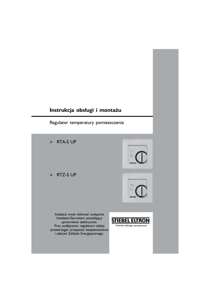 Instrukcja obsługi i montażu Regulator temperatury pomieszczenia ¾ RTA-S UP ¾ RTZ-S UP Instalacji może dokonać wyłącznie Instalator/Serwisant posiadający uprawnienia elektryczne. Przy podłączaniu regulatora należy przestrzegać przepisów bezpieczeństwa i zaleceń Zakładu Energetycznego. www.stiebel-eltron.com.pl Technika dobrego samopoczucia KOREKTA RTA-S UP / RTZ_S UP 1 ZAKRAES STOSOWANIA / MIEJSCE MONTAŻU Regulator może zostać uruchomiony dopiero po upewnieniu się, że cała instalacja elektryczna została wykonana zgodnie z obowiązującymi przepisami dotyczącymi bezpieczeństwa. Gwarancja na regulator zostaje udzielona jedynie w przypadku jeżeli został on zainstalowany zgodnie z niniejszą instrukcją i obowiązującymi przepisami instalacyjnymi. Nie wolno przekraczać dopuszczalnej wilgotności względnej wynoszącej 95%. Należy unikać roszenia. Podczas uruchomienia regulatora temperatury pomieszczenia należy zwrócić uwagę, iż termobimetal potrzebuje określoną ilość czasu dla dostosowania się do temperatury pomieszczenia. Z tego powodu bezpośrednio po montażu lub wyłączeniu obniżenia nocnego temperatura załączenia będzie odbiegała od temperatury pomieszczenia. Dokładność załączania osiągana jest dopiero po ok. 1 - 2 godzin pracy. Dla szybkiego nagrzewania początkowego i skrócenia czasu wyrównania temperatur zalecane jest więc nastawianie temperatury wyższej niż żądana. Po osiągnięciu temperatury nastawa może zostać ponownie skorygowana. 1 Zakres stosowania Regulator temperatury pomieszczenia służy do regulacji temperatury w zamkniętych pomieszczeniach jak pomieszczenia mieszkalne, szkoły, sale, warsztaty itp. o normalnym otoczeniu. 2. Miejsce montażu Należy preferować instalację regulatora na ścianie wewnętrznej, naprzeciw źródła ciepła. Grzejnik Grzejnik Regulator temperatury pomieszczenia 2 RTA-S UP / RTZ-S UP KOREKTA www.stiebel-eltron.com.pl MONTAŻ ¾ Wysokość montażowa: ok. 1,5 m nad podłogą ¾ Unikać ścian zewnętrznych oraz przeciągów pochodzących od okien i drzwi ¾ Należy zwrócić uwagę, aby powietrze pomieszczenia docierało bez ograniczeń do regulatora na zasadzie konwekcji. W związku z tym regulator nie może być montowany za zasłonami lub podobnymi przedmiotami ograniczającymi swobodny przepływ powietrza. ¾ Ciepło pochodzące z innych źródeł ma znaczący wpływ na dokładność regulacji Z powyższego powodu należy unikać: bezpośredniego nasłonecznienia, bliskości telewizorów, urządzeń grzewczych, lamp, kominków i rur instalacji grzewczych. ¾ Również regulator przyciemniający oświetlenie również wytwarza ciepło. Jeżeli więc regulator temperatury montowany jest we wspólnej ramce ze ściemniaczem, to odstęp pomiędzy obydwoma urządzeniami powinien być jak największy. W przypadku montowania jeden nad drugim, regulator musi być montowany pod ściemniaczem. 3. Montaż W elektrycznej puszce podtynkowej o średnicy 55 mm. Uwaga! Regulator należy montować zawsze na tapecie, przy pomocy jego pierścienia nośnego. a) zdjąć pokrywę obudowy. Zdjąć pokrętło regulacji. Odkręcić śrubę pokrywy. Zdjąć pokrywę. b) podłączenie elektryczne: zgodnie ze schematem elektrycznym, przewodem o polu przekroju 1 do 2,5 mm2. Przewód ochronny nie jest konieczny. Przy zachowaniu odpowiednich wymagań montażu możliwe jest osiągnięcie klasy bezpieczeństwa II. c) Zamontować regulator w elektrycznej puszce podtynkowej d) Założyć pokrywę obudowy. W tym celu zatrzasnąć pokrywę obudowy z lewej strony u góry. e) Dalej postępować jak w punkcie a) jednakże w odwrotnej kolejności. 3.1 2 3 Skala służąca do nastaw temperatury = ok. 5OC = ok. 10OC = ok. 15OC www.stiebel-eltron.com.pl 5 6 = ok. 20OC = ok. 25OC = ok. 30OC KOREKTA RTA-S UP / RTZ_S UP 3 MONTAŻ / OGRANICZENIE ZAKRESU NASTAW TEMPERATUR 3.2 Objaśnienie znaków L N = przewód zewnętrzny (faza) = przewód środkowy (neutralny) = podłączenie programatora do obniżenia temperatury RF = opornik do termicznego sygnału zwrotnego TA = opornik do obniżania temperatury np. noc Dioda czerwona: podłączona sieć Dioda czerwona: regulator żąda ciepła Dioda zielona: włączone obniżenie temperatury 3.3 Podłączenie obciążenia = grzanie = ogrzewanie dodatkowe = chłodzenie 3.4 Symbole O I WYŁ. WŁ. Ogrzewanie dodatkowe Przełączanie pomiędzy temperaturą nocną i dzienną sterowane poprzez programator czasowy Stale włączone obniżenie temperatury Stale włączona temperatura dzienna 4 Ograniczenie zakresu nastaw temperatur Regulator temperatury jest fabrycznie nastawiony na maksymalny zakres nastaw od 5 do 30OC (patrz rys. 1). W pokrętle nastaw temperatury znajdują się 2 pierścienie nastawcze. Przy ich pomocy możliwe jest dowolne ograniczenie zakresu nastaw temperatury np. na zakres od 8 do 23OC. Rys. 1 Regulator jest dostarczany z nastawą o pełnym zakresie: 5 do 30OC. 4 RTA-S UP / RTZ-S UP KOREKTA www.stiebel-eltron.com.pl OGRANICZENIE ZAKRESU NASTAW TEMPERATUR / DANE TECHNICZNE Rys. 2 Czerwony pierścień (maks) nastawiony w kierunku strzałki na 23OC. Rys. 3 Niebieski pierścień (min.) nastawiony w kierunku strzałki na 8OC. 5 Dane techniczne Typ RTA-S UP RTAZ-S UP Zakres temperatury Napięcie zasilania Prąd znamionowy (cos ϕ = 0,6) ogrzewanie Włączeniowa różnica temperatur Moc włączeniowa (ogrzewanie) Obniżenie temperatury 5…30OC 250 V~ 10 mA…10(4) A ok. 0,5 K 2,2 kW ok. 4 K 5…30OC 250 V~ 10 mA…10(4) A ok. 0,5 K 2,2 kW - www.stiebel-eltron.com.pl KOREKTA RTA-S UP / RTZ_S UP 5 SCHEMAT ELEKTRYCZNY 6 Schemat elektryczny RTA-S UP RTZ-S UP 6 RTA-S UP / RTZ-S UP KOREKTA www.stiebel-eltron.com.pl OCHRONA ŚRODOWISKA NATURALNEGO / GWARANCJA 7 Ochrona środowiska naturalnego W celu zapewnienia dotarcia urządzenia w stanie nieuszkodzonym do Użytkownika zostało ono starannie zapakowane. Prosimy o współpracę w zakresie przestrzegania zasad ochrony środowiska natur