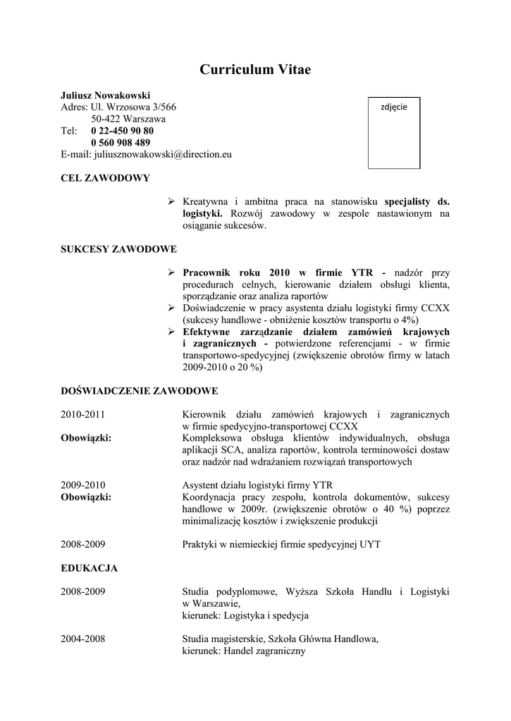 Curriculum Vitae Juliusz Nowakowski Adres: Ul. Wrzosowa 3/566 50-422 Warszawa Tel: 0 22-450 90 80 0 560 908 489 E-mail: [email protected] zdjęcie CEL ZAWODOWY Kreatywna i ambitna praca na stanowisku specjalisty ds. logistyki. Rozwój zawodowy w zespole nastawionym na osiąganie sukcesów. SUKCESY ZAWODOWE Pracownik roku 2010 w firmie YTR - nadzór przy procedurach celnych, kierowanie działem obsługi klienta, sporządzanie oraz analiza raportów Doświadczenie w pracy asystenta działu logistyki firmy CCXX (sukcesy handlowe - obniżenie kosztów transportu o 4%) Efektywne zarządzanie działem zamówień krajowych i zagranicznych - potwierdzone referencjami - w firmie transportowo-spedycyjnej (zwiększenie obrotów firmy w latach 2009-2010 o 20 %) DOŚWIADCZENIE ZAWODOWE 2010-2011 Obowiązki: Kierownik działu zamówień krajowych i zagranicznych w firmie spedycyjno-transportowej CCXX Kompleksowa obsługa klientów indywidualnych, obsługa aplikacji SCA, analiza raportów, kontrola terminowości dostaw oraz nadzór nad wdrażaniem rozwiązań transportowych 2009-2010 Obowiązki: Asystent działu logistyki firmy YTR Koordynacja pracy zespołu, kontrola dokumentów, sukcesy handlowe w 2009r. (zwiększenie obrotów o 40 %) poprzez minimalizację kosztów i zwiększenie produkcji 2008-2009 Praktyki w niemieckiej firmie spedycyjnej UYT EDUKACJA 2008-2009 Studia podyplomowe, Wyższa Szkoła Handlu i Logistyki w Warszawie, kierunek: Logistyka i spedycja 2004-2008 Studia magisterskie, Szkoła Główna Handlowa, kierunek: Handel zagraniczny KURSY, SZKOLENIA: 2007 Szkolenie logistyczne w Centrum Logistyki i Transportu w Gdyni JĘZYKI Angielski Włoski -bardzo dobry (kurs Business English) -dobry OBSŁUGA KOMPUTERA Biegła znajomość MS Office, Excel, aplikacja SCA, Internet REFERENCJE Antoni Nowak Dyrektor zarządzający Firma YTR Tel: 444 34 89 Eryk Zawadzki Prezes Zarządu Firma TRY Sp. z o.o. Tel: 996 79 76 „Wyrażam zgodę na przetwarzanie moich danych osobowych w celach rekrutacji, zgodnie z Ustawą z dn. 29 sierpnia 1997 r. o ochronie danych osobowych (Dz. U. z 2002 r. Nr 101, poz. 926 z późniejszymi zmianami).”
