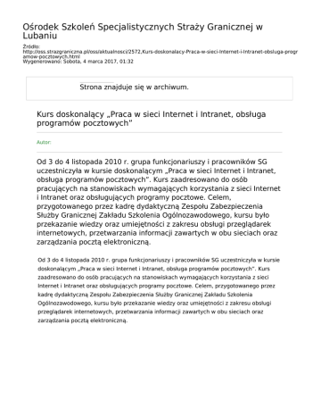 Ośrodek Szkoleń Specjalistycznych Straży Granicznej w Lubaniu Źródło: http://oss.strazgraniczna.pl/oss/aktualnosci/2572,Kurs-doskonalacy-Praca-w-sieci-Internet-i-Intranet-obsluga-progr amow-pocztowych.html Wygenerowano: Sobota, 4 marca 2017, 01:32 Strona znajduje się w archiwum. Kurs doskonalący „Praca w sieci Internet i Intranet, obsługa programów pocztowych” Autor: Od 3 do 4 listopada 2010 r. grupa funkcjonariuszy i pracowników SG uczestniczyła w kursie doskonalącym „Praca w sieci Internet i Intranet, obsługa programów pocztowych”. Kurs zaadresowano do osób pracujących na stanowiskach wymagających korzystania z sieci Internet i Intranet oraz obsługujących programy pocztowe. Celem, przygotowanego przez kadrę dydaktyczną Zespołu Zabezpieczenia Służby Granicznej Zakładu Szkolenia Ogólnozawodowego, kursu było przekazanie wiedzy oraz umiejętności z zakresu obsługi przeglądarek internetowych, przetwarzania informacji zawartych w obu sieciach oraz zarządzania pocztą elektroniczną. Od 3 do 4 listopada 2010 r. grupa funkcjonariuszy i pracowników SG uczestniczyła w kursie doskonalącym „Praca w sieci Internet i Intranet, obsługa programów pocztowych”. Kurs zaadresowano do osób pracujących na stanowiskach wymagających korzystania z sieci Internet i Intranet oraz obsługujących programy pocztowe. Celem, przygotowanego przez kadrę dydaktyczną Zespołu Zabezpieczenia Służby Granicznej Zakładu Szkolenia Ogólnozawodowego, kursu było przekazanie wiedzy oraz umiejętności z zakresu obsługi przeglądarek internetowych, przetwarzania informacji zawartych w obu sieciach oraz zarządzania pocztą elektroniczną.