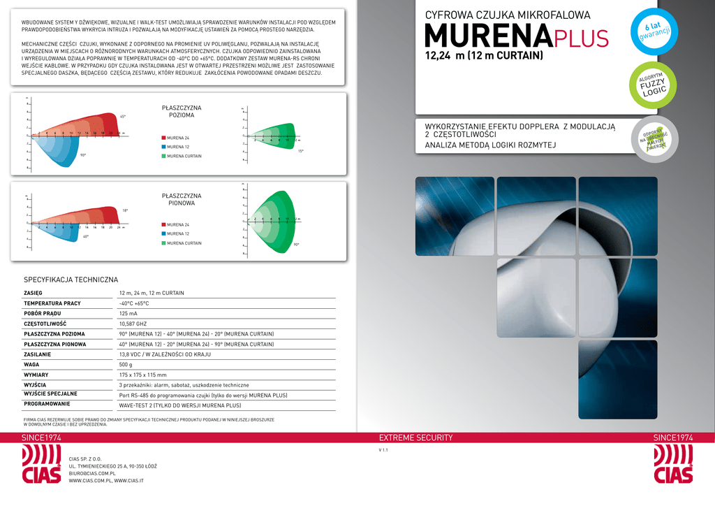 Cyfrowa czujka mikrofalowa 45° Wbudowane system y dźwiękowe, wizualne i WALK-TEST umożliwiają sprawdzenie warunków instalacji pod względem prawdopodobieństwa wykrycia intruza i pozwalają na modyfikację ustawień za pomocą prostego narzędzia. MURENAPLUS 18° 40° Mechaniczne części czujki, wykonane z odpornego na promienie UV poliwęglanu, pozwalają na instalację 90° urządzenia w miejscach o różnorodnych warunkach atmosferycznych. Czujka odpowiednio zainstalowana i wyregulowana działa poprawnie w temperaturach od -40°C do +65°C. Dodatkowy zestaw MURENA-RS chroni wejście kablowe. W przypadku gdy czujka instalowana jest w otwartej przestrzeni możliwe jest zastosowanie specjalnego daszka, będącego częścią zestawu, który redukuje zakłócenia powodowane opadami deszczu. 12,24 m (12 m CURTAIN) RYTM ALGO Y FUZZIC LOG 45° 45° 18° płaszczyzna pozioma 18° 40° 90° MURENA 24 MURENA 12 90° 6 latncji a gwar 40° 15° Wykorzystanie efektu Dopplera z modulacją 2 częstotliwości Analiza metodą logiki rozmytej y orn Odp cność be h o a n yc mał ząt r zwie MURENA CURTAIN 90° PIANO VERTICALE / VERTICAL PLANE płaszczyzna pionowa 45° 18° MURENA 24 MURENA 12 40° 15° MURENA CURTAIN 90° 15° 90° SPECYFIKACJA TECHNICZNA Zasięg 12 m, 24 m, 12 m CURTAIN Temperatura pracy -40°C +65°C Pobór prądu 125 mA Częstotliwość 10,587 GHz Płaszczyzna pozioma 90° (MURENA 12) - 40° (MURENA 24) - 20° (MURENA CURTAIN) 15° Płaszczyzna pionowa 40° (MURENA 12) - 20° (MURENA 24) - 90° (MURENA CURTAIN) Zasilanie 13,8 Vdc / w zależności od kraju Waga 500 g Wymiary 175 x 175 x 115 mm Wyjścia 3 przekaźniki: alarm, sabotaż, uszkodzenie techniczne Wyjście specjalne Port RS-485 do programowania czujki (tylko do wersji MURENA PLUS) Programowanie WAVE-TEST 2 (tylko do wersji MURENA PLUS) Firma CIAS rezerwuje sobie prawo do zmiany specyfikacji technicznej produktu podanej w niniejszej broszurze w dowolnym czasie i bez uprzedzenia. SINCE1974 EXTREME SECURITY v 1.1 CIAS Sp. z o.o. ul. Tymienieckiego 25 A, 90-350 Łódź [email protected] www.cias.com.pl, www.cias.it SINCE1974 MURENA PLUS to nowa, zdalnie sterowana, cyfrowa czujka mikrofalowa stworzona w laboratoriach firmy CIAS. Czujka działa w oparciu o analizę sygnału metodą logiki rozmytej – „FUZZY LOGIC” i przeznaczona jest do ochrony zewnętrznej fasad, balkonów, tarasów, wejść itd. MURENA precyzyjna lokalizacja 12 m CURTAIN EXTREME SECURITY MURENA PLUS CURTAIN to nowy model w rodzinie czujek wykorzystujących efekt Dopplera. Czujka posiada ten sam procesor i wykorzystuje tę samą metodę analizy sygnału ale dzięki specjalnej antenie i zaawansowanemu algorytmowi może być wykorzystana jako „kurtyna” i skutecznie wykrywać intruza, który przemieszcza się w poprzek strefy detekcji czujki. Ponadto możliwe jest określenie rozmiaru poruszającego się obiektu oraz ograniczenie zakresu strefy detekcji. MURENA wykorzystuje efekt Dopplera z modulacją 2 częstotliwości. Umożliwia to detekcję zmian w fazie sygnałów, które z kolei zależą od pozycji poruszającego się obiektu. Dzięki temu czujka może określić odległość przybliżającego się lub oddalającego się od niej obiektu. TECHNOLOGIA MURENA dzięki wykorzystaniu efektu Dopplera z modulacją 2 częstotliwości potrafi określić odległość, wymiary i kierunek poruszania się intruza, co sprawia, że jest on wyraźnie odróżnialny od zakłóceń otoczenia. Analiza częstotliwości sygnału przy użyciu DSP (DIGITAL SIGNAL PROCESSOR) wraz z analizą metodą logiki rozmytej, dotychczas wykorzystywaną w produktach wysokiej klasy takich jak: ERMO 482X PRO, zapewnia doskonałą identyfikację obiektu i klasyfikację w skali zagrożenia, zgodnie z ustawionymi wcześniej parametrami. Czujka posiada 3 przekaźniki: alarm, sabotaż, uszkodzenie techniczne oraz wyjście specjalne RS485 do programowania czujki (tylko w wersji MURENA PLUS). 12 24 m EXTREME SECURITY < MURENA PLUS przykład instalacji w rezydencji przykład instalacji w magazynie LOGIKA ROZMYTA - FUZZY LOGIC Analiza sygnału metodą logiki rozmytej zapewnia doskonałą identyfikację obiektu i jego klasyfikację w skali zagrożenia. Szczegółowa analiza ruchu umożliwia określenie czy obiekt się zbliża, oddala czy porusza w poprzek strefy detekcji. Dzięki funkcji SRTD (Short Range Target Discrimination) czujka potrafi odróżnić ruch blisko czujnika spowodowany przez małe zwierzęta, ptaki, których obecność normalnie generuje fałszywe alarmy. SOFTWARE Analisys 5m Analisys 5m No analisys No analisys funkcja SRTD 12 m Long Range Fuzzy Discrimination 12 m Każde znaczące zdarzenie zapisywane jest w logu systemowym a w przypadku wystąpienia alarmu zapisywany jest również przebieg sygnału, który spowodował wystąpienie alarmu. Zdarzenia te dostępne są z podaną datą i dokładnym czasem dzięki wbudowanemu RTC (zegar czasu rzeczywistego). Mogą być ściągane przez specjalny program WAVE-TEST, który wykorzystywany jest również w celu ustawienia parametrów pracy czujki i zdalnej kontroli (tylko w wersji PLUS).