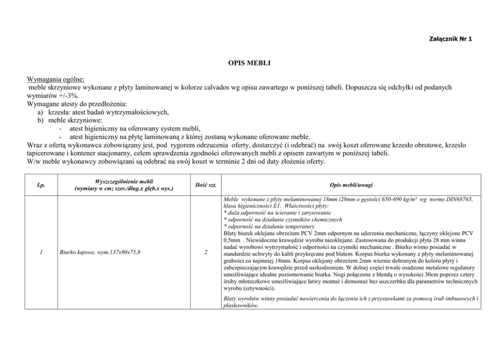 Załącznik Nr 1 OPIS MEBLI Wymagania ogólne: meble skrzyniowe wykonane z płyty laminowanej w kolorze calvados wg opisu zawartego w poniższej tabeli. Dopuszcza się odchyłki od podanych wymiarów +/-3%. Wymagane atesty do przedłożenia: a) krzesła: atest badań wytrzymałościowych, b) meble skrzyniowe: - atest higieniczny na oferowany system mebli, - atest higieniczny na płytę laminowaną z której zostaną wykonane oferowane meble. Wraz z ofertą wykonawca zobowiązany jest, pod rygorem odrzucenia oferty, dostarczyć (i odebrać) na swój koszt oferowane krzesło obrotowe, krzesło tapicerowane i kontener stacjonarny, celem sprawdzenia zgodności oferowanych mebli z opisem zawartym w poniższej tabeli. W/w meble wykonawcy zobowiązani są odebrać na swój koszt w terminie 2 dni od daty złożenia oferty. Lp. 1 Wyszczególnienie mebli (wymiary w cm; szer./dług.x głęb.x wys.) Biurko kątowe, wym.137x90x75,8 Ilość szt. 2 Opis mebli/uwagi Meble wykonane z płyty melaminowanej 18mm i28mm o gęstości 650-690 kg/m³ wg normy DIN68765, klasa higieniczności E1. Właściwości płyty: * duża odporność na ścieranie i zarysowanie * odporność na działanie czynników chemicznych * odporność na działanie temperatury Blaty biurek oklejane obrzeżem PCV 2mm odpornym na uderzenia mechaniczne, łączyny oklejone PCV 0,5mm . Niewidoczne krawędzie wyrobu nieoklejane. Zastosowana do produkcji płyta 28 mm winna nadać wyrobowi wytrzymałość i odporności na czynniki mechaniczne . Biurko winno posiadać w standardzie uchwyty do kabli przykręcane pod blatem. Korpus biurka wykonany z płyty melaminowanej grubości co najmniej 18mm. Korpus oklejony obrzeżem 2mm wiernie dobranym do koloru płyty i zabezpieczającym krawędzie przed uszkodzeniem. W dolnej części trwale osadzone metalowe regulatory umożliwiające idealne poziomowanie biurka. Nogi połączone z blendą o wysokości 30cm poprzez cztery śruby młoteczkowe umożliwiające łatwy montaż i demontaż bez uszczerbku dla parametrów technicznych wyrobu (sztywności). Blaty wyrobów winny posiadać nawiercenia do łączenia ich z przystawkami za pomocą śrub imbusowych i płaskowników. 2 Kontener stacjonarny 4-szufladowy, wym.50x50x75,8 2 Meble wykonane z płyty melaminowanej 18mm i 28mm o gęstości 650-690 kg/m³ wg normy DIN68765, klasa higieniczności E1. Właściwości płyty: * duża odporność na ścieranie i zarysowanie * odporność na działanie czynników chemicznych * odporność na działanie temperatury Wyroby oklejane obrzeżem PCV 0,5mm i PCV 2 mm odpornym na uderzenia mechaniczne. Niewidoczne krawędzie wyrobu nieoklejane. Kontenery przykręcane do blatów biurek lub przystawek za pomocą wkrętów 4x40S. Regulacja mebla odbywa się za pomocą stopek M6x22. Wyroby posiadają wkłady płytowe o wymiarach wewnętrznych: 342/425/85mm. Szuflady umocowane na stalowych, cichobieżnych prowadnicach rolkowych wytrzymujące obciążenie 20kg zapewniające łatwy 75% wysuw szuflady bez obawy jej wypadnięcia . Uchwyty zastosowane w wyrobie wykonane ze stopu ZnAl (cynkowo-aluminiowy) wykończony galwanicznie na srebrny mat przykręcane za pomocą 2 śrub M4x23 ocynk., zamek centralny 3 Dostawka do 2 biurek, wym.130x50x75,8 1 Wykonane wg załączonego wzoru 4 Krzesło obrotowe wg załaczonego wzoru 2 5 Krzesło tapicerowane 3 6 Szafa aktowa, wym.80x38,5x184 1 7 Regał częściowo otwarty, wym.80x38,5x184 1 Wysokość krzesła 99÷117cm, oparcie regulowane 55÷60, szerokość siedziska do 46cm, szerokość pięcionogu z kółkami fi:64,5cm podłokietniki do wysokości 21cm, wyysokość siedziska 45÷58cm, regulowane na wysokość podłkietniki, krzesło wyposażone w mechanizm Synchro Wysokość krzesła do 87cm, wysokość oparcia do 42cm, szerokość krzesła do 60cm, głębokość 55cm, podłokietniki do wysokości 20cm, wysokość siedziska do 45cm, stelaż metalowy lakierowany proszkowo w kolorze alu Meble wykonane z płyty melaminowanej 18mm i 28mm o gęstości 650-690 kg/m³ wg normy DIN68765, klasa higieniczności E1. Właściwości płyty: * duża odporność na ścieranie i zarysowanie, * odporność na działanie czynników chemicznych, * odporność na działanie temperatury Wyroby oklejane obrzeżem PCV 0,5mm i PCV 2 mm odpornym na uderzenia mechaniczne. Niewidoczne krawędzie wyrobu nieoklejane. Wieńce górne wykonane zostały z płyty 28mm ; wieńce dolne , półki i boki wykonane z płyty 18mm a ściany tylnie z płyty HDF 3mm. Każdy wyrób winien posiadać przestrzeń półkową umożliwiającą swobodne wkładanie segregatorów. Szafy posiadają drzwi skrzydłowe , każdy z frontów mocowany jest do korpusu szafy za pomocą zawiasów FGV o możliwym kącie otwarcia 110°. Zawiasy pewnie utrzymują skrzydło drzwiowe zapewniając długie i bezawaryjne funkcjonowanie . Uchwyty wykonane ze stopu „ZnAl” (cynkowo-aluminiowy) wykończone galwanicznie na srebrny mat, przykręcane za pomocą 2 śrub M4x23 ocynk. Poziomowanie szaf za pomocą regulatorów Ø50 o wysokości 27mm. Półki szaf mocowane za pomocą złącz półek „TITUS EXPANDO 6” zapobiegając ich niekontrolowanemu przesunięciu. Szafy aktowe wyposażone w zamek patentowy. 8 Regał wiszący otwarty, wym.120x38,5x80 1 9 Wieszak ubraniowy wolnostojący 1 Maksymalna wysokość: 180cm, fi:40cm 10 Wysuwany blat na klawiaturę 2 Blat wysuwany, podwieszany (montowany bezpośrednio do blatu biurka), wykonany z płyty laminowanej 11 Zawieszka stalowa na komputer, wym.23,2x40x25 2 Zawieszka montowana bezpośrednio do kontenera 4-szufladowego