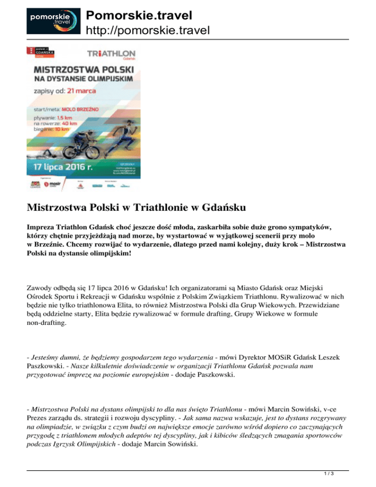 Pomorskie.travel http://pomorskie.travel Mistrzostwa Polski w Triathlonie w Gdańsku Impreza Triathlon Gdańsk choć jeszcze dość młoda, zaskarbiła sobie duże grono sympatyków, którzy chętnie przyjeżdżają nad morze, by wystartować w wyjątkowej scenerii przy molo w Brzeźnie. Chcemy rozwijać to wydarzenie, dlatego przed nami kolejny, duży krok – Mistrzostwa Polski na dystansie olimpijskim! Zawody odbędą się 17 lipca 2016 w Gdańsku! Ich organizatorami są Miasto Gdańsk oraz Miejski Ośrodek Sportu i Rekreacji w Gdańsku wspólnie z Polskim Związkiem Triathlonu. Rywalizować w nich będzie nie tylko triathlonowa Elita, to również Mistrzostwa Polski dla Grup Wiekowych. Przewidziane będą oddzielne starty, Elita będzie rywalizować w formule drafting, Grupy Wiekowe w formule non-drafting. - Jesteśmy dumni, że będziemy gospodarzem tego wydarzenia - mówi Dyrektor MOSiR Gdańsk Leszek Paszkowski. - Nasze kilkuletnie doświadczenie w organizacji Triathlonu Gdańsk pozwala nam przygotować imprezę na poziomie europejskim - dodaje Paszkowski. - Mistrzostwa Polski na dystans olimpijski to dla nas święto Triathlonu - mówi Marcin Sowiński, v-ce Prezes zarządu ds. strategii i rozwoju dyscypliny. - Jak sama nazwa wskazuje, jest to dystans rozgrywany na olimpiadzie, w związku z czym budzi on największe emocje zarówno wśród dopiero co zaczynających przygodę z triathlonem młodych adeptów tej dyscypliny, jak i kibiców śledzących zmagania sportowców podczas Igrzysk Olimpijskich - dodaje Marcin Sowiński. 1/3 Pomorskie.travel http://pomorskie.travel Dystanse obowiązujące w zawodach to odpowiednio: 1500 m pływania; 40 km jazdy rowerem; 10 km biegu. Zapisy dostępne są pod adresami: Elita Grupy Wiekowe Organizatorzy spodziewają się blisko setki uczestników Elity. Dla tej grupy opłata startowa wynosi w zależności od terminu wpłaty: do 17.06.2016 – 179 PLN do 30.06 – 219 PLN Zawodnicy startujący w tej grupie muszą legitymować się licencją zawodniczą PRO Polskiego Związku Triathlonu. Opłata startowa za udział w Mistrzostwa Polski na dystansie Olimpijskim Age-Group w zależności od terminu wpłaty wynosi: do 04.04.2016 – 179 PLN do 23.04.2016 – 219 PLN do 23.05.2016 – 259 PLN do 23.06.2016 – 299 PLN do 30.06.2016 – 349 PLN W przypadku tej grupy, obowiązuje limit 500 uczestników. Zawodnik oprócz opłaty startowej zobowiązany jest posiadać licencję Polskiego Związku Triathlonu jednodniową do wykupienia podczas rejestracji lub w biurze zawodów najpóźniej w przededniu startu (koszt licencji 20 PLN) lub licencję roczną na rok 2016 rok (koszt licencji 75 PLN), którą może nabyć za pośrednictwem strony http://triathlon.pl/licencje/. Kategorie wiekowe K/M: 18-24; 25-29; 30-34; 35-39; 40-44; 45-49; 50-54; 55-59; 60-64; 65-69; od 70 lat. W ramach opłaty startowej każdy uczestnik Triathlon Gdańsk będzie miał zapewniony pakiet 2/3 Pomorskie.travel http://pomorskie.travel zawierający: numery startowe, pas na numer startowy, czepek, pamiątkową koszulkę, napoje (woda, napoje izotoniczne) i owoce, pamiątkowy, odlewany medal, worek sportowy, worek na odzież do depozytu, upominki od sponsorów i partnerów imprezy. Zawodnicy w klasyfikacji Elite Kobiet (za miejsca I-VI) i Elite Mężczyzn (za miejsca I-VI) otrzymają puchary oraz nagrody finansowe (brutto): I miejsce – 3000 PLN II miejsce – 2000 PLN III miejsce – 1500 PLN IV miejsce – 1000 PLN V miejsce – 500 PLN Zawodnicy w klasyfikacji U-23 Kobiet (za miejsca I-III) i U-23 mężczyzn (za miejsca I-III) otrzymają puchary oraz nagrody finansowe (brutto): I miejsce – 500 PLN II miejsce – 300 PLN III miejsce – 200 PLN Katarzyna Lenczewska 3/3 Powered by TCPDF (www.tcpdf.org)
