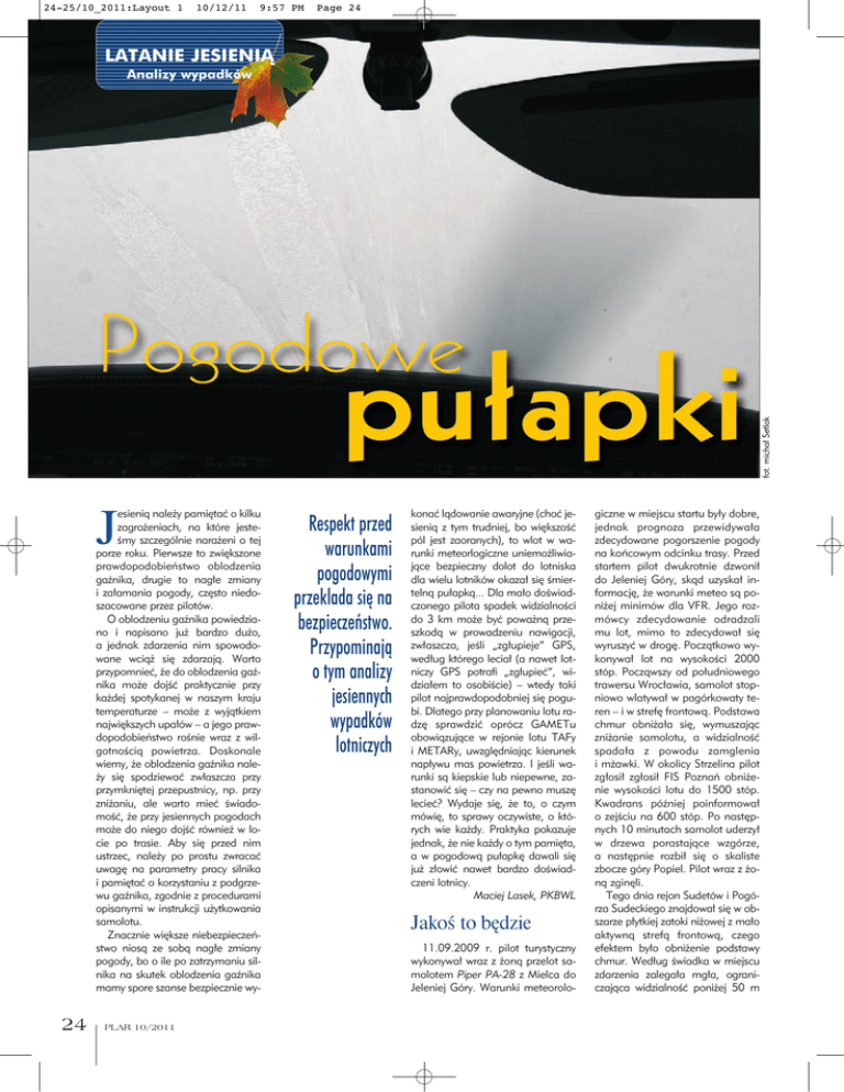 24-25/10_2011:Layout 1 10/12/11 9:57 PM Page 24 LATANIE JESIENIĄ Analizy wypadków pułapki J esienią należy pamiętać o kilku zagrożeniach, na które jesteśmy szczególnie narażeni o tej porze roku. Pierwsze to zwiększone prawdopodobieństwo oblodzenia gaźnika, drugie to nagłe zmiany i załamania pogody, często niedoszacowane przez pilotów. O oblodzeniu gaźnika powiedziano i napisano już bardzo dużo, a jednak zdarzenia nim spowodowane wciąż się zdarzają. Warto przypomnieć, że do oblodzenia gaźnika może dojść praktycznie przy każdej spotykanej w naszym kraju temperaturze – może z wyjątkiem największych upałów – a jego prawdopodobieństwo rośnie wraz z wilgotnością powietrza. Doskonale wiemy, że oblodzenia gaźnika należy się spodziewać zwłaszcza przy przymkniętej przepustnicy, np. przy zniżaniu, ale warto mieć świadomość, że przy jesiennych pogodach może do niego dojść również w locie po trasie. Aby się przed nim ustrzec, należy po prostu zwracać uwagę na parametry pracy silnika i pamiętać o korzystaniu z podgrzewu gaźnika, zgodnie z procedurami opisanymi w instrukcji użytkowania samolotu. Znacznie większe niebezpieczeństwo niosą ze sobą nagłe zmiany pogody, bo o ile po zatrzymaniu silnika na skutek oblodzenia gaźnika mamy spore szanse bezpiecznie wy- 24 PLAR 10/2011 Respekt przed warunkami pogodowymi przeklada się na bezpieczeństwo. Przypominają o tym analizy jesiennych wypadków lotniczych konać lądowanie awaryjne (choć jesienią z tym trudniej, bo większość pól jest zaoranych), to wlot w warunki meteorlogiczne uniemożliwiające bezpieczny dolot do lotniska dla wielu lotników okazał się śmiertelną pułapką... Dla mało doświadczonego pilota spadek widzialności do 3 km może być poważną przeszkodą w prowadzeniu nawigacji, zwłaszcza, jeśli „zgłupieje” GPS, według którego leciał (a nawet lotniczy GPS potrafi „zgłupieć”, widziałem to osobiście) – wtedy taki pilot najprawdopodobniej się pogubi. Dlatego przy planowaniu lotu radzę sprawdzić oprócz GAMETu obowiązujące w rejonie lotu TAFy i METARy, uwzględniając kierunek napływu mas powietrza. I jeśli warunki są kiepskie lub niepewne, zastanowić się – czy na pewno muszę lecieć? Wydaje się, że to, o czym mówię, to sprawy oczywiste, o których wie każdy. Praktyka pokazuje jednak, że nie każdy o tym pamięta, a w pogodową pułapkę dawali się już złowić nawet bardzo doświadczeni lotnicy. Maciej Lasek, PKBWL Jakoś to będzie 11.09.2009 r. pilot turystyczny wykonywał wraz z żoną przelot samolotem Piper PA-28 z Mielca do Jeleniej Góry. Warunki meteorolo- giczne w miejscu startu były dobre, jednak prognoza przewidywała zdecydowane pogorszenie pogody na końcowym odcinku trasy. Przed startem pilot dwukrotnie dzwonił do Jeleniej Góry, skąd uzyskał informację, że warunki meteo są poniżej minimów dla VFR. Jego rozmówcy zdecydowanie odradzali mu lot, mimo to zdecydował się wyruszyć w drogę. Początkowo wykonywał lot na wysokości 2000 stóp. Począwszy od południowego trawersu Wrocławia, samolot stopniowo wlatywał w pagórkowaty teren – i w strefę frontową. Podstawa chmur obniżała się, wymuszając zniżanie samolotu, a widzialność spadała z powodu zamglenia i mżawki. W okolicy Strzelina pilot zgłosił zgłosił FIS Poznań obniżenie wysokości lotu do 1500 stóp. Kwadrans później poinformował o zejściu na 600 stóp. Po następnych 10 minutach samolot uderzył w drzewa porastające wzgórze, a następnie rozbił się o skaliste zbocze góry Popiel. Pilot wraz z żoną zginęli. Tego dnia rejon Sudetów i Pogórza Sudeckiego znajdował się w obszarze płytkiej zatoki niżowej z mało aktywną strefą frontową, czego efektem było obniżenie podstawy chmur. Według świadka w miejscu zdarzenia zalegała mgła, ograniczająca widzialność poniżej 50 m fot. michał Setlak Pogodowe 24-25/10_2011:Layout 1 10/12/11 (była to raczej schodząca poniżej wierzchołka góry chmura Stratus). Według PKBWL, przyczynami wypadku były: podjęcie decyzji o locie mimo wiedzy o braku warunków meteorologicznych umożliwiających jego wykonanie, niedostateczne przygotowanie przelotu i brak decyzji o przerwaniu przelotu po pogorszeniu się warunków na trasie. Okolicznością sprzyjającą było małe doświadczenie pilota: nalot 176 h, licencja uzyskana niecały rok wcześniej. Muszę lecieć fot. michał Setlak 8.10.2004 r. pilot śmigłowcowy turystyczny wykonywał śmigłowcem Enstrom 280C nocny lot nawigacyjny z lotniska Bielsko-Biała Aleksandrowice po trasie Dobczyce – Miechów – Aleksandrowice. W rejonie Miechowa, ze względu na pogarszającą się pogodę, postanowił skrócić zaplanowaną trasę i w porozumieniu z FIS Kraków złożył z powietrza plan lotu na powrót do Bielska przez CTR lotniska Balice. W rejonie miejscowości Radocza nadał sygnał MAYDAY. Wkrótce potem śmigłowiec zderzył się z ziemią i spłonął. Pilot zginął. Według PKBWL, przyczynami wypadku były niezamierzony wlot w rejon pogarszających się warunków meteorologicznych i utrata orientacji prze- 9:57 PM Page 25 strzennej przez pilota podczas wykonywania zakrętu o 180° w celu opuszczenia rejonu złej pogody. Wpływ na zaistnienie wypadku miały nie przewidziane na etapie planowania pogorszenie się pogody i małe doświadczenie pilota w nawigacyjnych lotach nocnych. Rejon lotu znajdował się pod wpływem zatoki niskiego ciśnienia z frontem chłodnym, z zamgleniami i na końcowym etapie trasy opady deszczu. Według komisji, na decyzję o wykonaniu lotu mógł mieć wpływ fakt, iż miał to być ostatni lot z zakresu przygotowania do egzaminu na licencję pilota śmigłowcowego zawodowego, po której otrzymaniu pilot miał podjąć pracę na śmigłowcu Eurocopter. Według prognozy, wykorzystanej przy planowaniu lotu, można się było spodziewać pogorszenia widzialności poniżej minimum d