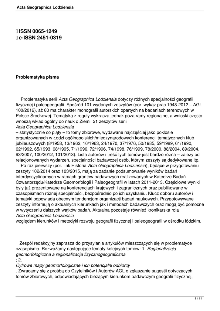 Acta Geographica Lodziensia ISSN 0065-1249 e-ISSN 2451-0319 Problematyka pisma Problematyka serii Acta Geographica Lodziensia dotyczy różnych specjalności geografii fizycznej i paleogeografii. Spośród 101 wydanych zeszytów (por. wykaz prac 1948-2012 – AGL 100/2012), aż 80 ma charakter monografii autorskich opartych na badaniach terenowych w Polsce Środkowej. Tematyka z reguły wykracza jednak poza ramy regionalne, a wnioski często wnoszą wkład ogólny do nauk o Ziemi. 21 zeszytów serii Acta Geographica Lodziensia – statystycznie co piąty – to tomy zbiorowe, wydawane najczęściej jako pokłosie organizowanych w Łodzi ogólnopolskich/międzynarodowych konferencji tematycznych i/lub jubileuszowych (8/1958, 13/1962, 16/1963, 24/1970, 37/1976, 50/1985, 59/1989, 61/1990, 62/1992, 65/1993, 68/1995, 71/1996, 72/1996, 74/1998, 76/1999, 78/2000, 88/2004, 89/2004, 93/2007, 100/2012, 101/2013). Lista autorów i treść tych tomów jest bardzo różna – zależy od relacjonowanych wydarzeń, specjalności badawczej osób, którym zeszyty są dedykowane itp. Po raz pierwszy (por. link Historia Acta Geographica Lodziensia), będące w przygotowaniu zeszyty 102/2014 oraz 103/2015, mają za zadanie podsumowanie wyników badań interdyscyplinarnych w ramach grantów badawczych realizowanych w Katedrze Badań Czwartorzędu/Katedrze Geomorfologii i Paleogeografii w latach 2011-2013. Częściowe wyniki były już prezentowane na konferencjach krajowych i zagranicznych oraz publikowane w czasopismach różnej specjalności, bezpośrednio po ich uzyskaniu. Klucz doboru autorów i tematyki odpowiada obecnym tendencjom organizacji badań naukowych. Przygotowywane zeszyty informują o aktualnych kierunkach jak i metodach badawczych oraz mogą być pomocne w wytyczeniu dalszych wątków badań. Aktualna pozostaje również kronikarska rola Acta Geographica Lodziensia względem kierunków i metodyki rozwoju geografii fizycznej i paleogeografii w ośrodku łódzkim. Zespół redakcyjny zaprasza do przysyłania artykułów mieszczących się w problematyce czasopisma. Rozważamy następujące tematy kolejnych tomów: 1. Regionalizacja geomorfologiczna a regionalizacja fizycznogeograficzna ; 2. Cyfrowe mapy geomorfologiczne i ich potencjalni odbiorcy . Zwracamy się z prośbą do Czytelników i Autorów AGL o zgłaszanie sugestii dotyczących tomów zbiorowych, odpowiadających bieżącym kierunkom badawczym geografii fizycznej, 1 / 11 Acta Geographica Lodziensia szczególnie wątkom budzącym kontrowersje i wymagającym przedyskutowania. Spisy treści oraz ewentualne streszczenia poszczególnych numerów dostępne są w postaci plików PDF na stronie internetowej Księgarni ŁTN . Artykuły czasopisma w elektronicznej wersji są dostępne w bazach CEEOL , EBSCOhost , P roquest oraz na portalu epnp.pl i IBUK . Czasopismo jest indeksowane w bazie Copernicus . ICV 2014 – 55,79 ICV 2015 – 71,15 Czasopismo jest indeksowane w bazie CEJSH (The Central European Journal of Social Sciences and Humanities) oraz w Bibliography and Index of Geology – GeoRef Czasopismo znajduje się na liście czasopism naukowych Ministra Nauki i Szkolnictwa Wyższego. Liczba punktów w roku 2016 - 11. 2 / 11 Acta Geographica Lodziensia ABOUT JOURNAL The journal Acta Geographica Lodziensia has been published since 1948. Its founder and first editor was Professor Jan Dylik. The journal publishes original papers and monographs focusing on broad aspects of physical geography, particularly geomorphology and palaeogeography of Central Poland. The range of interest often goes beyond the regional frames and brings a general contribution to the earth sciences. The journal is intended to be a chronicle of regional scientific events. Research problems presented in the journal refers directly to current global trends in earth sciences. Acta Geographica Lodziensia is indexed in Bibliography and Index of Geology – GeoRef Redakcja/Editors Redaktor Naczelny — dr hab. Jacek Forysiak — [email protected] — BIOGRA PHY Zastępca Redaktora Naczelnego – dr hab. Anita Wolaniuk —[email protected] Sekretarz Redakcji, Redaktor Tematyczny – dr Danuta Dzieduszyńska —[email protected] Redaktorzy Językowy – Ewa Komorowska-Jędrzejewska Komitet Redakcyjny: – prof. Andriy Bogucki, Ivan Franko National University of Lviv – prof. dr hab. Ryszard K. Borówka, Uniwersytet Szczeciński 3 / 11 Acta Geographica Lodziensia – prof. dr hab. Radosław Dobrowolski, Uniwersytet Marii Skłodowskiej-Curie – prof. dr hab. Piotr Gębica, Wyższa Szkoła Informatyki i Zarządzania w Rzeszowie – prof. dr hab. Paweł Jokiel, Uniwersytet Łódzki – dr Olaf Juschus, University of Applied Sciences Eberswalde – prof. Vladislav Kuznetsov, St. Petersburg State University – dr hab. prof. UŁ Małgorzata Roman, Uniwersytet Łódzki – dr hab. prof. UW Ewa Smolska, Uniwersytet Warszawski – dr hab. prof. UŁ Juliusz Twardy, Uniwersytet Łódzki – prof. dr hab. Joanna Wibig, Uniwersytet Łódzki – prof. Igor I. Zveryaev, P.P. Shirshov Institute of Oceanology, Moskwa Adres redakcji i wydawcy: Łódzkie Towarzystwo Naukowe ul. M. Skłodowskiej-Curie 11 90-505 Łódź, tel. 42 665 54 49, 42 665 54 46 e-mail: [email protected] Zamówienia Poszczególne numery można nabyć w siedzibie Łódzkiego Towarzystwa Naukowego (90-505 Łódź, ul. M. Curie-Skłodowskiej 11), na stronie internetowej Księgarni ŁTN lub w wersji elektronicznej na portalu ePNP i IBUK . Informacje dla autorów 1. Prace należy przekazywać w wersji elektronicznej oraz w formie wydruku. 4 / 11 Acta Geographica Lodziensia 2. Objętość artykułu (tekst z literaturą, rysunkami, tabelami, fotografiami) nie powinna przekroczyć 20 stron . 3. Praca powinna zawierać: imię i nazwisko autora z afiliacją i adresem e-mail, tytuł w języku polskim i angielskim, abstrakt (ok. 150 słów) w języku polskim i angielskim, słowa kluczowe (5-10) w języku polskim i angielskim, tekst,