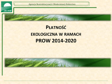 Agencja Restrukturyzacji i Modernizacji Rolnictwa PŁATNOŚĆ EKOLOGICZNA W RAMACH PROW 2014-2020 Agencja Restrukturyzacji i Modernizacji Rolnictwa Beneficjent Płatności bezpośrednie Płatności ONW PROW 2014-2020 Płatności rolnośrodowiskowo – klimatyczna PROW 2014-2020 Rolnik Rolnik - aktywny zawodowo Rolnik - aktywny zawodowo Płatnośd ekologiczna PROW 2014-2020 Rolnik - aktywny zawodowo Grupa rolników Zarządca Grupa rolników i zarządców Grupa rolników – aktywnych zawodowo Agencja Restrukturyzacji i Modernizacji Rolnictwa Działanie Rolnictwo ekologiczne -wprowadzenie Działanie Rolnictwo ekologiczne PROW 2014-2020 jest w dużej części kontynuacją dotychczasowego Pakietu 2. Rolnictwo ekologiczne w ramach programu rolnośrodowiskowego PROW 2007-2013. Celem działania Rolnictwo ekologiczne jest wspieranie dobrowolnych zobowiązao rolników, którzy podejmują się utrzymad lub przejśd na praktyki i metody rolnictwa ekologicznego określone w rozporządzeniu Rady (WE) nr 834/2007 z dnia 28 czerwca 2007 r. i spełniają definicję rolnika aktywnego zawodowo. Wszystkie gospodarstwa uprawnione do wsparcia w ramach działania Rolnictwo ekologiczne podlegają kontroli wykonywanej przez upoważnione przez Ministra Rolnictwa i Rozwoju Wsi jednostki certyfikujące rolnictwo ekologiczne w zakresie prowadzenia w tym gospodarstwie produkcji rolnej, zgodnie z przepisami określonymi w ustawie o rolnictwie ekologicznym i rozporządzeniu Rady (WE) nr 834/2007. Kontrola wykonywana przez jednostki certyfikujące rolnictwo ekologiczne odbywa się corocznie i obejmuje wszystkie gospodarstwa w okresie konwersji oraz po okresie konwersji. Agencja Restrukturyzacji i Modernizacji Rolnictwa Działanie Rolnictwo ekologiczne – pakiety/warianty Zobowiązanie ekologiczne można realizowad w ramach następujących pakietów i wariantów: Pakiet 1. Uprawy rolnicze w okresie konwersji; Pakiet 2. Uprawy warzywne w okresie konwersji; Pakiet 3. Uprawy zielarskie w okresie konwersji; Pakiet 4. Uprawy sadownicze w okresie konwersji: Wariant 4.1.1. Podstawowe uprawy sadownicze w okresie konwersji, Wariant 4.1.2. Uprawy jagodowe w okresie konwersji, Wariant 4.2. Ekstensywne uprawy sadownicze w okresie konwersji; Pakiet 5. Uprawy paszowe na gruntach ornych w okresie konwersji; Pakiet 6. Trwałe użytki zielone w okresie konwersji; Pakiet 7. Uprawy rolnicze po okresie konwersji; Pakiet 8. Uprawy warzywne po okresie konwersji; Pakiet 9. Uprawy zielarskie po okresie konwersji; Pakiet 10. Uprawy sadownicze po okresie konwersji: Pakiet 11. Uprawy paszowe na gruntach ornych po okresie konwersji; Pakiet 12. Trwałe użytki zielone po okresie konwersji. Wariant 10.1.1. Podstawowe uprawy sadownicze po okresie konwersji, Wariant 10.1.2. Uprawy jagodowe po okresie konwersji, Wariant 10.2. Ekstensywne uprawy sadownicze po okresie konwersji. Agencja Restrukturyzacji i Modernizacji Rolnictwa Stawki płatności ekologicznej PROW 2014-2020 w okresie konwersji Pakiet 1. Uprawy rolnicze 966 zł/ha Pakiet 2. Uprawy warzywne 1 557 zł/ha Pakiet 3. Uprawy zielarskie 1 325 zł/ha Pakiet 4. Uprawy sadownicze Wariant 4.1.1. Podstawowe uprawy sadownicze 1 882 zł/ha Wariant 4.1.2. Uprawy jagodowe 1 882 zł/ha Wariant 4.2. Ekstensywne uprawy sadownicze 790 zł/ha Pakiet 5. Uprawy paszowe na gruntach ornych 787 zł/ha Pakiet 6. Trwałe użytki zielone 428 zł /ha po okresie konwersji Pakiet 7. Uprawy rolnicze 792 zł/ha Pakiet 8. Uprawy warzywne 1 310 zł/ha Pakiet 9. Uprawy zielarskie 1 325 zł/ha Pakiet 10. Uprawy sadownicze Wariant 10.1.1. Podstawowe uprawy sadownicze 1 501 zł/ha Wariant 10.1.2. Uprawy jagodowe 1 501 zł/ha Wariant 10.2. Ekstensywne uprawy sadownicze 660 zł/ha Pakiet 11. Uprawy paszowe na gruntach ornych 559 zł/ha Pakiet 12. Trwałe użytki zielone 428 zł/ha Agencja Restrukturyzacji i Modernizacji Rolnictwa Działanie Rolnictwo ekologiczne -wprowadzenie Beneficjenci: Rolnicy oraz grupy rolników, którzy dobrowolnie podejmują się przejśd na praktyki i metody rolnictwa ekologicznego określone w rozporządzeniu Rady (WE) nr 834/2007 i spełniają definicję rolnika aktywnego zawodowo. Rodzaj wsparcia: Płatnośd jest ryczałtowa, przyznawana w zależności od realizowanego pakietu do hektara (gruntu ornego/TUZ-u/sadu). Płatności w ramach pakietów są przyznawane corocznie przez okres 5 lat rolnikom, którzy dobrowolnie przyjmują na siebie zobowiązanie w zakresie danego pakietu/pakietów. Płatnośd w całości lub w części rekompensuje utracony dochód i dodatkowo poniesione koszty. Dla Pakietów 1- 5 i 7-11 płatnośd jest przyznawana do powierzchni, na której są uprawiane gatunki roślin określone na poziomie rozporządzenia krajowego. Agencja Restrukturyzacji i Modernizacji Rolnictwa Działanie Rolnictwo ekologiczne – warunki Płatnośd ekologiczną, przyznaje się jeżeli: został mu nadany numer identyfikacyjny w trybie przepisów o krajowym systemie ewidencji producentów, ewidencji gospodarstw rolnych oraz ewidencji wniosków o przyznanie płatności, łączna powierzchnia posiadanych przez niego użytków rolnych w rozumieniu art. 2 ust. 1 akapit drugi lit. f rozporządzenia nr 1305/2013, wynosi 1 ha; realizuje 5-letnie zobowiązanie ekologiczne, o którym mowa w art. 29 ust. 2 rozporządzenia nr 1305/2013, obejmujące wymogi wykraczające ponad podstawowe wymagania, w ramach określonego pakietu albo jego wariantu, zwane dalej „zobowiązaniem ekologicznym”; spełnia warunki przyznania płatności ekologicznej w ramach określonych pakietów lub ich wariantów określone w rozporządzeniu. Jeżeli rolnik nie spełnia warunku łącznej powierzchni posiadanych przez niego użytków rolnych (1 ha), płatnośd ekologiczna może mu zostad przyznana, jeżeli spełnia ten warunek łącznie z co najmniej jednym innym rolnikiem ubiegającym się o przyznanie płatności ekologicznej. Agencja Restrukturyzacji i Modernizacji Rolnictwa Działanie Rolnictwo ekologiczne - zobowiązanie Zobowią
