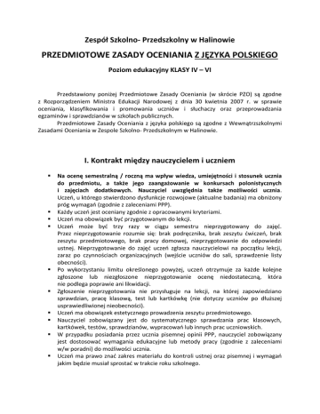 Zespół Szkolno- Przedszkolny w Halinowie PRZEDMIOTOWE ZASADY OCENIANIA Z JĘZYKA POLSKIEGO Poziom edukacyjny KLASY IV – VI Przedstawiony poniżej Przedmiotowe Zasady Oceniania (w skrócie PZO) są zgodne z Rozporządzeniem Ministra Edukacji Narodowej z dnia 30 kwietnia 2007 r. w sprawie oceniania, klasyfikowania i promowania uczniów i słuchaczy oraz przeprowadzania egzaminów i sprawdzianów w szkołach publicznych. Przedmiotowe Zasady Oceniania z języka polskiego są zgodne z Wewnątrzszkolnymi Zasadami Oceniania w Zespole Szkolno- Przedszkolnym w Halinowie. I. Kontrakt między nauczycielem i uczniem Na ocenę semestralną / roczną ma wpływ wiedza, umiejętności i stosunek ucznia do przedmiotu, a także jego zaangażowanie w konkursach polonistycznych i zajęciach dodatkowych. Nauczyciel uwzględnia także możliwości ucznia. Uczeń, u którego stwierdzono dysfunkcje rozwojowe (aktualne badania) ma obniżony próg wymagań (zgodnie z zaleceniami PPP). Każdy uczeń jest oceniany zgodnie z opracowanymi kryteriami. Uczeń ma obowiązek być przygotowanym do lekcji. Uczeń może być trzy razy w ciągu semestru nieprzygotowany do zajęć. Przez nieprzygotowanie rozumie się: brak podręcznika, brak zeszytu ćwiczeń, brak zeszytu przedmiotowego, brak pracy domowej, nieprzygotowanie do odpowiedzi ustnej. Nieprzygotowanie do zajęć uczeń zgłasza nauczycielowi na początku lekcji, zaraz po czynnościach organizacyjnych (wejście uczniów do sali, sprawdzenie listy obecności). Po wykorzystaniu limitu określonego powyżej, uczeń otrzymuje za każde kolejne zgłoszone lub niezgłoszone nieprzygotowanie ocenę niedostateczną, która nie podlega poprawie ani likwidacji. Zgłoszenie nieprzygotowania nie przysługuje na lekcji, na której zapowiedziano sprawdzian, pracę klasową, test lub kartkówkę (nie dotyczy uczniów po dłuższej usprawiedliwionej nieobecności). Uczeń ma obowiązek estetycznego prowadzenia zeszytu przedmiotowego. Nauczyciel zobowiązany jest do systematycznego sprawdzania prac klasowych, kartkówek, testów, sprawdzianów, wypracowań lub innych prac uczniowskich. W przypadku posiadania przez ucznia pisemnej opinii PPP, nauczyciel zobowiązany jest dostosować wymagania edukacyjne lub metody pracy (zgodnie z zaleceniami w/w poradni) do możliwości ucznia. Uczeń ma prawo znać zakres materiału do kontroli ustnej oraz pisemnej i wymagań jakim będzie musiał sprostać w trakcie roku szkolnego. II. Sposoby dokumentowania ocen Otrzymane przez ucznia oceny są zapisywane przez nauczyciela przedmiotu w dzienniku elektronicznym odpowiednim kolorem zgodnie z ich „wagą”. Prace klasowe, sprawdziany, testy czytania ze zrozumieniem, sprawdziany diagnozujące i całoroczne są przechowywane przez nauczyciela do końca roku szkolnego (tj. do 31 sierpnia), a oceny z nich uzyskane są zapisywane w dzienniku odpowiednio kolorem czerwonym. Wykonane przez ucznia pomoce dydaktyczne i dodatkowe (albumy, plakaty, tablice, projekty, prezentacje, pomoce dydaktyczne) mogą być zatrzymane za zgodą ucznia na użytek szkolny. Zeszyty przedmiotowe i zeszyty ćwiczeń mogą zawierać jednostkowe oceny oraz plusy i minusy za określone prace, ćwiczenia (obowiązkowe lub dla osób chętnych, lub ich brak). Ocena roczna z przedmiotu zapisana jest w arkuszu ocen ucznia. III. Kontakt z rodzicami/prawnymi opiekunami ucznia - sposób przekazywania informacji zwrotnej Zebrania z rodzicami, dni otwarte w szkole, dyżury nauczycieli odbywają się według ustalonego przez Dyrekcję harmonogramu. Informacje mogą być zapisywane w zeszycie do korespondencji, dzienniku elektronicznym lub dzienniczku ucznia. Indywidualna rozmowa z wychowawcą/nauczycielem przedmiotu, podczas której przekazywana jest informacja o ocenach. Rodzic (opiekun) może wtedy też obejrzeć prace klasowe, sprawdziany, wypracowania napisane przez swoje dziecko. Rozmowa z pedagogiem szkolnym w przypadku trudności wychowawczych (komunikacyjnych) bądź nieznajomości środowiska rodzinnego dziecka. W szczególnych przypadkach rozmowa z Dyrekcją szkoły w obecności wychowawcy lub pedagoga. Nauczyciel polonista kontaktuje się z rodzicami (prawnymi opiekunami) ucznia podczas szkolnych (planowych) spotkań z rodzicami lub indywidualnie poprzez wychowawcę klasy, który powiadamia rodziców/prawnych opiekunów o konieczności stawienia się do szkoły oraz bezpośrednio poprzez dziennik elektroniczny. Nauczyciel może udzielić informacji o postępach ucznia w nauce (lub ich braku) także każdorazowo, gdy rodzice odwiedzą szkołę poza wyznaczonym terminem, pod warunkiem, że nie zakłóca to zajęć dydaktycznych, wychowawczo - opiekuńczych prowadzonych przez nauczyciela oraz nie koliduje z jego dyżurami na korytarzu szkolnym. IV. Archiwizacja prac Archiwizacji (przechowywaniu) do końca roku szkolnego, czyli do 31 VIII, podlegają: prace klasowe, sprawdziany i dyktanda. Mogą być one udostępnione do wglądu rodzicom (opiekunom) uczniów na ich wyraźną prośbę w czasie zebrań, dni otwartych w szkole, spotkań indywidualnych. Po okresie archiwizacji wyżej wymienione prace mogą zostać zwrócone zainteresowanym uczniom. Jeżeli nauczyciel podejrzewa u ucznia zaburzenia dyslektyczno - dysortograficzne i planuje jego skierowanie na badania w PPP, może archiwizować także jego wypracowania domowe jako materiał obserwacyjny. V. Sposób udostępniania prac uczniom, rodzicom lub opiekunom prawnym Uczeń ma prawo wglądu do sprawdzonej i ocenionej pracy własnej w obecności nauczyciela i uzyskania zwięzłej motywacji (ustnej lub pisemnej) uzyskanej oceny. W przypadku narzędzi pomiaru ocenianych według kryteriów procentowych motywację zastępuje informacja o uzyskanych punktach za poszczególne zadania oraz o łącznej sumie zdobytych punktów. Prawo wglądu do prac mają także rodzice/prawni opiekunowie ucznia podczas zebrań z rodzicami i podczas indywidualnych spotkań z wychowawcą klasy lub nauczyc