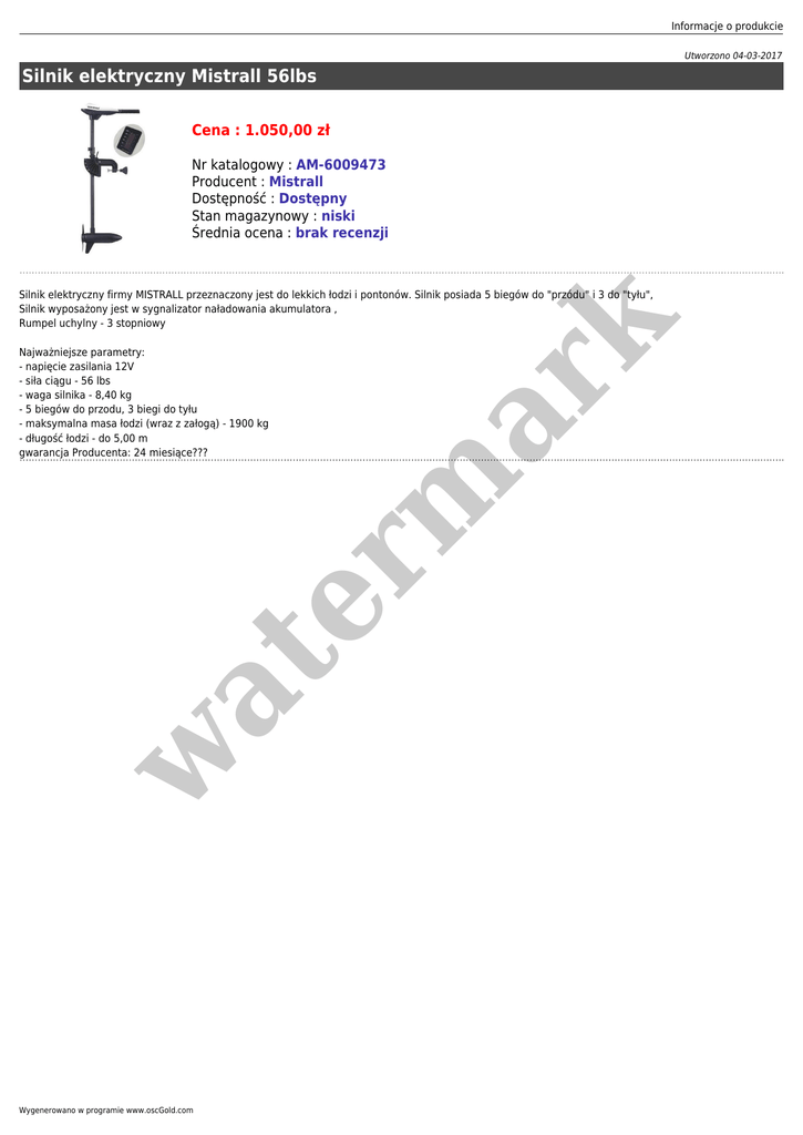 Informacje o produkcie Utworzono 04-03-2017 Silnik elektryczny Mistrall 56lbs Cena : 1.050,00 zł Nr katalogowy : AM-6009473 Producent : Mistrall Dostępność : Dostępny Stan magazynowy : niski Średnia ocena : brak recenzji er m ar k Silnik elektryczny firmy MISTRALL przeznaczony jest do lekkich łodzi i pontonów. Silnik posiada 5 biegów do "przódu" i 3 do "tyłu", Silnik wyposażony jest w sygnalizator naładowania akumulatora , Rumpel uchylny - 3 stopniowy w at Najważniejsze parametry: - napięcie zasilania 12V - siła ciągu - 56 lbs - waga silnika - 8,40 kg - 5 biegów do przodu, 3 biegi do tyłu - maksymalna masa łodzi (wraz z załogą) - 1900 kg - długość łodzi - do 5,00 m gwarancja Producenta: 24 miesiące??? Wygenerowano w programie www.oscGold.com