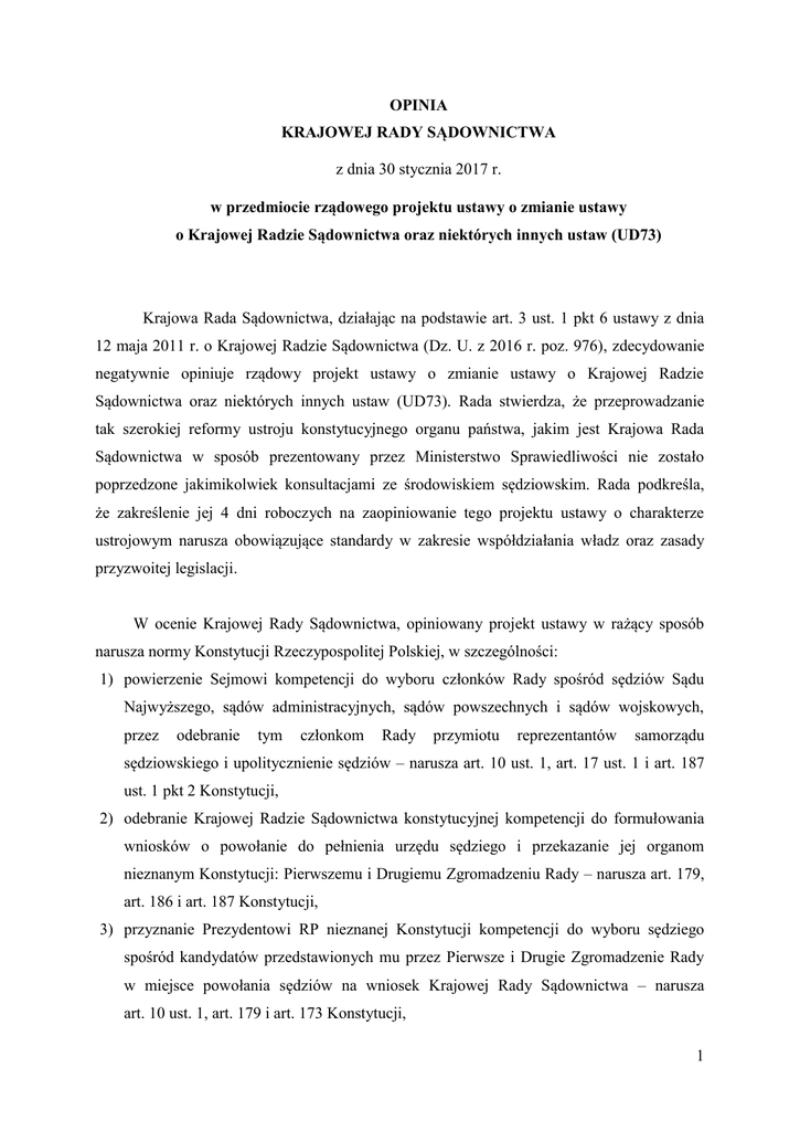 OPINIA KRAJOWEJ RADY SĄDOWNICTWA z dnia 30 stycznia 2017 r. w przedmiocie rządowego projektu ustawy o zmianie ustawy o Krajowej Radzie Sądownictwa oraz niektórych innych ustaw (UD73) Krajowa Rada Sądownictwa, działając na podstawie art. 3 ust. 1 pkt 6 ustawy z dnia 12 maja 2011 r. o Krajowej Radzie Sądownictwa (Dz. U. z 2016 r. poz. 976), zdecydowanie negatywnie opiniuje rządowy projekt ustawy o zmianie ustawy o Krajowej Radzie Sądownictwa oraz niektórych innych ustaw (UD73). Rada stwierdza, że przeprowadzanie tak szerokiej reformy ustroju konstytucyjnego organu państwa, jakim jest Krajowa Rada Sądownictwa w sposób prezentowany przez Ministerstwo Sprawiedliwości nie zostało poprzedzone jakimikolwiek konsultacjami ze środowiskiem sędziowskim. Rada podkreśla, że zakreślenie jej 4 dni roboczych na zaopiniowanie tego projektu ustawy o charakterze ustrojowym narusza obowiązujące standardy w zakresie współdziałania władz oraz zasady przyzwoitej legislacji. W ocenie Krajowej Rady Sądownictwa, opiniowany projekt ustawy w rażący sposób narusza normy Konstytucji Rzeczypospolitej Polskiej, w szczególności: 1) powierzenie Sejmowi kompetencji do wyboru członków Rady spośród sędziów Sądu Najwyższego, sądów administracyjnych, sądów powszechnych i sądów wojskowych, przez odebranie tym członkom Rady przymiotu reprezentantów samorządu sędziowskiego i upolitycznienie sędziów – narusza art. 10 ust. 1, art. 17 ust. 1 i art. 187 ust. 1 pkt 2 Konstytucji, 2) odebranie Krajowej Radzie Sądownictwa konstytucyjnej kompetencji do formułowania wniosków o powołanie do pełnienia urzędu sędziego i przekazanie jej organom nieznanym Konstytucji: Pierwszemu i Drugiemu Zgromadzeniu Rady – narusza art. 179, art. 186 i art. 187 Konstytucji, 3) przyznanie Prezydentowi RP nieznanej Konstytucji kompetencji do wyboru sędziego spośród kandydatów przedstawionych mu przez Pierwsze i Drugie Zgromadzenie Rady w miejsce powołania sędziów na wniosek Krajowej Rady Sądownictwa – narusza art. 10 ust. 1, art. 179 i art. 173 Konstytucji, 1 4) likwidacja równości materialnej głosów członków Rady poprzez przyznanie głosom członków Pierwszego Zgromadzenia Rady (mającego się składać w 70% z polityków) większej wagi niż głosom członków Drugiego Zgromadzenia Rady (mającego się składać z sędziów wybieranych przez większość parlamentarną) – narusza art. 10 ust. 1 i art. 187 ust. 1 Konstytucji, 5) ustalenie trybu postępowania przed Radą w taki sposób, że organ stanie się niezdolny do działania, wobec uzależnienia możliwości wykonywania kompetencji przez ten konstytucyjny organ państwa od jednogłośnych stanowisk poszczególnych Zgromadzeń Rady – narusza art. 10 ust. 1, art. 186 i art. 187 ust. 1 pkt 2 Konstytucji, 6) skrócenie kadencji obecnych członków Rady wybranych spośród sędziów Sądu Najwyższego, sądów administracyjnych, sądów powszechnych i sądów wojskowych na konstytucyjnie gwarantowaną czteroletnią kadencję – narusza art. 187 ust. 3 Konstytucji, 7) odebranie Krajowej Radzie Sądownictwa konstytucyjnej kompetencji do wyboru wiceprzewodniczących Rady i przekazanie jej organom nieznanym Konstytucji: Pierwszemu i Drugiemu Zgromadzeniu Rady – narusza art. 187 ust. 2 Konstytucji. Zdaniem Krajowej Rady Sądownictwa, przedstawiony projekt ustawy zmierza do wprowadzenia do systemu prawnego rozwiązań, które stanowią realne zagrożenie dla ochrony praworządności oraz praw i wolności człowieka i obywatela. * * * Krajowa Rada Sądownictwa jest konstytucyjnym organem państwa, który stoi na straży niezależności sądów i niezawisłości sędziów. Do konstytucyjnych kompetencji Rady należy przedstawianie Prezydentowi Rzeczypospolitej Polskiej wniosków o powołanie sędziów Sądu Najwyższego, sądów administracyjnych, sądów powszechnych i sądów wojskowych, a ponadto występowanie do Trybunału Konstytucyjnego z wnioskami w sprawie zgodności z Konstytucją aktów normatywnych w zakresie, w jakim dotyczą one niezależności sądów i niezawisłości sędziów (art. 186 Konstytucji). Rada jest zatem organem, który stoi na straży niezależności i odrębności władzy sądowniczej w interesie i na rzecz obywateli, którzy mają prawo do niezawisłego wymiaru sprawiedliwości. Niezależność sądów i niezawisłość sędziów nie są bowiem celem samym w sobie, lecz stanowią gwarancję prawa do sądu, przysługującemu każdemu obywatelowi z mocy 2 art. 45 Konstytucji. W państwie demokratycznym, władza sądownicza jest władzą odrębną i niezależną od innych władz (art. 10 i art. 173 Konstytucji) oraz nie podlega władzy wykonawczej ani władzy ustawodawczej. Okoliczności te mają istotne znaczenie dla oceny regulacji zaproponowanych w opiniowanym projekcie. W proponowanych art. 10-12 ustawy, projektodawca proponuje, by to Sejm wybierał piętnastu członków Rady spośród sędziów Sądu Najwyższego, sądów powszechnych, sądów administracyjnych i sądów wojskowych. Dotychczas, członkowie ci pochodzili z wyborów dokonywanych przez przedstawicieli sędziów należących do poszczególnych segmentów i szczebli sądownictwa. W ocenie Krajowej Rady Sądownictwa, proponowany tryb wyboru sędziów wchodzących w skład Krajowej Rady Sądownictwa narusza art. 186 i art. 187 Konstytucji. Konstytucja w art. 187 ust. 1 określa skład Krajowej Rady Sądownictwa, stanowiąc, że tworzą ją: Administracyjnego, Pierwszy Minister Prezes Sądu Najwyższego, Sprawiedliwości, osoba Prezes powołana Naczelnego przez Sądu Prezydenta Rzeczypospolitej, czterech członków wybranych przez Sejm spośród posłów oraz dwóch członków wybranych przez Senat spośród senatorów oraz piętnastu członków wybranych spośród sędziów Sądu Najwyższego, sądów powszechnych, sądów administracyjnych i sądów wojskowych. Rada nie jest zatem przedstawicielem wyłącznie środowiska sędziowskiego