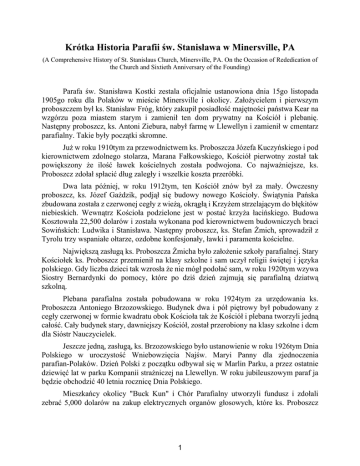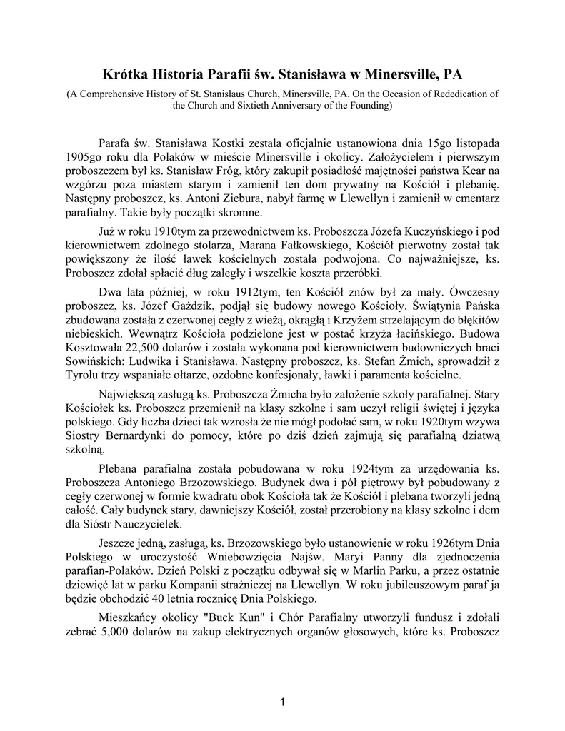 Krótka Historia Parafii św. Stanisława w Minersville, PA (A Comprehensive History of St. Stanislaus Church, Minersville, PA. On the Occasion of Rededication of the Church and Sixtieth Anniversary of the Founding) Parafa św. Stanisława Kostki zestala oficjalnie ustanowiona dnia 15go listopada 1905go roku dla Polaków w mieście Minersville i okolicy. Założycielem i pierwszym proboszczem był ks. Stanisław Fróg, który zakupił posiadłość majętności państwa Kear na wzgórzu poza miastem starym i zamienił ten dom prywatny na Kościół i plebanię. Następny proboszcz, ks. Antoni Ziebura, nabył farmę w Llewellyn i zamienił w cmentarz parafialny. Takie były początki skromne. Już w roku 1910tym za przewodnictwem ks. Proboszcza Józefa Kuczyńskiego i pod kierownictwem zdolnego stolarza, Marana Fałkowskiego, Kościół pierwotny został tak powiększony że ilość ławek kościelnych została podwojona. Co najważniejsze, ks. Proboszcz zdołał spłacić dług zaległy i wszelkie koszta przeróbki. Dwa lata później, w roku 1912tym, ten Kościół znów był za mały. Ówczesny proboszcz, ks. Józef Gażdzik, podjął się budowy nowego Kościoły. Świątynia Pańska zbudowana została z czerwonej cegły z wieżą, okrągłą i Krzyżem strzelającym do błękitów niebieskich. Wewnątrz Kościoła podzielone jest w postać krzyża łacińskiego. Budowa Kosztowała 22,500 dolarów i została wykonana pod kierownictwem budowniczych braci Sowińskich: Ludwika i Stanisława. Następny proboszcz, ks. Stefan Żmich, sprowadził z Tyrolu trzy wspaniałe ołtarze, ozdobne konfesjonały, ławki i paramenta kościelne. Największą zasługą ks. Proboszcza Żmicha było założenie szkoły parafialnej. Stary Kościołek ks. Proboszcz przemienił na klasy szkolne i sam uczył religii świętej i języka polskiego. Gdy liczba dzieci tak wzrosła że nie mógł podołać sam, w roku 1920tym wzywa Siostry Bernardynki do pomocy, które po dziś dzień zajmują się parafialną dziatwą szkolną. Plebana parafialna została pobudowana w roku 1924tym za urzędowania ks. Proboszcza Antoniego Brzozowskiego. Budynek dwa i pół piętrowy był pobudowany z cegły czerwonej w formie kwadratu obok Kościoła tak że Kościół i plebana tworzyli jedną całość. Cały budynek stary, dawniejszy Kościół, został przerobiony na klasy szkolne i dcm dla Sióstr Nauczycielek. Jeszcze jedną, zasługą, ks. Brzozowskiego było ustanowienie w roku 1926tym Dnia Polskiego w uroczystość Wniebowzięcia Najśw. Maryi Panny dla zjednoczenia parafian-Polaków. Dzień Polski z początku odbywał się w Marlin Parku, a przez ostatnie dziewięć lat w parku Kompanii strażniczej na Llewellyn. W roku jubileuszowym paraf ja będzie obchodzić 40 letnia rocznicę Dnia Polskiego. Mieszkańcy okolicy "Buck Kun" i Chór Parafialny utworzyli fundusz i zdołali zebrać 5,000 dolarów na zakup elektrycznych organów głosowych, które ks. Proboszcz 1 Władysław Rakowski poświęcił dnia 4go lipca 1927go roku. Organy te służą do dziś dnia do upiększenia wszelkich nabożeństw kościelnych. Dzielnica do tego czasu wokoło Kościoła, plebani i szkoły, była prawdziwie wiejska. Ks. Proboszcz Władysław Dąbrowski za pomocą, władz miejskich zdołał wyasfaltować ulice Spruce i Oak, założył chodniki konkretowe i w ten sposób zdołał nadać tej okolicy widok miejski. Następnie ks. Proboszcz Dąbrowski wziął się do wykończenia wnętrza Kościoła. Za pomocą ofiar towarzystw i ofiar osobistych parafian wstawił 22 witraże ze szkoła kolorowego, sprowadzone z Bawarii. Dzisiaj te witraże są zaasekurowane w sumie 37,500 dolarów. Następnie, ks. Proboszcz zaprowadził oświetlenie elektryczne w Kościele, sprowadził przepiękne stacje Drogi Krzyżowej i dał nową podłogę z masy korkowej. Wreszcie, wynajął znanego artystę Europejskiego, Pawła Daubner, do wymalowania Kościoła. Cały Kościół był wymalowany na kolor marmuru granaściego, ołtarze na biało, na ścianach były żywe obrazy świętych Pańskich i aniołów Bożych. Dnia 3go grudnia 1936go roku ks. Biskup Hugh Lamb, sufragan Archidiecezji Filadelfijskiej, poświęcił ten odnowiony Kościół. Niestety, nagła śmierć dnia 20go stycznia 1939go roku przerwała pasmo życia dzielnego ks. Proboszcza Dąbrowskiego. Ks. Biskup George Leech z diecezji Harrisburg, kolega szkolny ks. Władysława, odprawił nabożeństwo żałobne za duszę zmarłego przy licznym udziale księży, sióstr i wszystkich parafian i znajomych. Następca ks. Dąbrowskiego, ks. Proboszcz Leon Krajewski, pasterzował w tutejszej parafii 21 lat i dokonał wiele ulepszeń i wielce pomógł parafii się rozrastać. Najsamprzód, ks. Proboszcz zakupił farmę przy 3ciej ulicy na końcu miasta w maju 1944go roku i przez dwa lata za pomocą ks. Sebastiana Babiarz zamienił tę farmę w cmentarz parafialny z podziałem na loty, ogrodzeniem, drogą kamienną i Statuami Ukrzyżowania. Koszt wynosił 11,000 dolarów. Poświęcenie nowego cmentarza odbyło się dnia 30go maja 1947go roku. Ten cmentarz oficjalnie został otwarty w kwietniu 1948go roku. W roku 1949tym ks. Proboszcz Krajewski spłacił wszystkich uczestników korporacji "Union Hall" i nabył tę halę na własność parafialną. Od wielu lat tę halę używał lokal górników, "Minersville Local 1640 of the United Mine Workers of America", ma swoje zebrania i zabawy. Teraz parafa pod przewodnictwem ks. Edwarda Musiał zabrała się do odnowienia tej hali. Dnia 2go maja 1951go roku odbyła się dedykacja pięknym programem i tańcem. I teraz za 16,000 dolarów parafa posiadała własną halę parafialną, która do dziś dnia jest używana na posiedzenia, zebrania i zabawy społeczne i lokal do gry w piłkę koszykową przez dzieci i młodzież parafialną. W roku 1954tym Ks. Proboszcz Krajewski zakupił posiadłość familii Fałkowskich i Parnell z przyległymi lotami naprzeciw szkoły parafialnej