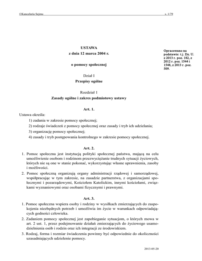 ©Kancelaria Sejmu s. 1/79 USTAWA z dnia 12 marca 2004 r. Opr acowano na podstawie: t.j. Dz. U. z 2013 r . poz. 182, z 2012 r . poz. 1544 i 1548, z 2013 r . poz. 509. o pomocy społecznej Dział I Przepisy ogólne Rozdział 1 Zasady ogólne i zakres podmiotowy ustawy Art. 1. Ustawa określa: 1) zadania w zakresie pomocy społecznej; 2) rodzaje świadczeń z pomocy społecznej oraz zasady i tryb ich udzielania; 3) organizację pomocy społecznej; 4) zasady i tryb postępowania kontrolnego w zakresie pomocy społecznej. Art. 2. 1. Pomoc społeczna jest instytucją polityki społecznej państwa, mającą na celu umożliwienie osobom i rodzinom przezwyciężanie trudnych sytuacji życiowych, których nie są one w stanie pokonać, wykorzystując własne uprawnienia, zasoby i możliwości. 2. Pomoc społeczną organizują organy administracji rządowej i samorządowej, współpracując w tym zakresie, na zasadzie partnerstwa, z organizacjami społecznymi i pozarządowymi, Kościołem Katolickim, innymi kościołami, związkami wyznaniowymi oraz osobami fizycznymi i prawnymi. Art. 3. 1. Pomoc społeczna wspiera osoby i rodziny w wysiłkach zmierzających do zaspokojenia niezbędnych potrzeb i umożliwia im życie w warunkach odpowiadających godności człowieka. 2. Zadaniem pomocy społecznej jest zapobieganie sytuacjom, o których mowa w art. 2 ust. 1, przez podejmowanie działań zmierzających do życiowego usamodzielnienia osób i rodzin oraz ich integracji ze środowiskiem. 3. Rodzaj, forma i rozmiar świadczenia powinny być odpowiednie do okoliczności uzasadniających udzielenie pomocy. 2013-05-20 ©Kancelaria Sejmu s. 2/79 4. Potrzeby osób i rodzin korzystających z pomocy powinny zostać uwzględnione, jeżeli odpowiadają celom i mieszczą się w możliwościach pomocy społecznej. Art. 4. Osoby i rodziny korzystające z pomocy społecznej są obowiązane do współdziałania w rozwiązywaniu ich trudnej sytuacji życiowej. Art. 5. Prawo do świadczeń z pomocy społecznej, jeżeli umowy międzynarodowe nie stanowią inaczej, przysługuje: 1) osobom posiadającym obywatelstwo polskie mającym miejsce zamieszkania i przebywającym na terytorium Rzeczypospolitej Polskiej; 2) cudzoziemcom mającym miejsce zamieszkania i przebywającym na terytorium Rzeczypospolitej Polskiej: a) na podstawie zezwolenia na osiedlenie się, zezwolenia na pobyt rezydenta długoterminowego Wspólnot Europejskich, zezwolenia na zamieszkanie na czas oznaczony udzielonego w związku z okolicznością, o której mowa w art. 53 ust. 1 pkt 13 ustawy z dnia 13 czerwca 2003 r. o cudzoziemcach (Dz. U. z 2011 r. Nr 264, poz. 1573 oraz z 2012 r. poz. 589 i 769), lub w związku z uzyskaniem w Rzeczypospolitej Polskiej statusu uchodźcy lub ochrony uzupełniającej, b) na podstawie zgody na pobyt tolerowany – w formie schronienia, posiłku, niezbędnego ubrania oraz zasiłku celowego; 3) mającym miejsce zamieszkania i przebywającym na terytorium Rzeczypospolitej Polskiej obywatelom państw członkowskich Unii Europejskiej, państw członkowskich Europejskiego Porozumienia o Wolnym Handlu (EFTA) – stron umowy o Europejskim Obszarze Gospodarczym lub Konfederacji Szwajcarskiej oraz członkom ich rodzin w rozumieniu art. 2 pkt 4 ustawy z dnia 14 lipca 2006 r. o wjeździe na terytorium Rzeczypospolitej Polskiej, pobycie oraz wyjeździe z tego terytorium obywateli państw członkowskich Unii Europejskiej i członków ich rodzin (Dz. U. Nr 144, poz. 1043, z późn. zm. 1)), posiadającym prawo pobytu lub prawo stałego pobytu na terytorium Rzeczypospolitej Polskiej. Art. 5a. Prawo do świadczeń w formie interwencji kryzysowej, schronienia, posiłku, niezbędnego ubrania oraz zasiłku celowego przysługuje cudzoziemcom, o których mowa w art. 53 ust. 1 pkt 15 oraz art. 53a ust. 2 pkt 4 ustawy z dnia 13 czerwca 2003 r. o cudzoziemcach. Art. 6. Użyte w ustawie określenia oznaczają: 1) Zmiany wymienionej ustawy zostały ogłoszone w Dz. U. z 2007 r. Nr 120, poz. 818, z 2008 r. Nr 216, poz. 1367, z 2010 r. Nr 81, poz. 531 oraz z 2011 r. Nr 92, poz. 532. 2013-05-20 ©Kancelaria Sejmu s. 3/79 1) całkowita niezdolność do pracy – całkowitą niezdolność do pracy w rozumieniu przepisów o emeryturach i rentach z Funduszu Ubezpieczeń Społecznych albo zaliczenie do I lub II grupy inwalidów lub legitymowanie się znacznym lub umiarkowanym stopniem niepełnosprawności w rozumieniu przepisów o rehabilitacji zawodowej i społecznej oraz zatrudnianiu osób niepełnosprawnych; 2) dochód dziecka – dochód, do którego zalicza się kwotę otrzymywanej renty wraz z dodatkiem dla sierot zupełnych, zasiłek pielęgnacyjny, dodatek pielęgnacyjny, otrzymywane alimenty oraz kwotę odpowiadającą dochodom uzyskiwanym z majątku dziecka; 3) dochód na osobę w rodzinie – dochód rodziny podzielony przez liczbę osób w rodzinie; 4) dochód rodziny – sumę miesięcznych dochodów osób w rodzinie; 5) jednostka organizacyjna pomocy społecznej – regionalny ośrodek polityki społecznej, powiatowe centrum pomocy rodzinie, ośrodek pomocy społecznej, dom pomocy społecznej, placówkę specjalistycznego poradnictwa, w tym rodzinnego, ośrodek wsparcia i ośrodek interwencji kryzysowej; 6) kontrakt socjalny – pisemną umowę zawartą z osobą ubiegającą się o pomoc, określającą uprawnienia i zobowiązania stron umowy, w ramach wspólnie podejmowanych działań zmierzających do przezwyciężenia trudnej sytuacji życiowej osoby lub rodziny; 7) niezdolność do pracy z tytułu wieku – osiągnięcie wieku emerytalnego określonego w art. 24 ust. 1a i 1b oraz w art. 27 ust. 2 i 3 ustawy z dnia 17 grudnia 1998 r. o emeryturach i rentach z Funduszu Ubezpieczeń Społecznych (Dz. U. z 2009 r. Nr 153, poz. 1227, z późn. zm. 2)); 8) osoba bezdomna – osobę niezamieszkującą w lokalu mieszkalnym w rozumieniu przepisów o ochronie praw lokatorów i mieszkaniowym zasobie gminy i niezameldowaną na pobyt stały, w rozumi