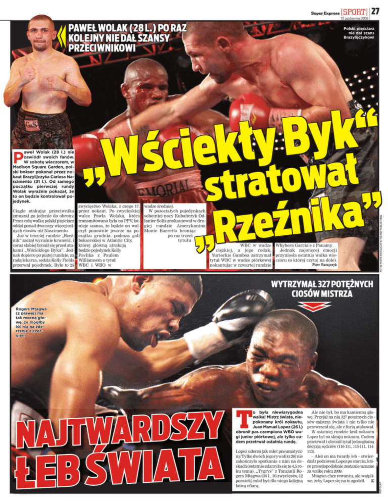 Super Express [sport] 27 12 października 2009 PAWEŁ WOLAK (28 L.) PO RAZ KOLEJNY NIE DAŁ SZANSY PRZECIWNIKOWI P Ciągle atakując przeciwnika zmuszał go jedynie do obrony. Przez całą walkę polski pięściarz oddał ponad dwa razy więcej celnych ciosów niż Nascimento. Już w trzeciej rundzie „Rzeźnik” zaczął wyraźnie krwawić, i coraz słabiej bronił się przed atakami „Wściekłego Byka”. Jednak dopiero po piątej rundzie, za radą lekarza, sędzia Kelly Fields przerwał pojedynek. Było to 25 “ k y B y ł k e i c ś W „ zwycięstwo Wolaka, z czego 17. przez nokaut. Po zwycięskiej walce Pawła Wolaka, która transmitowana była na PPV, istnieje szansa, że będzie on walczył ponownie jeszcze na początku grudnia, podczas gali bokserskiej w Atlantic City, której główną atrakcją będzie pojedynek Kelly Pavlika z Paulem Williamsem o tytuł WBC i WBO w ł a w o t a r t s ” a k i n ź e z „R wadze średniej. W pozostałych pojedynkach sobotniej nocy Kubańczyk Odlanier Solis znokautował w drugiej rundzie Amerykanina Monte Barretta broniąc po raz trzeci tytułu WBC w wadze ciężkiej, a jego rodak, Yuriorkis Gamboa zatrzymał tytuł WBC w wadze piórkowej nokautując w czwartej rundzie Whybera Garcia’e z Panamy. Jednak najwięcej emocji przyniosła ostatnia walka wieczoru (o której czytaj na dole). Piotr Ratajczyk FOTO PIOTR RATAJCZYK/ ECHO PUBLISHING aweł Wolak (28 l.) nie zawiódł swoich fanów. W sobotę wieczorem, w Madison Square Garden, polski bokser pokonał przez nokaut Brazylijczyka Carlosa Nascimento (31 l.). Od samego początku pierwszej rundy Wolak wyraźnie pokazał, że to on będzie kontrolował pojedynek. Polski pięściarz nie dał szans Brazylijczykowi WYtRZYmAŁ 327 POtężNYCh CIOSóW mIStRZA Ro Rogers gers Mta Mtagwa gwa (z (z pra prawej) wej) ma ma tak tak moc mocną ną gło gło-wę, wę, że że mógł mógłby by iść iść nią nią na na zde zde-rze rzenie nie zz czoł czoł-giem giem T Ale nie był, bo ma kamienną głowę. Przyjął na nią 327 potężnych cio sów mistrza świata i nie tylko nie przewracał się, ale z furią atakował. W ostatniej rundzie król nokautu Lopez był na skraju nokautu. Cudem przetrwał i obronił tytuł jednogłośną decyzją sędziów (116-111, 115-111, 114Lopez uderza jak młot pneumatycz- 113). – Ależ on ma twardy łeb – stwierny. Tylko dwóch jego rywali (z 26) nie zakończyło spotkania z nim na de - dził z podziwem Lopez po starciu, któskach (ostatnio zdarzyło się to 4,5 ro - re prawdopodobnie zostanie uznane ku temu). „Tygrys” z Tanzanii Ro - za walkę roku 2009. Mtagwa chce rewanżu, ale wątpligers Mtagwa (30 l., 26 zwycięstw, 12 porażek) miał być dla niego kolejną we, żeby Lopez się na to zgodził. JC łatwą ofiarą. FOTO AP o była niewiarygodna walka! Mistrz świata, niepokonany król nokautu, Juan Manuel Lopez (26 l.) obronił pas czempiona WBO wagi junior piórkowej, ale tylko cudem przetrwał ostatnią rundę.
