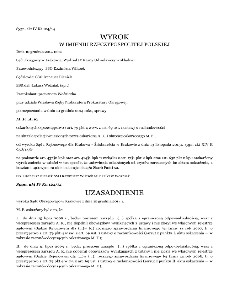 Sygn. akt IV Ka 124/14 WYROK W IMIENIU RZECZYPOSPOLITEJ POLSKIEJ Dnia 10 grudnia 2014 roku Sąd Okręgowy w Krakowie, Wydział IV Karny Odwoławczy w składzie: Przewodniczący: SSO Kazimierz Wilczek Sędziowie: SSO Ireneusz Bieniek SSR del. Łukasz Woźniak (spr.) Protokolant: prot.Aneta Woźniczka przy udziale Wiesława Zięby Prokuratora Prokuratury Okręgowej, po rozpoznaniu w dniu 10 grudnia 2014 roku, sprawy M. F., A. K. oskarżonych o przestępstwo z art. 79 pkt 4 w zw. z art. 69 ust. 1 ustawy o rachunkowości na skutek apelacji wniesionych przez oskarżoną A. K. i obrońcę oskarżonego M. F., od wyroku Sądu Rejonowego dla Krakowa - Śródmieścia w Krakowie z dnia 13 listopada 2013r. sygn. akt XIV K 638/13/S na podstawie art. 437§2 kpk oraz art. 414§1 kpk w związku z art. 17§1 pkt 2 kpk oraz art. 632 pkt 2 kpk zaskarżony wyrok zmienia w całości w ten sposób, że uniewinnia oskarżonych od czynów zarzuconych im aktem oskarżenia, a kosztami sądowymi za obie instancje obciąża Skarb Państwa. SSO Ireneusz Bieniek SSO Kazimierz Wilczek SSR Łukasz Woźniak Sygn. akt IV Ka 124/14 UZASADNIENIE wyroku Sądu Okręgowego w Krakowie z dnia 10 grudnia 2014 r. M. F. oskarżony był o to, że: I. do dnia 15 lipca 2008 r., będąc prezesem zarządu (...) spółka z ograniczoną odpowiedzialnością, wraz z wiceprezesem zarządu A. K., nie dopełnił obowiązków wynikających z ustawy i nie złożył we właściwym rejestrze sądowym (Sądzie Rejonowym dla (...)w K.) rocznego sprawozdania finansowego tej firmy za rok 2007, tj. o przestępstwo z art. 79 pkt 4 w zw. z art. 69 ust. 1 ustawy o rachunkowości (zarzut z punktu I. aktu oskarżenia — w zakresie zarzutów dotyczących oskarżonego M. F.); II. do dnia 15 lipca 2009 r., będąc prezesem zarządu (...) spółka z ograniczoną odpowiedzialnością, wraz z wiceprezesem zarządu A. K. nie dopełnił obowiązków wynikających z ustawy i nie złożył we właściwym rejestrze sądowym (Sądzie Rejonowym dla (...)w (...)) rocznego sprawozdania finansowego tej firmy za rok 2008, tj. o przestępstwo z art. 79 pkt 4 w zw. z art. 69 ust. 1 ustawy o rachunkowości (zarzut z punktu II. aktu oskarżenia — w zakresie zarzutów dotyczących oskarżonego M. F.); III. do dnia 15 lipca 2010 r., będąc prezesem zarządu (...) spółka z ograniczoną odpowiedzialnością, wraz z wiceprezesem zarządu A. K., nie dopełnił obowiązków wynikających z ustawy i nie złożył we właściwym rejestrze sądowym (Sądzie Rejonowym dla (...)w K.) rocznego sprawozdania finansowego tej firmy za rok 2009, tj. o przestępstwo z art. 79 pkt 4 w zw. z art. 69 ust. 1 ustawy o rachunkowości (zarzut z punktu III. aktu oskarżenia — w zakresie zarzutów dotyczących oskarżonego M. F.); IV. do dnia 15 lipca 2011 r., będąc prezesem zarządu (...) spółka z ograniczoną odpowiedzialnością, wraz z wiceprezesem zarządu A. K. nie dopełnił obowiązków wynikających z ustawy i nie złożył we właściwym rejestrze sądowym (Sądzie Rejonowym dla (...)w K.) rocznego sprawozdania finansowego tej firmy za rok 2010, tj. o przestępstwo z art. 79 pkt 4 w zw. z art. 69 ust. 1 ustawy o rachunkowości (zarzut z punktu IV. aktu oskarżenia — w zakresie zarzutów dotyczących oskarżonego M. F.). A. K. oskarżona była o to, że: V. do dnia 15 lipca 2008 r., będąc wiceprezesem zarządu (...) spółka z ograniczoną odpowiedzialnością, wraz z prezesem zarządu M. F. nie dopełniła obowiązków wynikających z ustawy i nie złożyła we właściwym rejestrze sądowym (Sądzie Rejonowym dla (...)w K.) rocznego sprawozdania finansowego tej firmy za rok 2007, tj. o przestępstwo z art. 79 pkt 4 w zw. z art. 69 ust. 1 ustawy o rachunkowości (zarzut z punktu I. aktu oskarżenia — w zakresie zarzutów dotyczących oskarżonej A. K.); VI. do dnia 15 lipca 2009 r., będąc wiceprezesem zarządu (...) spółka z ograniczoną odpowiedzialnością, wraz z prezesem zarządu M. F. nie dopełniła obowiązków wynikających z ustawy i nie złożyła we właściwym rejestrze sądowym (Sądzie Rejonowym dla (...)w K.) rocznego sprawozdania finansowego tej firmy za rok 2008, tj. o przestępstwo z art. 79 pkt 4 w zw. z art. 69 ust. 1 ustawy o rachunkowości (zarzut z pkt II aktu oskarżenia — w zakresie zarzutów dotyczących oskarżonej A. K.); VII. do dnia 15 lipca 2010 r., będąc wiceprezesem zarządu (...) spółka z ograniczoną odpowiedzialnością, wraz z prezesem zarządu M. F. nie dopełniła obowiązków wynikających z ustawy i nie złożyła we właściwym rejestrze sądowym (Sądzie Rejonowym dla Krakowa - Śródmieścia w Krakowie) rocznego sprawozdania finansowego tej firmy za rok 2009, tj. o przestępstwo z art. 79 pkt 4 w zw. z art. 69 ust. 1 ustawy o rachunkowości (zarzut z punktu III. aktu oskarżenia — w zakresie zarzutów dotyczących oskarżonej A. K.); VIII. do dnia 15 lipca 2011 r., będąc wiceprezesem zarządu (...) spółka z ograniczoną odpowiedzialnością, wraz z prezesem zarządu M. F. nie dopełniła obowiązków wynikających z ustawy i nie złożyła we właściwym rejestrze sądowym (Sądzie Rejonowym dla (...)w K.) rocznego sprawozdania finansowego tej firmy za rok 2010, tj. o przestępstwo z art. 79 pkt 4 w zw. z art. 69 ust. 1 ustawy o rachunkowości (zarzut z pultu IV. aktu oskarżenia — w zakresie zarzutów dotyczących oskarżonej A. K.). Sąd Rejonowy dla Krakowa-Śródmieścia w Krakowie wyrokiem z dnia 13 listopada 2013 roku sygn. akt XIV K 961/13/ N orzekł w tej sprawie następująco: I. na mocy art. 66 § 1 i 2 k.k. i art. 67 § 1 k.k. postępowanie karne w sprawie przeciwko oskarżonemu M. F. o czyny zarzucane mu w akcie oskarżenia, a opisane powyżej w punktach I, II, III i IV (przy przyjęciu, iż czynów tych oskarżony M. F. dopuścił się odpowiednio: w okresie od dnia 1 stycznia 2008 r. do dnia 15 lipca 2008 r., w okresie od dnia 1 stycznia 2009 r. do dnia 15 lipca 2009 r., w okresie od dnia 1 stycznia 2