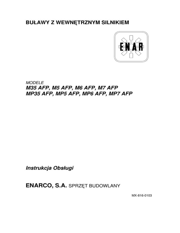 BUŁAWY Z WEWNĘTRZNYM SILNIKIEM MODELE M35 AFP, M5 AFP, M6 AFP, M7 AFP MP35 AFP, MP5 AFP, MP6 AFP, MP7 AFP Instrukcja Obsługi ENARCO, S.A. SPRZĘT BUDOWLANY MX-816-0103 WSTĘP WSTĘP Dziękujemy za zaufanie jakim obdarzyliście Państwo markę ENAR Dla uzyskania maksymalnych korzyści z używania jej sprzętu do wibrowania zalecamy zapoznanie się i zrozumienie norm bezpieczeństwa, użytkowania i obsługi zebranych w poniższej instrukcji. Niesprawne części należy wymienić natychmiast, aby zapobic większym problemom. Żywotność urządzenia zwiększy się przy dokładnym przestrzeganiu wskazań tej instrukcji. W razie jakichkolwiek komentarzy lub sugestii w sprawie naszych urządzeń, jesteśmy do Państwa pełnej dyspozycji. BUŁAWY Z WEWNĘTRZNYM SILNIKIEM 3 SPIS TREŚCI 1.- DANE TECHNICZNE BUŁAW.............................................................................5 2.- WARUNKI UŻYTKOWANIA ...............................................................................6 3.- DZIAŁANIE I OBSŁUGA SPRZĘTU ...................................................................8 3.1.- URUCHOMIENIE....................................................................................... 8 3.2.- DOŁĄCZENIE BUŁAWY DO PRZETWORNICY .........................................8 3.3.- PRZEDŁUŻACZE........................................................................................8 3.4.- INSPEKCJA ................................................................................................9 3.5.- OKRESOWE PRZEGLĄDY.........................................................................9 3.6.- MAGAZYNOWANIE ..................................................................................10 3.7.- TRANSPORT ............................................................................................10 3.8.- SCHEMAT ELEKTRYCZNY......................................................................11 4.- LOKALIZOWANIE AWARII...............................................................................11 5.- ROZKŁAD NA CZĘŚCI I LISTA CZĘŚCI ZAMIENNYCH .................................12 5.1.- BUŁAWA WIBRUJĄCA I ZNAKOWANIE ..................................................12 5.2.- LISTA CZĘŚCI ..........................................................................................13 6.- PORADY DOTYCZĄCE ZAMAWIANIA CZĘŚCI ZAMIENNYCH .....................14 6.1.- INSTRUKCJE DOTYCZĄCE ZAMAWIANIA CZĘŚCI ZAMIENNYCH ......14 6.2.- INSTRUKCJE DOTYCZĄCE UBIEGANIA SIĘ O GWARANCJE ..............14 7.- ZALECENIA DOTYCZĄCE UŻYTKOWANIA....................................................15 BUŁAWY Z WEWNĘTRZNYM SILNIKIEM 4 DANE TECHNICZNE 1 DANE TECHNICZNE BUŁAW M35AFP, M5AFP, M6AFP, M7AFP MP35AFP, MP5AFP, MP6AFP, MP7AFP MODEL TYP Buława z wewnętrznym silnikiem 42 V 3-200 Hz. ZASTOSOWANIE Wgłębna wibracja betonu. KABEL PODŁĄCZENIA DO PRZETWORNICY 10m długości standardowo, z wtyczką typu CE, Izolacja 1 KV. WĄŻ ZABEZPIECZAJĄCY 5m długości, z nieścieralnej gumy, 1m (MP) Tabela 1: Dane techniczne 1 M 35 A F P WAGA (kg) 12 ŚREDNICA (mm) 36 DŁUGOŚĆ (mm) 350 CZĘSTOTLIWOŚĆ NAPIĘCIE 200 Hz – 42 V M5AFP 14 50 400 200 Hz – 42 V M6AFP 15 58 430 200 Hz – 42 V M7AFP 18 65 430 200 Hz – 42 V MODEL Tabela 2: Dane techniczne 2 MODEL M 35 A F P M P 35 A F P M5AFP MP5AFP M6AFP MP6AFP M7AFP MP7AFP NATĘŻENIE WIBRACJE NA MINUTĘ SIŁA ODŚRODKOWA MOŻLIWOŚCI WIBROWANIA (m ³ / godz) 8 12.000 175 kp. Do - # 20 m ³ 12 12.000 375 kp. Do - # 30 m ³ 16 12.000 575 kp. Do - # 35 m ³ 22 12.000 720 kp. Do - # 40 m ³ Tabela 3: Dane techniczne 3 BUŁAWY Z WEWNĘTRZNYM SILNIKIEM 5 WARUNKI UŻYTKOWANIA 2 WARUNKI UŻYTKOWANIA UWAGA! Przeczytaj i zrozum wszystkie instrukcje 1 · · · 1.1 · · · · · · · · · · · · 1.2 · · · · · · · · · . · . PRZESTRZEŃ ROBOCZA UTRZYMUJ swą przestrzeń roboczą w czystości i dobrze oświetloną. NIE URUCHAMIAJ tych urządzeń w pobliżu materiałów wybuchowych, jak również substancji łatwopalnych, gazów i pyłu. UTRZYMUJ z dala od osób nieporządanych, dzieci i odwiedzających podczas gdy narzędzie jest uruchomione. BEZPIECZEŃSTWO ELEKTRYCZNE Narzędzia uziemione muszą być podłączone do gniazdka odpowiednio zainstalowanego i uziemionego, zgodnie ze wszystkimi normami i przepisami NIE USUWAJ końcówki uziemienia i w żaden sposób nie przerabiaj wtyczki. NIE UŻYWAJ żadnego adaptatora wtyczki. ZWERYFIKUJ z kwalifikowanym elektrykiem, jeśli masz jakiekolwiek wątpliwości czy gniazdko jest prawidłowo uziemione. ZAPOBIEGAJ temu, by ciało stykało się z powierzchniami uziemionymi, takimi jak rurociągi, kaloryfery, kuchenki, lodówki. To zwiększa ryzyko porażenia prądem, gdy twoje ciało jest uziemione. NIE WYSTAWIAJ narzędzi na deszcz i wilgoć. Woda dostająca się do urządzenia elektrycznego zwiększa ryzyko porażenia prądem NIE FORSUJ kabla zasilającego. NIGDY NIE UŻYWAJ kabla zasilającego do transportu narzędzia. NIE WYRYWAJ wtyczki z gniazdka. UTRZYMUJ kabel zasilania z dala od gorąca, oleju, i części ruchomych. WYMIEŃ natychmiast uszkodzone kable zasilające. Zniszczone kable zwiększają ryzyko porażenia prądem GDY OBSŁUGUJESZ narzędzie na zewnątrz używaj przedłużacza lub kabla zasilającego typu "H07RN-F", "W-A” lub “W”. BEZPIECZEŃSTWO OSOBISTE BĄDŹ CZUJNY, w tym co robisz i używaj zdrowego rozsądku gdy operujesz narzędziem. NIE UŻYWAJ narzędzia gdy jesteś zmęczony lub jesteś pod wpływem narkotyków, alkoholu lub leku. UBIERAJ SIĘ W ODPOWIEDNI SPOSÓB. NIE NOŚ luźnych ubiorów ani biżuterii. UPNIJ włosy jeśli masz długie. UTRZYMUJ swe włosy, ubiór i rękawice z dala od części ruchomych. UNIKAJ przypadkowych uruchomień. UPEWNIJ SIĘ, że włącznik jest wyłączony przed włączeniem narzędzia do gniazdka. UPRZĄTNIJ klucze i włączniki przed uruchomieniem narzędzia. NIE PRZEKRACZAJ granic swych sił. Zawsze ODŻYWIAJ SIĘ dobrze i w sposób 