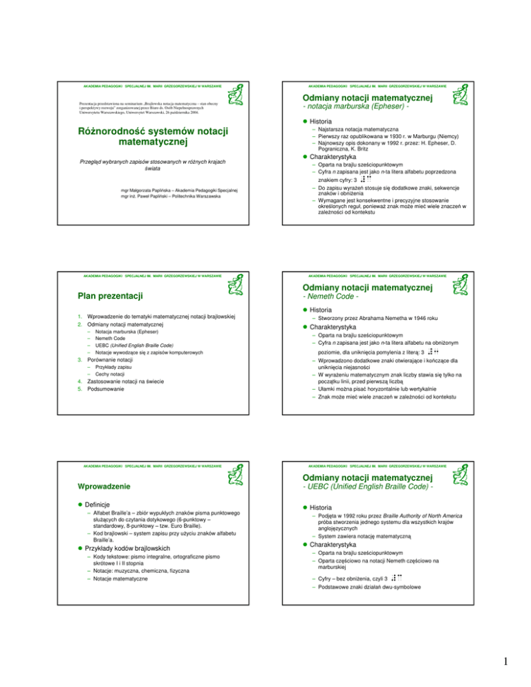AKADEMIA PEDAGOGIKI SPECJALNEJ IM. MARII GRZEGORZEWSKIEJ W WARSZAWIE Prezentacja przedstawiona na seminarium „Brajlowska notacja matematyczna – stan obecny i perspektywy rozwoju” zorganizowanej przez Biuro ds. Osób Niepełnosprawnych Uniwersytetu Warszawskiego, Uniwersytet Warszawski, 26 pa dziernika 2004. Ró norodno systemów notacji matematycznej Przegl d wybranych zapisów stosowanych w ró nych krajach wiata mgr Małgorzata Papli ska – Akademia Pedagogiki Specjalnej mgr in . Paweł Papli ski – Politechnika Warszawska AKADEMIA PEDAGOGIKI SPECJALNEJ IM. MARII GRZEGORZEWSKIEJ W WARSZAWIE Plan prezentacji 1. Wprowadzenie do tematyki matematycznej notacji brajlowskiej 2. Odmiany notacji matematycznej – – – – Notacja marburska (Epheser) Nemeth Code UEBC (Unified English Braille Code) Notacje wywodz ce si z zapisów komputerowych 3. Porównanie notacji – – Przykłady zapisu Cechy notacji 4. Zastosowanie notacji na wiecie 5. Podsumowanie AKADEMIA PEDAGOGIKI SPECJALNEJ IM. MARII GRZEGORZEWSKIEJ W WARSZAWIE Wprowadzenie Definicje – Alfabet Braille’a – zbiór wypukłych znaków pisma punktowego słu cych do czytania dotykowego (6-punktowy – standardowy, 8-punktowy – tzw. Euro Braille). – Kod brajlowski – system zapisu przy u yciu znaków alfabetu Braille’a. Przykłady kodów brajlowskich – Kody tekstowe: pismo integralne, ortograficzne pismo skrótowe I i II stopnia – Notacje: muzyczna, chemiczna, fizyczna – Notacje matematyczne AKADEMIA PEDAGOGIKI SPECJALNEJ IM. MARII GRZEGORZEWSKIEJ W WARSZAWIE Odmiany notacji matematycznej - notacja marburska (Epheser) Historia – Najstarsza notacja matematyczna – Pierwszy raz opublikowana w 1930 r. w Marburgu (Niemcy) – Najnowszy opis dokonany w 1992 r. przez: H. Epheser, D. Pograniczna, K. Britz Charakterystyka – Oparta na brajlu sze ciopunktowym – Cyfra n zapisana jest jako n-ta litera alfabetu poprzedzona znakiem cyfry: 3 – Do zapisu wyra e stosuje si dodatkowe znaki, sekwencje znaków i obni enia – Wymagane jest konsekwentne i precyzyjne stosowanie okre lonych reguł, poniewa znak mo e mie wiele znacze w zale no ci od kontekstu AKADEMIA PEDAGOGIKI SPECJALNEJ IM. MARII GRZEGORZEWSKIEJ W WARSZAWIE Odmiany notacji matematycznej - Nemeth Code Historia – Stworzony przez Abrahama Nemetha w 1946 roku Charakterystyka – Oparta na brajlu sze ciopunktowym – Cyfra n zapisana jest jako n-ta litera alfabetu na obni onym poziomie, dla unikni cia pomylenia z liter : 3 – Wprowadzono dodatkowe znaki otwieraj ce i ko cz ce dla unikni cia niejasno ci – W wyra eniu matematycznym znak liczby stawia si tylko na pocz tku linii, przed pierwsz liczb – Ułamki mo na pisa horyzontalnie lub wertykalnie – Znak mo e mie wiele znacze w zale no ci od kontekstu AKADEMIA PEDAGOGIKI SPECJALNEJ IM. MARII GRZEGORZEWSKIEJ W WARSZAWIE Odmiany notacji matematycznej - UEBC (Unified English Braille Code) Historia – Podj ta w 1992 roku przez Braille Authority of North America próba stworzenia jednego systemu dla wszystkich krajów angloj zycznych – System zawiera notacj matematyczn Charakterystyka – Oparta na brajlu sze ciopunktowym – Oparta cz ciowo na notacji Nemeth cz marburskiej ciowo na – Cyfry – bez obni enia, czyli 3 – Podstawowe znaki działa dwu-symbolowe 1 AKADEMIA PEDAGOGIKI SPECJALNEJ IM. MARII GRZEGORZEWSKIEJ W WARSZAWIE AKADEMIA PEDAGOGIKI SPECJALNEJ IM. MARII GRZEGORZEWSKIEJ W WARSZAWIE Odmiany notacji matematycznej Porównanie notacji - notacje komputerowe - - UEBC - Ogólna charakterystyka 2 13 x 2 + 3 4 73 − y – Wywodz si z notacji stosowanych w komputerowych zapisach wyra e matematycznych (j zyki programowania, składu tekstu itp.) – Preferuj alfabet 8-punktowy, który pozwala na zapisanie zestawu znaków ASCII (8 bitów) Odmiany (przykłady) – ASCII – standardowy zapis linearny stosowany w j zykach programowania (nie mo na zapisa skomplikowanych wyra e ) – GS Braille – (Gardner, Salinas) notacja inspirowana zapisem stosowanym w systemie LaTeX – SMSB (Stuttgarter Mathematikschrift für Blinde) – powstała w 1980 roku notacja upraszczaj ca system marburski i upodabniaj ca go do zapisu wizualnego z my l o nauczaniu integracyjnym Zapis bez spacji ! " Zapis ze spacjami ! AKADEMIA PEDAGOGIKI SPECJALNEJ IM. MARII GRZEGORZEWSKIEJ W WARSZAWIE " AKADEMIA PEDAGOGIKI SPECJALNEJ IM. MARII GRZEGORZEWSKIEJ W WARSZAWIE Porównanie notacji Porównanie notacji - przykłady zapisu: notacja marburska - - przykłady zapisu: notacje komputerowe - 2 13 x 2 + 3 4 73 − y ASCII Zapis pełny SMSB Zapis skrócony AKADEMIA PEDAGOGIKI SPECJALNEJ IM. MARII GRZEGORZEWSKIEJ W WARSZAWIE AKADEMIA PEDAGOGIKI SPECJALNEJ IM. MARII GRZEGORZEWSKIEJ W WARSZAWIE Porównanie notacji Porównanie notacji - przykłady zapisu: Nemeth Code - 2 13 x 2 + 3 4 73 − y Zapis horyzontalny Zapis wertykalny - cechy notacji Notacja Notacja marburska Nemeth Code UEBC Notacje komputero we (ogólnie) Czytelno dotykowa Ilo znaków (w omawianym przykładzie) Zrozumiało intuicyjna Łatwo translacji Zastosowanie w nauczaniu integracyjnym + 23 ? +/- - + 31 ? +/- +/- + 29 ? +/- - +/- n/d ? + + 2 AKADEMIA PEDAGOGIKI SPECJALNEJ IM. MARII GRZEGORZEWSKIEJ W WARSZAWIE Zastosowanie notacji na wiecie - podsumowanie Notacja USA Anglia Notacja marburska Niemcy + Nemeth Code UEBC Notacje komputerowe (ogólnie) + Szwajcaria Czechy Polska + + +/- + +/- +/- +/- +/- +/- +/- +/- +/- AKADEMIA PEDAGOGIKI SPECJALNEJ IM. MARII GRZEGORZEWSKIEJ W WARSZAWIE Podsumowanie Klasyczne notacje – Nie ró ni si zasadniczo pod wzgl dem koncepcji systemu – Ró ni si : symbolami operatorów, znaków działa – Wprowadzane udoskonalenia jednej cechy cz sto pogarszaj inn Notacje komputerowe – Nie s powszechne – Mimo niew tpliwych zalet wymuszaj dodatkowe uczenie si całkowicie nowych systemów... Postulat – Nale y d y do unifikacji systemu notacji 3
