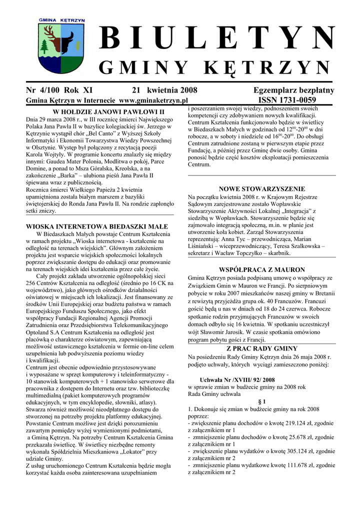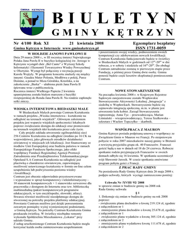 BIULETYN GMINY KĘTRZYN Nr 4/100 Rok XI 21 kwietnia 2008 Gmina Kętrzyn w Internecie www.gminaketrzyn.pl W HOŁDZIE JANOWI PAWŁOWI II Dnia 29 marca 2008 r., w III rocznicę śmierci Największego Polaka Jana Pawła II w bazylice kolegiackiej św. Jerzego w Kętrzynie wystąpił chór „Bel Canto” z Wyższej Szkoły Informatyki i Ekonomii Towarzystwa Wiedzy Powszechnej w Olsztynie. Występ był połączony z recytacją poezji Karola Wojtyły. W programie koncertu znalazły się między innymi: Gaudea Mater Polonia, Modlitwa o pokój, Parce Domine, a ponad to Msza Góralska, Kreolska, a na zakończenie „Barka” – ulubiona pieśń Jana Pawła II śpiewana wraz z publicznością. Rocznica śmierci Wielkiego Papieża 2 kwietnia upamiętniona została białym marszem z bazyliki świętojerskiej do Ronda Jana Pawła II. Na rondzie zapłonęło setki zniczy. WIOSKA INTERNETOWA BIEDASZKI MAŁE W Biedaszkach Małych powstaje Centrum Kształcenia w ramach projektu „Wioska internetowa - kształcenie na odległość na terenach wiejskich”. Głównym założeniem projektu jest wsparcie wiejskich społeczności lokalnych poprzez zwiększanie dostępu do edukacji oraz promowanie na terenach wiejskich idei kształcenia przez całe życie. Cały projekt zakłada utworzenie ogólnopolskiej sieci 256 Centrów Kształcenia na odległość (średnio po 16 CK na województwo), jako głównych ośrodków działalności oświatowej w miejscach ich lokalizacji. Jest finansowany ze środków Unii Europejskiej oraz budżetu państwa w ramach Europejskiego Funduszu Społecznego, jako efekt współpracy Fundacji Regionalnej Agencji Promocji Zatrudnienia oraz Przedsiębiorstwa Telekomunikacyjnego Optoland S.A Centrum Kształcenia na odległość jest placówką o charakterze oświatowym, zapewniającą możliwość ustawicznego kształcenia w formie on-line celem uzupełnienia lub podwyższenia poziomu wiedzy i kwalifikacji. Centrum jest obecnie odpowiednio przystosowywane i wyposażane w sprzęt komputerowy i teleinformatyczny 10 stanowisk komputerowych + 1 stanowisko serwerowe dla pracownika z dostępem do Internetu oraz tzw. biblioteczkę multimedialną (pakiet komputerowych programów edukacyjnych, w tym encyklopedie, słowniki, atlasy). Stwarza również możliwość nieodpłatnego dostępu do stworzonej na potrzeby projektu platformy edukacyjnej. Powstanie Centrum możliwe jest dzięki porozumieniu zawartym pomiędzy wyżej wymienionymi podmiotami, a Gminą Kętrzyn. Na potrzeby Centrum Kształcenia Gmina przekazała świetlicę. W świetlicy niezbędne remonty wykonała Spółdzielnia Mieszkaniowa „Lokator” przy udziale Gminy. Z usług uruchomionego Centrum Kształcenia będzie mogła korzystać każda osoba zainteresowana uzupełnianiem Egzemplarz bezpłatny ISSN 1731-0059 i poszerzaniem swojej wiedzy, podnoszeniem swoich kompetencji czy zdobywaniem nowych kwalifikacji. Centrum Kształcenia funkcjonowało będzie w świetlicy w Biedaszkach Małych w godzinach od 1200-2000 w dni robocze, a w soboty i niedziele od 1600-2000. Do obsługi Centrum zatrudnione zostaną w pierwszym etapie przez Fundację, a później przez Gminę dwie osoby. Gmina ponosić będzie część kosztów eksploatacji pomieszczenia Centrum. NOWE STOWARZYSZENIE Na początku kwietnia 2008 r. w Krajowym Rejestrze Sądowym zarejestrowane zostało Wopławskie Stowarzyszenie Aktywności Lokalnej „Integracja” z siedzibą w Wopławkach. Stowarzyszenie będzie się zajmowało integracją społeczną, m.in. w planie jest utworzenie koła kobiet. Zarząd Stowarzyszenia reprezentują: Anna Tyc – przewodnicząca, Marian Liśniański – wiceprzewodniczący, Teresa Szalkowska – sekretarz i Wacław Topczyłko – skarbnik. WSPÓŁPRACA Z MAURON Gmina Kętrzyn posiada podpisaną umowę o współpracy ze Związkiem Gmin w Mauron we Francji. Po sierpniowym pobycie w roku 2007 mieszkańców naszej gminy w Bretanii z rewizytą przyjeżdża grupa ok. 40 Francuzów. Francuzi gościć będą u nas w dniach od 18 do 24 czerwca. Robocze spotkanie rodzin przyjmujących Francuzów w swoich domach odbyło się 16 kwietnia. W spotkaniu uczestniczył wójt Sławomir Jarosik. W czasie spotkania omówiono program pobytu gości z Francji. Z PRAC RADY GMINY Na posiedzeniu Rady Gminy Kętrzyn dnia 26 maja 2008 r. podjęto uchwały, których wyciągi zamieszczono poniżej: Uchwała Nr /XVIII/ 92/ 2008 w sprawie zmian w budżecie gminy na 2008 rok Rada Gminy uchwala §1 1. Dokonuje się zmian w budżecie gminy na rok 2008 poprzez: - zwiększenie planu dochodów o kwotę 219.124 zł, zgodnie z załącznikiem nr 1 - zmniejszenie planu dochodów o kwotę 25.678 zł, zgodnie z załącznikiem nr 1 - zwiększenie planu wydatków o kwotę 305.124 zł, zgodnie z załącznikiem nr 2 - zmniejszenie planu wydatkowe kwotę 111.678 zł, zgodnie z załącznikiem nr 2 2. Budżet gminy po zmianach wynosi: - plan dochodów ogółem : 21.036.385 zł - plan wydatków ogółem : 24.036.671 zł §2 1. Limity wydatków na wieloletnie programy inwestycyjne w latach 2008 - 2010, zgodnie z załącznikiem nr 3. Wydatki inwestycyjne w 2008 r. W wysokości 4.917.000 zł, zgodnie z załącznikiem nr 3, 3a. 2. Dochody i wydatki związane z realizacją zadań z zakresu administracji rządowej i innych zadań zleconych odrębnymi ustawami w 2008 roku, zgodnie z załącznikiem nr 4. Uchwała Nr XVIII / 93 / 08 W sprawie uchylenia Uchwały Nr XVI/86/2008 Rady Gminy Kętrzyn z dnia 06 lutego 2008r. w sprawie przystąpienia do Związku Stowarzyszeń na rzecz Rozwoju Gmin Zlewni Rzeki Guber i wyznaczenia przedstawiciela do prac w stowarzyszeniu. Rada Gminy uchwala, co następuje: §1 Rada Gminy Kętrzyn uchyla Uchwałę Nr XVI/86/2008 Rady Gminy Kętrzyn z dnia 06 lutego 2008 r. w sprawie przystąpienia do Związku Stowarzyszeń na rzecz Rozwoju Gmin Zlewni Rzeki Guber i wyznaczenia przedstawiciela do prac w stowarzyszeniu. Uchwała Nr XVIII /94/ 08 w sprawie przystąpienia do Stowarzysze