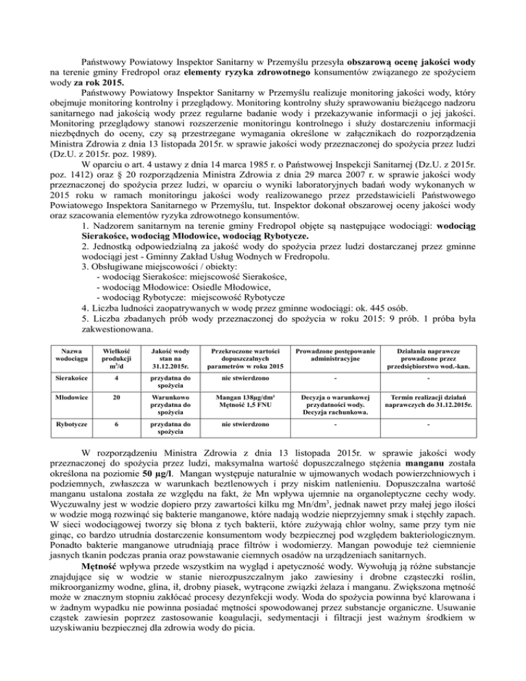 Państwowy Powiatowy Inspektor Sanitarny w Przemyślu przesyła obszarową ocenę jakości wody na terenie gminy Fredropol oraz elementy ryzyka zdrowotnego konsumentów związanego ze spożyciem wody za rok 2015. Państwowy Powiatowy Inspektor Sanitarny w Przemyślu realizuje monitoring jakości wody, który obejmuje monitoring kontrolny i przeglądowy. Monitoring kontrolny służy sprawowaniu bieżącego nadzoru sanitarnego nad jakością wody przez regularne badanie wody i przekazywanie informacji o jej jakości. Monitoring przeglądowy stanowi rozszerzenie monitoringu kontrolnego i służy dostarczeniu informacji niezbędnych do oceny, czy są przestrzegane wymagania określone w załącznikach do rozporządzenia Ministra Zdrowia z dnia 13 listopada 2015r. w sprawie jakości wody przeznaczonej do spożycia przez ludzi (Dz.U. z 2015r. poz. 1989). W oparciu o art. 4 ustawy z dnia 14 marca 1985 r. o Państwowej Inspekcji Sanitarnej (Dz.U. z 2015r. poz. 1412) oraz § 20 rozporządzenia Ministra Zdrowia z dnia 29 marca 2007 r. w sprawie jakości wody przeznaczonej do spożycia przez ludzi, w oparciu o wyniki laboratoryjnych badań wody wykonanych w 2015 roku w ramach monitoringu jakości wody realizowanego przez przedstawicieli Państwowego Powiatowego Inspektora Sanitarnego w Przemyślu, tut. Inspektor dokonał obszarowej oceny jakości wody oraz szacowania elementów ryzyka zdrowotnego konsumentów. 1. Nadzorem sanitarnym na terenie gminy Fredropol objęte są następujące wodociągi: wodociąg Sierakośce, wodociąg Młodowice, wodociąg Rybotycze. 2. Jednostką odpowiedzialną za jakość wody do spożycia przez ludzi dostarczanej przez gminne wodociągi jest - Gminny Zakład Usług Wodnych w Fredropolu. 3. Obsługiwane miejscowości / obiekty: - wodociąg Sierakośce: miejscowość Sierakośce, - wodociąg Młodowice: Osiedle Młodowice, - wodociąg Rybotycze: miejscowość Rybotycze 4. Liczba ludności zaopatrywanych w wodę przez gminne wodociągi: ok. 445 osób. 5. Liczba zbadanych prób wody przeznaczonej do spożycia w roku 2015: 9 prób. 1 próba była zakwestionowana. Nazwa wodociągu Wielkość produkcji m3/d Jakość wody stan na 31.12.2015r. Przekroczone wartości dopuszczalnych parametrów w roku 2015 Prowadzone postępowanie administracyjne Działania naprawcze prowadzone przez przedsiębiorstwo wod.-kan. Sierakośce 4 przydatna do spożycia nie stwierdzono - - Młodowice 20 Warunkowo przydatna do spożycia Mangan 138µg/dm³ Mętność 1,5 FNU Decyzja o warunkowej przydatności wody. Decyzja rachunkowa. Termin realizacji działań naprawczych do 31.12.2015r. Rybotycze 6 przydatna do spożycia nie stwierdzono - - W rozporządzeniu Ministra Zdrowia z dnia 13 listopada 2015r. w sprawie jakości wody przeznaczonej do spożycia przez ludzi, maksymalna wartość dopuszczalnego stężenia manganu została określona na poziomie 50 µg/l. Mangan występuje naturalnie w ujmowanych wodach powierzchniowych i podziemnych, zwłaszcza w warunkach beztlenowych i przy niskim natlenieniu. Dopuszczalna wartość manganu ustalona została ze względu na fakt, że Mn wpływa ujemnie na organoleptyczne cechy wody. Wyczuwalny jest w wodzie dopiero przy zawartości kilku mg Mn/dm3, jednak nawet przy małej jego ilości w wodzie mogą rozwinąć się bakterie manganowe, które nadają wodzie nieprzyjemny smak i stęchły zapach. W sieci wodociągowej tworzy się błona z tych bakterii, które zużywają chlor wolny, same przy tym nie ginąc, co bardzo utrudnia dostarczenie konsumentom wody bezpiecznej pod względem bakteriologicznym. Ponadto bakterie manganowe utrudniają prace filtrów i wodomierzy. Mangan powoduje też ciemnienie jasnych tkanin podczas prania oraz powstawanie ciemnych osadów na urządzeniach sanitarnych. Mętność wpływa przede wszystkim na wygląd i apetyczność wody. Wywołują ją różne substancje znajdujące się w wodzie w stanie nierozpuszczalnym jako zawiesiny i drobne cząsteczki roślin, mikroorganizmy wodne, glina, ił, drobny piasek, wytrącone związki żelaza i manganu. Zwiększona mętność może w znacznym stopniu zakłócać procesy dezynfekcji wody. Woda do spożycia powinna być klarowana i w żadnym wypadku nie powinna posiadać mętności spowodowanej przez substancje organiczne. Usuwanie cząstek zawiesin poprzez zastosowanie koagulacji, sedymentacji i filtracji jest ważnym środkiem w uzyskiwaniu bezpiecznej dla zdrowia wody do picia. Po analizie oceny jakości wody oraz elementów ryzyka zdrowotnego dla konsumentów związanego ze spożyciem wody oraz wytycznych Światowej Organizacji Zdrowia (WHO) i ekspertów z PZH, Państwowy Powiatowy Inspektor Sanitarny w Przemyślu nie stwierdza istotnych zagrożeń dla zdrowia populacji gminy, która korzysta z sieci wodociągowych, w związku ze spożyciem wody dostarczanej przez przedsiębiorstwo wodociągowo-kanalizacyjne.