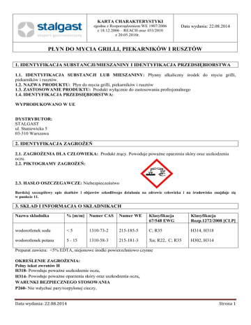 KARTA CHARAKTERYSTYKI zgodna z Rozporządzeniem WE 1907/2006 z 18.12.2006 – REACH oraz 453/2010 z 20.05.2010r. Data wydania: 22.08.2014 PŁYN DO MYCIA GRILLI, PIEKARNIKÓW I RUSZTÓW 1. IDENTYFIKACJA SUBSTANCJI/MIESZANINY I IDENTYFIKACJA PRZEDSIĘBIORSTWA 1.1. IDENTYFIKACJA SUBSTANCJI LUB MIESZANINY: Płynny alkaliczny środek do mycia grilli, piekarników i rusztów. 1.2. NAZWA PRODUKTU: Płyn do mycia grilli, piekarników i rusztów 1.3. ZASTOSOWANIE PRODUKTU: Produkt wyłącznie do zastosowania profesjonalnego 1.4. IDENTYFIKACJA PRZEDSIĘBIORSTWA: WYPRODUKOWANO W UE DYSTRYBUTOR: STALGAST ul. Staniewicka 5 03-310 Warszawa 2. IDENTYFIKACJA ZAGROŻEŃ 2.1. ZAGROŻENIA DLA CZŁOWIEKA: Produkt żrący. Powoduje poważne oparzenia skóry oraz uszkodzenia oczu. 2.2. PIKTOGRAMY ZAGROŻEŃ: 2.3. HASŁO OSZCZEGAWCZE: Niebezpieczeństwo Bardziej szczegółowy opis skutków i objawów szkodliwego działania na zdrowie człowieka i na środowisko znajduje się w punkcie 11. 3. SKŁAD I INFORMACJA O SKŁADNIKACH Nazwa składnika % [m/m] Numer CAS Numer WE Klasyfikacja 67/548 EWG Klasyfikacja Rozp.1272/2008 [CLP] wodorotlenek sodu <5 1310-73-2 215-185-5 C; R35 H314, H318 wodorotlenek potasu 5 - 15 1310-58-3 215-181-3 Xn; R22, C; R35 H302, H314 Preparat zawiera: <5% EDTA, niejonowe środki powierzchniowo czynne OKREŚLENIE ZAGROŻENIA: Pełny tekst zwrotów H H318- Powoduje poważne uszkodzenie oczu, H314- Powoduje poważne oparzenia skóry oraz uszkodzenia oczu, WARUNKI BEZPIECZNEGO STOSOWANIA P260- Nie wdychać pary/rozpylonej cieczy, Data wydania: 22.08.2014 Strona 1 KARTA CHARAKTERYSTYKI PŁYN DO MYCIA GRILLI, PIEKARNIKÓW I RUSZTÓW P280- Stosować rękawice ochronne/odzież ochronną/ochronę oczu/ochronę twarzy, P301+P330+P331 – W PRZYPADKU POŁKNIĘCIA: wypłukać usta. NIE wywoływać wymiotów, P303+P361+P353- W PRZYPADKU KONTAKTU ZE SKÓRĄ (lub włosami): Natychmiast zdjąć całą zanieczyszczoną odzież. Spłukać skórę pod strumieniem wody/prysznicem, P304+P340- W PRZYPADKU DOSTANIA SIĘ DO DRÓG ODDECHOWYCH: wyprowadzić lub wynieść poszkodowanego na świeże powietrze i zapewnić mu warunki do swobodnego oddychania, P310- Natychmiast skontaktować się z OŚRODKIEM ZATRUĆ/ lekarzem, P305+P351+P338- W PRZYPADKU DOSTANIA SIĘ DO OCZU: Ostrożnie płukać wodą przez kilka minut. Wyjąć soczewki kontaktowe, jeżeli są i można je łatwo usunąć. Nadal płukać, P405- Przechowywać pod zamknięciem. 4. ŚRODKI PIERWSZEJ POMOCY 4.1. ZALECENIA OGÓLNE: Przerwać kontakt. Pokazać lekarzowi kartę charakterystyki lub etykietę produktu. 4.2. WDYCHANIE: Wyprowadzić/wynieść narażoną osobę na powietrze. Zapewnić spokój i bezruch (groźba obrzęku płuc). W razie potrzeby podawać tlen, w przypadku zatrzymania oddychania przeprowadzić sztuczne oddychanie. Bezzwłocznie zasięgnąć opinii lekarza. 4.3. KONTAKT Z SKÓRĄ: Spłukać zanieczyszczoną skórę dużą ilością wody. Bezzwłocznie zdjąć zanieczyszczoną odzież i obuwie. Przed ściągnięciem ubrania należy ubrać rękawice i spłukać je wodą. Kontynuować płukanie przez co najmniej 10 minut. Następnie założyć jałowy opatrunek i zasięgnąć porady lekarskiej. 4.4. KONTAKT Z OCZAMI: Zanieczyszczone oczy natychmiast płukać wodą, odchylając górną o dolną powiekę, przez co najmniej 15 minut. Natychmiast zapewnić pomoc lekarską. 4.5. POŁKNIĘCIE: Bezzwłocznie przepłukać jamę ustną wodą. Nie powodować wymiotów, jeśli nie jest to zalecane przez personel medyczny. Podać do wypicia dużą ilość wody lub mleka, najlepiej z dodatkiem białka jaja kurzego. 4.6. WSKAZÓWKI DLA LEKARZA: Leczenie właściwe dla zatruć produktami silnie żrącym, alkalicznymi. 5. POSTĘPOWANIE W PRZYPADKU POŻARU 5.1. ŚRODKI GAŚNICZE - ODPOWIEDNIE: Stosować zraszanie wodą (mgłą), użyć piany lub suchych środków chemicznych. 5.2. ŚRODKI GAŚNICZE - NIEODPOWIEDNIE: Nie znane. 5.3. ŚRODKI OCHRONY INDYWIDUALNEJ STRAŻAKÓW: Stosować aparaty oddechowe z niezależnym dopływem powietrza oraz pełne ubranie ochronne. 5.4. DODATKOWE INFORMACJE: Postępować zgodnie z procedurami obowiązującymi przy gaszeniu pożarów chemikaliów. Nie dopuścić do przedostania się ścieków po gaszeniu pożarów do kanalizacji i wód. 6. POSTĘPOWANIE W PRZYPADKU NIEZAMIERZONEGO UWOLNIENIA DO ŚRODOWISKA 6.1. INDYWIDUALNE ŚRODKI OSTROŻNOŚCI: Nie zezwalać na wejście bez potrzeby, nie zabezpieczonemu personelowi. Nie dotykać, ani nie przechodzić po rozlanym preparacie. Unikać wdychania par. W przypadku uwolnienia w pomieszczeniu zapewnić odpowiednią wentylację. 6.2. ŚRODKU OCHRONY W ZAKRESIE ŚRODOWISKA: W przypadku rozlania, zatrzymać wyciek. Zapobiec rozprzestrzenianiu się oraz przedostaniu się jej do kanalizacji, rowów, wód powierzchniowych i gruntowych oraz gleby. 6.3. METODY OCZYSZCZANIA/USUWANIA: Jeśli rozlania jest małe rozcieńczyć je wodą i zebrać ścierką lub zaabsorbować innym chłonnym materiałem, a następnie umieścić w właściwym pojemniku na odpady. Natomiast jeśli rozlanie jest duże, to uwolnioną ciecz należy posypać substancją chłonną (piasek, ziemia, wermikulit, ziemia okrzemkowa). Kolejno umieszczając je w pojemnikach do utylizacji, zgodnie z przepisami (patrz sekcja 13). Data wydania: 22.08.2014 Strona 2 KARTA CHARAKTERYSTYKI PŁYN DO MYCIA GRILLI, PIEKARNIKÓW I RUSZTÓW Patrz także sekcja 8. zawiera informacje na temat środków ochronny indywidualnej oraz sekcja 13. sposoby postępowania z odpadami. 7. POSTĘPOWANIE Z SUBSTANCJĄ/MIESZANINĄ I JEJ MAGAZYNOWANIE Podczas stosowania i przechowywania produktu należy przestrzegać przepisy bezpieczeństwa i higieny pracy (patrz sekcja 15). Stosować zgodnie z przeznaczeniem. Przestrzegać zaleceń producenta. 7.1. POSTĘPOWANIE Z PREPARATEM: Nie dopuścić do zanieczyszczenia oczu, skóry i ubrania. Nie spożywać. Unikać wdychania par. Nieużywane pojemniki trzymać zamknięte. Po pracy z preparatem dokładnie 