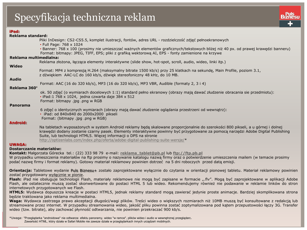 Specyfikacja techniczna reklam iPad: Reklama standard: Pliki InDesign: CS2-CS5.5, komplet ilustracji, fontów, adres URL - rozdzielczość zdjęć pełnoekranowych • Full Page: 768 x 1024 • Banner: 768 x 100 (prosimy nie umieszczać ważnych elementów graficznych/tekstowych bliżej niż 40 px. od prawej krawędzi banneru) Format: bitmapy: JPEG, TIFF, EPS; pliki z grafiką wektorową AI, EPS - fonty zamienione na krzywe Reklama multimedialna: Reklama złożona, łącząca elementy interaktywne (slide show, hot-spot, scroll, audio, wideo, linki itp.) Wideo Format: MP4 z kompresją H.264 (maksymalny bitrate 1500 kb/s) przy 25 klatkach na sekundę, Main Profile, poziom 3.1, z dźwiękiem AAC-LC do 160 kb/s, dźwięk stereofoniczny 48 kHz, do 10 MB. Audio Format: AAC (16 do 320 kb/s), MP3 (16 do 320 kb/s), MP3 VBR, Audible (formaty 2, 3 i 4) Reklama 360° ok. 50 zdjęć (o wymiarach docelowych 1:1) standard pełno ekranowy (obrazy mają dawać złudzenie obracania sie przedmiotu): • iPad:1 768 x 1024, jedna czwarta daje 384 x 512 Format: bitmapy .jpg .png w RGB Panorama 6 zdjęć o identycznych wymiarach (obrazy mają dawać złudzenie oglądania przestrzeni od wewnątrz): • iPad: od 840x840 do 2000x2000 pikseli Format: (bitmapy .jpg .png w RGB) Android: Na tabletach wyposażonych w system Android reklamy będą skalowane proporcjonalnie do szerokości 800 pikseli, a u górnej i dolnej krawędzi dodany zostanie czarny pasek. Elementy interaktywne powinny być przygotowane za pomocą narzędzi Adobe Digital Publishing Suite, lub technologii HTML5. Więcej informacji o DPS na stronie http://optizenlabs.com/index.php/oferta/adobe-digital-publishing-suite-wersje/* UWAGA: Dostarczanie materiałów: Kontakt: Małgorzata Górecka tel.: (22) 333 98 79 e-mail: [email protected] lub ftp://ftp.pb.pl W przypadku umieszczenia materiałów na ftp prosimy o nazywanie katalogu nazwą firmy oraz o potwierdzenie umieszczenia mailem (w temacie prosimy podać nazwę firmy i format reklamy). Gotowy materiał reklamowy powinien dotrzeć na 5 dni roboczych przed datą emisji. Orientacja: Tabletowe wydanie Puls Biznesu+ zostało zaprojektowane wyłącznie do czytania w orientacji pionowej tabletu. Materiał reklamowy powinien zostać przygotowany wyłącznie w pionie. Flash: iPad nie obsługuje technologii Flash, materiały reklamowe nie mogą być zapisane w formacie „.flv”. Mogą być zaprojektowane w aplikacji Adobe Flash, ale ostatecznie muszą zostać skonwertowane do postaci HTML 5 lub wideo. Rekomendujemy również nie podawanie w reklamie linków do stron internetowych przygotowanych we Flash. HTML5: Wydawca dopuszcza kreacje w postaci HTML5, jednak reklamy standard mogą zawierać jedynie proste animacje. Bardziej skomplikowana strona będzie traktowana jako reklama multimedialna. Waga: Wydawca zastrzega prawo akceptacji długości/wagi plików. Treści wideo o większych rozmiarach niż 10MB muszą być konsultowane z redakcją lub streamowane przez internet. W przypadku streamowania wideo, jakość pliku powinna zostać zoptymalizowana pod kątem przepustowości łączy 3G. Transfer wideo (tzw. bitrate), aby zachować płynność odtwarzania, nie powinien przekraczać 900 kb/s. *Uwaga: "Przeglądarka "androidowa" nie odtwarza: efektu panoramy, wideo "w ramce", plików wideo i audio w wewnętrznej przeglądarc. Zawartość HTML, który działa w Safari Mobile(Polska) nie zawsze w przeglądarkach innych urządzeń mobilnych. Bonnier Business Sp.działa z o.o.; ul. Kijowska 1, 03-738 Warszawa; tel.: 22 333 98 88, fax: 22 333 98 99; [email protected]