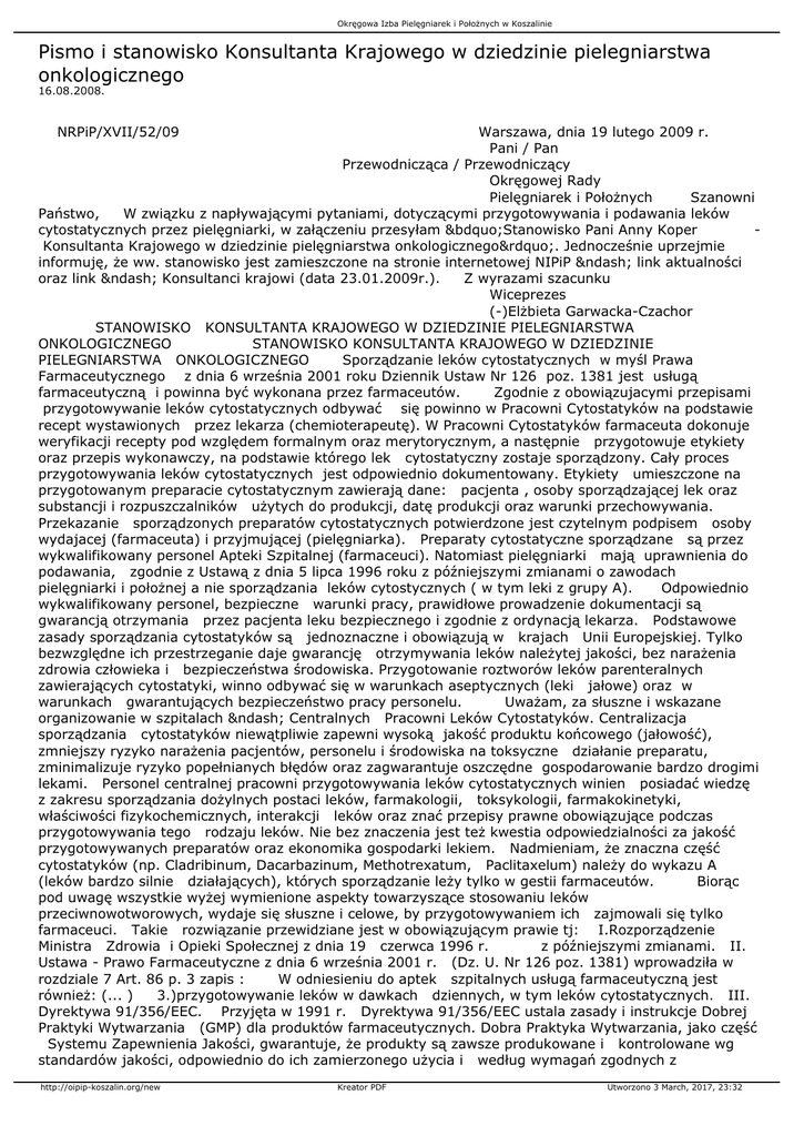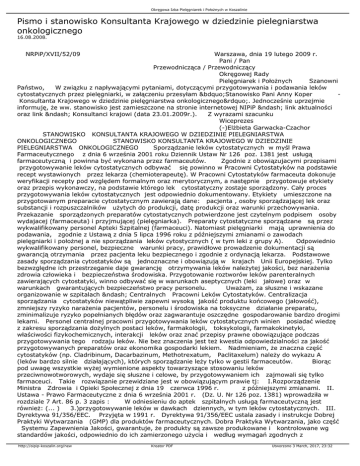 Okręgowa Izba Pielęgniarek i Położnych w Koszalinie Pismo i stanowisko Konsultanta Krajowego w dziedzinie pielegniarstwa onkologicznego 16.08.2008. NRPiP/XVII/52/09 Warszawa, dnia 19 lutego 2009 r. Pani / Pan Przewodnicząca / Przewodniczący Okręgowej Rady Pielęgniarek i Położnych Szanowni Państwo, W związku z napływającymi pytaniami, dotyczącymi przygotowywania i podawania leków cytostatycznych przez pielęgniarki, w załączeniu przesyłam „Stanowisko Pani Anny Koper Konsultanta Krajowego w dziedzinie pielęgniarstwa onkologicznego”. Jednocześnie uprzejmie informuję, że ww. stanowisko jest zamieszczone na stronie internetowej NIPiP – link aktualności oraz link – Konsultanci krajowi (data 23.01.2009r.). Z wyrazami szacunku Wiceprezes (-)Elżbieta Garwacka-Czachor STANOWISKO KONSULTANTA KRAJOWEGO W DZIEDZINIE PIELEGNIARSTWA ONKOLOGICZNEGO STANOWISKO KONSULTANTA KRAJOWEGO W DZIEDZINIE PIELEGNIARSTWA ONKOLOGICZNEGO Sporządzanie leków cytostatycznych w myśl Prawa Farmaceutycznego z dnia 6 września 2001 roku Dziennik Ustaw Nr 126 poz. 1381 jest usługą farmaceutyczną i powinna być wykonana przez farmaceutów. Zgodnie z obowiązujacymi przepisami przygotowywanie leków cytostatycznych odbywać się powinno w Pracowni Cytostatyków na podstawie recept wystawionych przez lekarza (chemioterapeutę). W Pracowni Cytostatyków farmaceuta dokonuje weryfikacji recepty pod względem formalnym oraz merytorycznym, a następnie przygotowuje etykiety oraz przepis wykonawczy, na podstawie którego lek cytostatyczny zostaje sporządzony. Cały proces przygotowywania leków cytostatycznych jest odpowiednio dokumentowany. Etykiety umieszczone na przygotowanym preparacie cytostatycznym zawierają dane: pacjenta , osoby sporządzającej lek oraz substancji i rozpuszczalników użytych do produkcji, datę produkcji oraz warunki przechowywania. Przekazanie sporządzonych preparatów cytostatycznych potwierdzone jest czytelnym podpisem osoby wydajacej (farmaceuta) i przyjmującej (pielęgniarka). Preparaty cytostatyczne sporządzane są przez wykwalifikowany personel Apteki Szpitalnej (farmaceuci). Natomiast pielęgniarki mają uprawnienia do podawania, zgodnie z Ustawą z dnia 5 lipca 1996 roku z późniejszymi zmianami o zawodach pielęgniarki i położnej a nie sporządzania leków cytostycznych ( w tym leki z grupy A). Odpowiednio wykwalifikowany personel, bezpieczne warunki pracy, prawidłowe prowadzenie dokumentacji są gwarancją otrzymania przez pacjenta leku bezpiecznego i zgodnie z ordynacją lekarza. Podstawowe zasady sporządzania cytostatyków są jednoznaczne i obowiązują w krajach Unii Europejskiej. Tylko bezwzględne ich przestrzeganie daje gwarancję otrzymywania leków należytej jakości, bez narażenia zdrowia człowieka i bezpieczeństwa środowiska. Przygotowanie roztworów leków parenteralnych zawierających cytostatyki, winno odbywać się w warunkach aseptycznych (leki jałowe) oraz w warunkach gwarantujących bezpieczeństwo pracy personelu. Uważam, za słuszne i wskazane organizowanie w szpitalach – Centralnych Pracowni Leków Cytostatyków. Centralizacja sporządzania cytostatyków niewątpliwie zapewni wysoką jakość produktu końcowego (jałowość), zmniejszy ryzyko narażenia pacjentów, personelu i środowiska na toksyczne działanie preparatu, zminimalizuje ryzyko popełnianych błędów oraz zagwarantuje oszczędne gospodarowanie bardzo drogimi lekami. Personel centralnej pracowni przygotowywania leków cytostatycznych winien posiadać wiedzę z zakresu sporządzania dożylnych postaci leków, farmakologii, toksykologii, farmakokinetyki, właściwości fizykochemicznych, interakcji leków oraz znać przepisy prawne obowiązujące podczas przygotowywania tego rodzaju leków. Nie bez znaczenia jest też kwestia odpowiedzialności za jakość przygotowywanych preparatów oraz ekonomika gospodarki lekiem. Nadmieniam, że znaczna część cytostatyków (np. Cladribinum, Dacarbazinum, Methotrexatum, Paclitaxelum) należy do wykazu A (leków bardzo silnie działających), których sporządzanie leży tylko w gestii farmaceutów. Biorąc pod uwagę wszystkie wyżej wymienione aspekty towarzyszące stosowaniu leków przeciwnowotworowych, wydaje się słuszne i celowe, by przygotowywaniem ich zajmowali się tylko farmaceuci. Takie rozwiązanie przewidziane jest w obowiązującym prawie tj: I.Rozporządzenie Ministra Zdrowia i Opieki Społecznej z dnia 19 czerwca 1996 r. z późniejszymi zmianami. II. Ustawa - Prawo Farmaceutyczne z dnia 6 września 2001 r. (Dz. U. Nr 126 poz. 1381) wprowadziła w rozdziale 7 Art. 86 p. 3 zapis : W odniesieniu do aptek szpitalnych usługą farmaceutyczną jest również: (... ) 3.)przygotowywanie leków w dawkach dziennych, w tym leków cytostatycznych. III. Dyrektywa 91/356/EEC. Przyjęta w 1991 r. Dyrektywa 91/356/EEC ustala zasady i instrukcje Dobrej Praktyki Wytwarzania (GMP) dla produktów farmaceutycznych. Dobra Praktyka Wytwarzania, jako część Systemu Zapewnienia Jakości, gwarantuje, że produkty są zawsze produkowane i kontrolowane wg standardów jakości, odpowiednio do ich zamierzonego użycia i według wymagań zgodnych z http://oipip-koszalin.org/new Kreator PDF Utworzono 3 March, 2017, 23:32 Okręgowa Izba Pielęgniarek i Położnych w Koszalinie dokumentacją. Reasumując: 1. Niezaprzeczalnym jest fakt, że przygotowywanie leków cytostatycznych w dawkach indywidualnych jest usługą farmaceutyczną (art. 86 ust. 3 pkt 3 ustawy z dnia 6 września 2001 roku – Prawo Farmaceutyczne) a nie usługą pielęgniarską (Ustawa o zawodzie pielęgniarki i położnej). 2. Miejscem, w którym świadczone są usługi farmaceutyczne przez osoby uprawnione jest apteka, a nie np. oddział szpitalny (art. 86 ust. 1 w/w ustawy). To apteka świadczy usługi w stosunku do np. oddziałów. 3. Przy wykonywaniu w aptece czynności fachowych (usług farmaceutycznych) mogą być zatrudnieni wyłącznie farmaceuci i techn
