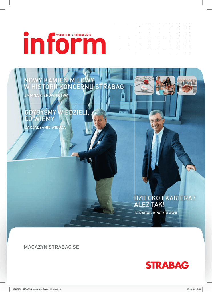 inform wydanie 26 listopad 2013 NOWY KAMIEŃ MILOWY W HISTORII KONCERNU STRABAG ZMIANA KIEROWNICTWA GDYBYŚMY WIEDZIELI, CO WIEMY ZARZĄDZANIE WIEDZĄ DZIECKO I KARIERA? ALEŻ TAK! STRABAG BRATYSŁAWA MAGAZYN STRABAG SE 004188T2_STRABAG_inform_26_Cover_r12_pl.indd 1 15.10.13 10:01 Od Redakcji inform 26 OD REDAKCJI SZANOWNI PAŃSTWO, DROGIE KOLEŻANKI I KOLEDZY, Thomas Birtel Prezes Zarządu STRABAG SE od 14 czerwca br. mam honor pełnić równie zaszczytną, co wysoce odpowiedzialną funkcję prezesa zarządu w koncernie STRABAG. Hans Peter Haselsteiner ukształtował i uformował przedsiębiorstwo – w takiej postaci, w jakiej funkcjonuje ono dzisiaj. Na tym fundamencie będziemy budować również w przyszłości. To świetna okazja do podsumowania najważniejszych wydarzeń w historii koncernu STRABAG w temacie z okładki (str. 10). W długofalowej perspektywie z pewnością obraliśmy właściwy kierunek strategii i mamy ugruntowaną pozycję w Europie Środkowo-Wschodniej. Czy jednak możliwy będzie na tym obszarze wzrost, zależy od wielu czynników – w chwili obecnej sytuacja jest szczególnie niepewna. Gospodarka budowlana w większości krajów powoli wydobywa się z kryzysu, wstrząsana upadłościami wielu przedsiębiorstw – prowadzenie agresywnej strategii rozwoju na tych rynkach byłoby teraz nie na miejscu. Budujemy więc na tym, co nas wyróżnia: na naszej stabilności i naszym know-how, a także na naszej zdolności do przekształceń i sile innowacji! Rozmiary przedsiębiorstwa, jego obecność w wielu krajach, solidność finansowa, ale przede wszystkim ludzie pracujący w koncernie STRABAG – to wszystko są nasze atuty. Rozwijajmy je systematycznie dalej! znak. Jak my sami będziemy mogli w przyszłości lepiej wymieniać się i czynić użytek z naszego know-how w ramach przedsiębiorstwa, dowiedzą się Państwo z artykułu „Zarządzanie wiedzą” (str. 30). Nawet jeśli dotychczasowa historia koncernu bez wątpienia daje powód do dumy z tego, co osiągnęliśmy, proszę Państwa, byście nigdy nie popadali w samozadowolenie, ale aktywnie uczestniczyli w kształtowaniu przyszłości naszego przedsiębiorstwa. Jeśli pozostaniemy otwarci na nowości i gotowi do przekształceń, wówczas nasze możliwości staną się nieograniczone! Wasz Thomas Birtel Na całym świecie pożądane są nasze ekspertyzy. To nasza szansa na umocnienie pozycji jako przedsiębiorstwa usługowego w zakresie technologii w branży budowlanej także poza naszymi europejskimi rynkami kluczowymi. Cztery nowe zlecenia w strefie arabskiej i Tajlandii o łącznej wartości ponad 230 mln € to aktualnie dobry tego 02 004188T2_STRABAG_inform_26_Innen_r12_pl.indd 2 15.10.13 10:05 www.strabag.com inform 26 Spis treści SPIS TREŚCI AKTUALNOŚCI 04 04 05 06 08 09 DZIECKO I KARIERA? ALEŻ TAK! STRABAG Bratysława NOWA SIEDZIBA DLA RZĄDU BRANDENBURGII STRABAG Real Estate GmbH STANOWIMY JEDNOŚĆ STRABAG Węgry ZWROT NA SCENIE ARTYSTYCZNEJ STRABAG Forum Artystyczne OD 50 LAT NA KURSIE SUKCESU ZIPP PO 90 ŻYCIE ZACZYNA SIĘ NA NOWO Lahnstein TEMAT Z OKŁADKI 10 NOWY KAMIEŃ MILOWY W HISTORII KONCERNU STRABAG Zmiana kierownictwa LUDZIE W FIRMIE STRABAG 18 O NAJWYŻSZYCH SZCZYTACH ŚWIATA Pracownicy firmy STRABAG na scenie JEDNOSTKI STRABAGA 24 25 26 27 28 30 31 OD PIERWSZEGO POMYSŁU DO GOTOWEGO OBIEKTU STRABAG Real Estate GmbH NOWA FORMACJA PRZEZ KONCENTRACJĘ Ochrona Środowiska SPECJALIŚCI W AKCJI TPA NOWE DROGI KARIERY Human Resource Development (HRD) SPECJALIŚCI NA WYSOKOŚCIACH Metallica GDYBYŚMY WIEDZIELI, CO WIEMY Zarządzanie wiedzą ZARZĄDZANIE PRODUKTEM, DORADZTWO I WSPARCIE Budowlany program komputerowy pROJEKTY 32 34 36 37 38 40 41 42 DUCH ZESPOŁOWY: WSZYSCY DLA PROJEKTU Pas startowy /lądowania w porcie lotniczym im. Václava Havla ŻYCIE JAK W PRAWDZIWYM RAJU Zielona Fala TANIEC NAD WĄWOZEM Most nad wąwozem Tamina TCHNIENIE NOWEGO ŻYCIA W STARE MURY Fabryka Inżynierów KTO MA WAAL, TEN MA PROBLEM! Most na rzece Waal NAGRODZONA TECHNOLOGIA Ulica Nowolazurowa BUDOWANIE DLA ZDROWIA WE WŁOSZECH Klinika uniwersytecka „Sant’Orsola-Malpighi” W KRAJU DAKTYLI i PALM Metro w Algierze SPECJALNE 44 KOLONIA: MOJE MIASTO Ulubione miejsca pracowników firmy STRABAG 46 WYDARZENIA Z TRADYCJĄ Aktualności sportowe 47 ŁAMIGŁÓWKA ZE STRZAŁKAMI Mistrz łamigłówek poszukiwany 03 004188T2_STRABAG_inform_26_Innen_r12_pl.indd 3 15.10.13 10:05 Aktualności inform 26 News STRABAG BRATYSŁAWA DZIECKO I KARIERA? ALEŻ TAK! Słowacja. Narodziny dziecka, jedno z najszczęśliwszych i najradośniejszych wydarzeń w życiu, stawiają aktywnych zawodowo rodziców przed kwestią połączenia kariery z wychowaniem dziecka. Wielu pracodawców uważa ten problem za czysto prywatny, którego rozwiązaniem nie trzeba się zajmować. Na szczęście istnieją też firmy, które patrzą na tę sprawę inaczej: w ramach pro- Czy to malując, czy majsterkując – dzieciaki wykorzystują swoją kreatywność gramu socjalnego STRABAG s.r.o. jako pierwsza na Słowacji spółka prywatna utworzyła firmowe przedszkole „Štrabačik”. Gdy pomyśli się, jak trudne bywa zdobycie miejsca w przedszkolu publicznym, można pracownikom firmy STRABAG tylko pozazdrościć. Założone w 2009 w bratysławskiej centrali przedszkole cieszy się wielkim powodzeniem. Przebywające w nim pod profesjonalną opieką dzieci mają do dyspozycji kilka przestrzennych pomieszczeń do zabawy, nauki i wypoczynku. Dodatkowe punkty uzupełniające program, takie jak kursy języka angielskiego, pływania czy poznawanie podstawowych zasad ruchu drogowego w formie zabawy gwarantują, że „Štrabačik” jest placówką oświatową, w której dzieci uczą się, świetnie się czują i mogą rozwijać się kreatywnie. Słowackie Ministerstwo Pracy, Spraw Socjalnych i Rodziny doceniło spółkę STRABAG s.r.o. za jej zaangażowanie i zaprosiło do uczestnictwa w konkursie „Praco- STRABAG s.r.o. wspiera rodziców w pogodzeniu wych