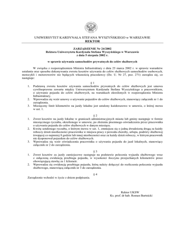 UNIWERSYTET KARDYNAŁA STEFANA WYSZYŃSKIEGO w WARSZAWIE REKTOR ZARZĄDZENIE Nr 24/2002 Rektora Uniwersytetu Kardynała Stefana Wyszyńskiego w Warszawie z dnia 5 sierpnia 2002 r. w sprawie używania samochodów prywatnych do celów służbowych W związku z rozporządzeniem Ministra Infrastruktury z dnia 25 marca 2002 r. w sprawie warunków ustalania oraz sposobu dokonywania zwrotu kosztów używania do celów służbowych samochodów osobowych, motocykli i motorowerów nie będących własnością pracodawcy (Dz. U. Nr 27, poz. 271) zarządza się, co następuje: 1. 2. 3. 1. 2. 3. 1. 2. §1 Podstawą zwrotu kosztów używania samochodów prywatnych do celów służbowych jest umowa cywilnoprawna zawarta między Uniwersytetem Kardynała Stefana Wyszyńskiego a pracownikiem, o używanie pojazdu do celów służbowych, na warunkach określonych w rozporządzeniu Ministra Infrastruktury. Wprowadza się wzór umowy o używanie pojazdów do celów służbowych, stanowiący załącznik nr 1 do zarządzenia. Miesięczny limit kilometrów na jazdy lokalne jest ustalony każdorazowo w umowie, o której mowa w ust. 1. §2 Zwrot kosztów na jazdy lokalne w granicach administracyjnych miasta lub gminy następuje w formie miesięcznego ryczałtu, określonego w umowie, po złożeniu pisemnego oświadczenia przez pracownika o używaniu pojazdu do celów służbowych w danym miesiącu. Kwotę ustalonego ryczałtu, o którym mowa w ust. 1, zmniejsza się o jedną dwudziestą drugą za każdy roboczy dzień nieobecności pracownika w miejscu pracy z powodu choroby, urlopu, podróży służbowej trwającej co najmniej 8 godzin lub innej nieobecności oraz za każdy dzień roboczy, w którym pracownik nie dysponował pojazdem do celów służbowych. Wprowadza się wzór oświadczenia pracownika o używaniu pojazdu do jazd lokalnych, stanowiący załącznik nr 2 do zarządzenia. §3 Zwrot kosztów za jazdy zamiejscowe następuje na podstawie polecenia wyjazdu służbowego wraz z załączoną ewidencją przebiegu pojazdu, w wysokości iloczynu przejechanych kilometrów przez obowiązującą stawkę za 1 kilometr. Wprowadza się ewidencję przebiegu pojazdu, którą należy dołączyć do rozliczenia polecenia wyjazdu służbowego, stanowiącą załącznik nr 3 do zarządzenia. §4 Zarządzenie wchodzi w życie z dniem podpisania. Rektor UKSW Ks. prof. dr hab. Roman Bartnicki Załącznik nr 1 Do zarządzenia nr 24/2002 z dnia 5.08.2002r. Umowa nr ....................... o używanie samochodu prywatnego do celów służbowych zawarta w dniu ........................................ w ......................................... pomiędzy Uniwersytetem Kardynała Stefana Wyszyńskiego w Warszawie, 01-815 Warszawa ul. Dewajtis 5, zwanym dalej „pracodawcą”, reprezentowanym przez ..................................................................................................................................................................................... ......................................................................................................................... a pracownikiem panem/panią ....................................................................................................... zatrudnionym/ną w ............................................................................................ właścicielem/ką samochodu marki ............................................., nr rej. ..............................................................., pojemność skokowa silnika .................................. cm3. Strony umowy ustalają co następuje: § 1. Pracodawca zobowiązuje się do zwrotu kosztów używania przez pracownika jego samochodu do celów służbowych, związanych z wykonywaniem obowiązków służbowych w ramach zatrudnienia w UKSW, w jazdach lokalnych i zamiejscowych*. § 2. Pracodawca określa miesięczny limit kilometrów na jazdy lokalne na ................... km. § 3. Wszelkie koszty eksploatacji samochodu, w tym także jego naprawy w przypadku uszkodzenia podczas używania go do celów służbowych, ponosi Pracownik. § 4.1 Stawkę za jeden kilometr przebiegu określa się w wysokości zgodnej z § 2 rozporządzenia Ministra Infrastruktury w sprawie warunków ustalania oraz sposobu dokonywania zwrotu kosztów używania do celów służbowych samochodów osobowych, motocykli i motorowerów nie będących własnością pracodawcy (Dz. U. Nr 27, poz. 271). 2. Kwotę ustalonego ryczałtu, o którym mowa w ust. 1, zmniejsza się o jedną dwudziestą drugą za każdy dzień nieobecności pracownika w miejscu pracy z powodu choroby, urlopu, podróży służbowej trwającej co najmniej 8 godzin lub innej nieobecności oraz za każdy dzień roboczy, w którym pracownik nie dysponował pojazdem do celów służbowych. § 5.1. Warunkiem wypłacenia ryczałtu jest złożenie przez pracownika w terminie do ............................... następnego miesiąca pisemnego oświadczenia o używaniu samochodu osobowego w jazdach lokalnych (załącznik nr 2) potwierdzonego przez kierownika. 2. Ryczałt za jazdy lokalne wypłacany będzie Pracownikowi przelewem na rachunek bankowy wskazany przez Pracownika lub gotówką w terminie do ................... dnia miesiąca następnego po miesiącu, którego ryczałt dotyczy. § 6.1. Zwrot kosztów użycia samochodu w jazdach zamiejscowych nastąpi na podstawie rozliczenia polecenia wyjazdu służbowego wraz z załączoną ewidencją przebiegu kilometrów według stawki określonej w § 4.1. 2. Zwrot kosztów podróży służbowej następować będzie przelewem na rachunek bankowy wskazany przez pracownika lub gotówką, w terminie ....................... od dnia przedstawienia rozliczenia podróży służbowej, o którym mowa w ust. 1 * niepotrzebne skreślić § 7. Umowa zostaje zawarta na czas: nieokreślony * określony* od dnia ....................................... do dnia ...................................... . § 8. Pracodawca zast