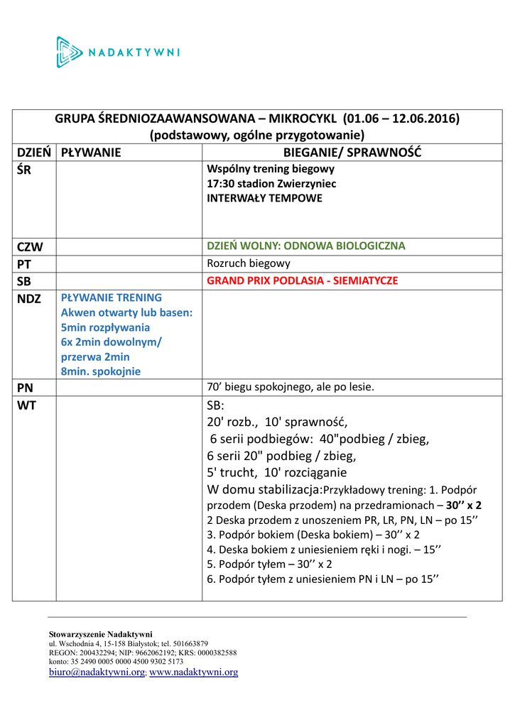GRUPA ŚREDNIOZAAWANSOWANA – MIKROCYKL (01.06 – 12.06.2016) (podstawowy, ogólne przygotowanie) DZIEŃ PŁYWANIE BIEGANIE/ SPRAWNOŚĆ Wspólny trening biegowy ŚR 17:30 stadion Zwierzyniec INTERWAŁY TEMPOWE CZW PT SB NDZ DZIEŃ WOLNY: ODNOWA BIOLOGICZNA Rozruch biegowy GRAND PRIX PODLASIA - SIEMIATYCZE PŁYWANIE TRENING Akwen otwarty lub basen: 5min rozpływania 6x 2min dowolnym/ przerwa 2min 8min. spokojnie 70’ biegu spokojnego, ale po lesie. PN WT SB: 20' rozb., 10' sprawność, 6 serii podbiegów: 40"podbieg / zbieg, 6 serii 20" podbieg / zbieg, 5' trucht, 10' rozciąganie W domu stabilizacja:Przykładowy trening: 1. Podpór przodem (Deska przodem) na przedramionach – 30’’ x 2 2 Deska przodem z unoszeniem PR, LR, PN, LN – po 15’’ 3. Podpór bokiem (Deska bokiem) – 30’’ x 2 4. Deska bokiem z uniesieniem ręki i nogi. – 15’’ 5. Podpór tyłem – 30’’ x 2 6. Podpór tyłem z uniesieniem PN i LN – po 15’’ Stowarzyszenie Nadaktywni ul. Wschodnia 4, 15-158 Białystok; tel. 501663879 REGON: 200432294; NIP: 9662062192; KRS: 0000382588 konto: 35 2490 0005 0000 4500 9302 5173 [email protected]; www.nadaktywni.org ŚR Wspólny trening biegowy 17:30 Zwierzyniec CZW PT Dzień wolny KSZTAŁTOWANIE WYTRZYMAŁOŚCI SZYBKOŚCIOWEJ: 1. ROZGRZEWKA 25' 2. 2000m w tempie półmaratonu 4 x [ 4 razy 200m na 1minutowej przerwie] 3min. odpoczynku między seriami MZB: 15’ trucht 10’ ćw. ogólnorozwojowe 10x 2min/ przerwa 2’ 10x 1min/ przerwa 90’’ SB + w domu obwód ćwiczebny składający się z 6-8 ćwiczeń, x 3 serie. Przykład: 1. Plank (Deska) 30’’ 2. Wykroki 30’’ 3. Brzuszki ze skrętoskłonami 30’’ 4. Plan (Deska) bokiem 30’’ 5. Przysiady 30’’ 6. Grzbiety 30’’. 7. Delfinki 30’’ 8. Pompki 30’’. Przerwa pomiędzy ćwiczeniem jak najkrótsza, po całym obwodzie 2’ NDZ Rozbieganie po lesie 45’ DZIEŃ PN WT GRUPA ŚREDNIOZAAWANSOWANA – (13.06 – 14.06.2016) (ODPOCZYNEK/REGENERACJA) PŁYWANIE BIEGANIE/ SPRAWNOŚĆ DZIEŃ WOLNY/ ODNOWA BIOLOGICZNA Rower rekreacyjnie lub dzień wolny Stowarzyszenie Nadaktywni ul. Wschodnia 4, 15-158 Białystok; tel. 501663879 REGON: 200432294; NIP: 9662062192; KRS: 0000382588 konto: 35 2490 0005 0000 4500 9302 5173 [email protected]; www.nadaktywni.org GRUPA ŚREDNIOZAAWANSOWANA – MIKROCYKL (15.06 – 26.06.2016) (MOCNY)* - podwyższanie pułapu tlenowego - praca nad szybkością DZIEŃ PŁYWANIE BIEGANIE/ SPRAWNOŚĆ Wspólny trening biegowy SR CZW Rozgrzewka + 4x1000m na przerwach 4-5’ Tempo półmaratonu 4x 500m Tempo 10km PT SB NDZ PN WT SR CZW PT Pomiary: waga, obwód pasa, tętno. 6KM + Siła Biegowa najpierw 10minut ćwiczeń (lekkie przysiady, wstępowanie na ławkę, wypady na jedną nogę, wspięcia na palce, marsze z wysoko uniesionymi kolanami) potem: Bieg po schodach – 6 razy Bieg pod górkę – 6 razy dziś luźno, na samopoczucie. DZIEŃ WOLNY: ODNOWA BIOLOGICZNA. IDEAŁ – MASAŻ. Zabawa biegowa: 30x30 sekund, przerwa 45 sekund spacer + gimnastyka: https://www.youtube.com/watch?v=jxgQijjr3MY Na filmie od 7:22 do 12:22 + 1 km trucht Rozbieganie 30’ Po biegu ćwiczenia: https://www.youtube.com/watch?v=jxgQijjr3MY Na filmie od 7:22 do 12:22 DZIEŃ WOLNY/ REGENERACJA Biegi interwałowe: 6x - 10x 1000m/ przerwa 3-4’ Trucht 5km + przebieżki po trawie 14x DZIEŃ WOLNY Stowarzyszenie Nadaktywni ul. Wschodnia 4, 15-158 Białystok; tel. 501663879 REGON: 200432294; NIP: 9662062192; KRS: 0000382588 konto: 35 2490 0005 0000 4500 9302 5173 [email protected]; www.nadaktywni.org GRAND PRIX PODLASIA – MIELNIK Jak nie startujesz sprawdzian na maxa 1000m. Pływanie: Basen lub Akwen Otwarty: 5min. rozpływania 15min. dowolnym 5min NN dowolnym 3x1min mocno! SB NDZ GRUPA ŚREDNIOZAAWANSOWANA – MIKROCYKL (27.06 – 30.06.2016) DZIEŃ PN WT PŁYWANIE BIEGANIE/ SPRAWNOŚĆ KOLARSTWO: jazda 60min. + jazda zmienna 1’szybko 1’ luźno – 6razy + 30’’ szybko 30’’ luźno – 6 razy Na koniec 10min rozciąganie Wspólny trening biegowy Zwierzyniec godz. 17:30 DZIEŃ WOLNY/ ODNOWA BIOLOGICZNA Rozgrzewka, a po niej: Podbiegi i zbiegi wykonywane na małej pętli ok. 30sekund każda. Wzniesienie strome. 10 minut biegu na pętli. Przerwa 5 minut. 6 minuty biegu na pętli. Przerwa 3 minuty. I na koniec 3 minuty biegu na pętli. W domu ZĆwR ŚR CZW PT Stowarzyszenie Nadaktywni ul. Wschodnia 4, 15-158 Białystok; tel. 501663879 REGON: 200432294; NIP: 9662062192; KRS: 0000382588 konto: 35 2490 0005 0000 4500 9302 5173 [email protected]; www.nadaktywni.org