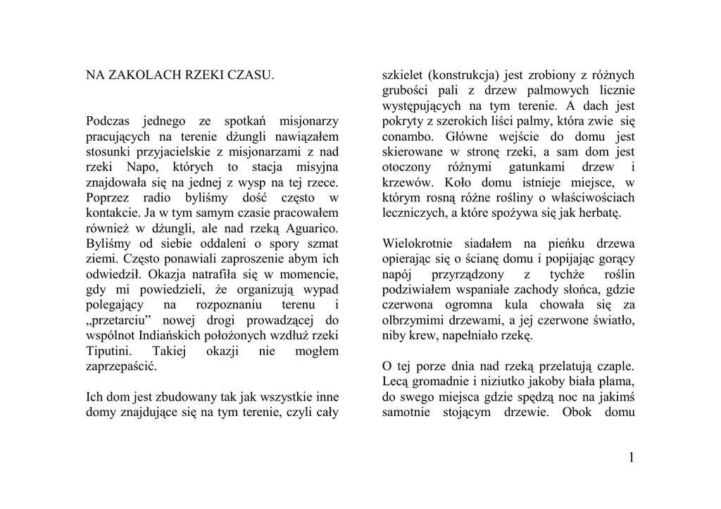 NA ZAKOLACH RZEKI CZASU. Podczas jednego ze spotkań misjonarzy pracujących na terenie dżungli nawiązałem stosunki przyjacielskie z misjonarzami z nad rzeki Napo, których to stacja misyjna znajdowała się na jednej z wysp na tej rzece. Poprzez radio byliśmy dość często w kontakcie. Ja w tym samym czasie pracowałem również w dżungli, ale nad rzeką Aguarico. Byliśmy od siebie oddaleni o spory szmat ziemi. Często ponawiali zaproszenie abym ich odwiedził. Okazja natrafiła się w momencie, gdy mi powiedzieli, że organizują wypad polegający na rozpoznaniu terenu i „przetarciu” nowej drogi prowadzącej do wspólnot Indiańskich położonych wzdłuż rzeki Tiputini. Takiej okazji nie mogłem zaprzepaścić. Ich dom jest zbudowany tak jak wszystkie inne domy znajdujące się na tym terenie, czyli cały szkielet (konstrukcja) jest zrobiony z różnych grubości pali z drzew palmowych licznie występujących na tym terenie. A dach jest pokryty z szerokich liści palmy, która zwie się conambo. Główne wejście do domu jest skierowane w stronę rzeki, a sam dom jest otoczony różnymi gatunkami drzew i krzewów. Koło domu istnieje miejsce, w którym rosną różne rośliny o właściwościach leczniczych, a które spożywa się jak herbatę. Wielokrotnie siadałem na pieńku drzewa opierając się o ścianę domu i popijając gorący napój przyrządzony z tychże roślin podziwiałem wspaniałe zachody słońca, gdzie czerwona ogromna kula chowała się za olbrzymimi drzewami, a jej czerwone światło, niby krew, napełniało rzekę. O tej porze dnia nad rzeką przelatują czaple. Lecą gromadnie i niziutko jakoby biała plama, do swego miejsca gdzie spędzą noc na jakimś samotnie stojącym drzewie. Obok domu 1 zamieszkałego przez misjonarzy, w niewielkiej odległości znajdują się domy Indian a z ich wnętrz wydobywają się kłęby dymu, o zapachu suszonego mięsa lub napoju o nazwie chicha de yuca. Znać, że to już niedługo kolacja. Rzeki, rzeczki, strumienie i wszelkie strumyczki to tyle samo znaczy dla dżungli, co żyły dla człowieka. To już kilka lat, jak Angel, Jan oraz Inżynier (jak naprawdę miał na imię to było trudno sobie przypomnieć. Wszyscy wołaliśmy na niego tak zwyczajnie – Ingeniero, czyli Inżynier) podjęli decyzję i zamieszkali na Llunchi, czyli na jednej z największych wysp na rzece Napo. Kochają tę ziemię jeszcze nieujarzmioną i silną; kochają jej czyste powietrze i poranne śpiewy czy wrzaski budzących się zwierząt. Współżyją z tamtejszymi tubylcami, Quichuas z Amazonii, którzy są ludźmi bardzo towarzyskimi, wrażliwymi, przystępni jak dzieci, miłymi, uprzejmymi, tworząc praktycznie jedna wielką rodzinę. Jednym słowem są wspaniałymi ludźmi. Wśród nich uczyli się poznawać, z upływem dni elementarne rzeczy, które pozwalają na przetrwanie, a raczej jak trzeba żyć bez żadnych zakłopotań czy nadszarpywania sobie nerwów. Z dala od cywilizacji miejskiej, tylko bycie w kontakcie z otaczającą przyrodą, nabywa się szósty zmysł, który pozwoli rozpoznać i rozkoszować się wrażliwością tego środowiska. W domu misyjnym jak i w wielu innych domach nie jest czymś dziwnym spotkać poprzywieszane na belkach niczym bombki choinkowe gniazda zamieszkałe przez osy, które również chętnie przylatują na posiłek siadając na talerze czy kubki z napojami. Można podziwiać, w jaki prosty sposób człowiek wraca do prostoty życia i przyjaznego współżycia z owadami i zwierzętami. Słońce, deszcz, błoto, anakondy, iguany, jaszczurki, nietoperze wampiry, 2 pochowane w najciemniejszych zakamarkach chaty bambusowej, mnóstwo gatunków mrówek, piranie... Cała gama heterogenicznych zwierząt, z którymi niejako zawieramy pakt harmonijnego współżycia sąsiedzkiego. Na wyspie, okres letni jest bardzo przyjemny. Wiatry przechodzą przez całą wyspę powodując, że zaledwie czuje się niewielkie upały za wyjątkiem popołudnia, gdzie odczuwa się upał, podczas którego koszule stawiają się wilgotne od potu i przylegają do ciała. Rzeka przed domem ma wygląd olbrzyma i sprawia wrażenie jakby wszystko wokół niej usypiało. Jest to czysta rzeka, w której występuje wiele gatunków ryb. Ojciec Juan bardzo lubi łowić ryby. W tym celu zakłada na nie pułapki robione sposobem Indian używając materiałów dostępnych na danym obszarze (my nazwalibyśmy to – kaszory) Podczas naszego przygotowywania się na wyprawę w wolnych chwilach chodzimy po przepięknych plażach, których miękki drobniutki i złocisty piasek odbija się w promieniach słonecznych swym jaskrawym blaskiem. Wychodząc z łódki na plażę muszę natychmiast nałożyć na nogi obuwie gdyż piasek jest tak mocno nagrzany, że można by było w nim ugotować jajko. No i właśnie po jajka właśnie tu przybyliśmy, wiedząc, że żółwie właśnie w tym czasie je tu złożyły. Ślady jeszcze są świeże tak, że nie jest aż tak trudno znaleźć miejsca złożenia jaj. W niektórych miejscach potworzyły się niejako zakola wypełnione urodzajną ziemią, na których to skrawkach Indianie w odpowiednim czasie zakładają ogródki, w których uprawiają między innymi roślinę bulwiastą zwaną la yuca. W okresie deszczowym, kiedy to błyskawice trzaskają nad szczytami gór andyjskich, rzeki 3 wzbierają i zatapiają wielkie obszary dżungli. Wyspy przemieniają się w bagna, których teren jest bardzo grząski. Kiedy znowu na niebie pojawia się ostre słońce, wszystko bardzo szybko schnie. W porze deszczowej ustają prace polowe. W tym to okresie więcej czasu poświęca się na wyrabianiu korali, koron i innych ozdób. Wyrabiają siatki czy hamaki, używając do tego sznurków zrobionych z liści palmowych. Również łatwiej o zwierzynę, która gromadzi się w wyższych partiach uciekając z terenów zalanych wodą. Indianie są dobrymi myśliwymi i potrafią wytropić zwierzynę pomiędzy gęstymi zarośl