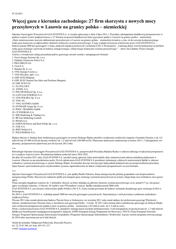 07.10.2011 Więcej gazu z kierunku zachodniego: 27 firm skorzysta z nowych mocy przesyłowych w Lasowie na granicy polsko – niemieckiej Operator Gazociągów Przesyłowych GAZ-SYSTEM S.A. w wyniku ogłoszonej w dniu 4 lipca 2011 r. Procedury udostępniania dodatkowej przepustowości w punkcie wejścia Lasów podpisał umowy z 27 firmami na przesył dodatkowych ilości gazu przez punkt w Lasowie na granicy polsko – niemieckiej. „Duże zainteresowanie nowymi zdolnościami przesyłowymi w Lasowie na granicy polsko – niemieckiej świadczy o tym, że do rozwoju konkurencyjnego runku gazu konieczne są odpowiednie zdolności techniczne systemu przesyłowego. Z tego względu inwestycje realizowane przez GAZ-SYSTEM S.A. – budowa ponad 1000 km gazociągów w kraju, połączeń międzysystemowych i terminalu LNG w Świnoujściu – wspierają dalszy rozwój konkurencji na polskim rynku gazu ziemnego i pozwolą na budowę zintegrowanego i efektywnego technicznie systemu przesyłowego.” – mówi Jan Chadam, Prezes Zarządu GAZ-SYSTEM S.A. Umowy o świadczenie usługi przesyłania paliwa gazowego zawarte zostały z następującymi firmami: 1. Ferox Energy Systems Sp. z o.o. 2. Zakłady Chemiczne Police S.A. 3. PKN ORLEN SA 4. Vitol S.A. 5. Handen Sp. Z. o.o. 6. VNG Energie Czech a.s. 7. VNG Slovakia, spol. s.r.o. 8. GDF SUEZ Belgium 9. GDF SUEZ Natural Gas Sales and Purchase Hungaria 10. GDF SUEZ SA 11. ZA PUŁAWY 12. ANWIL S.A. 13. POLTRANSGAZ Sp. Z o.o. 14. G.EN GAZ ENERGIA S.A. 15. VNG POLSKA Sp. Z o.o. 16. VNG AG 17. VNG AUSTRIA GmbH 18. ENTRADE Grupa Sp. Z o.o. 19. POGC TRADING GmbH 20. CP ENERGIA S.A. 21. KRI Marketing & Trading S.A. 22. BP Gas Marketing Limited 23. PGNiG S.A. 24. FORTUM Power and Heat Polska Sp. z o.o. 25. ZAK S.A. 26. RWE Polska S.A. 27. POLENERGIA S.A. Będąca obecnie w finalnej fazie modernizacja gazociągów na terenie Dolnego Śląska umożliwi zwiększenie możliwości importu z kierunku Niemiec o ok. 0,5 mld m3/rok (52 000 m3/h) do łącznej wielkości ok. 1,5 mld m3/rok (180 000 m3/h). Planowane ukończenie modernizacji to koniec 2011 r. Udostępnienie zwi ększonej przepustowości planowane jest od stycznia 2012 roku. *** Równolegle Operator Gazociągów Przesyłowych GAZ-SYSTEM S.A. przeprowadził Procedurę Badania Rynku w zakresie dalszego zwiększenia przepustowo ści w punkcie wejścia Lasów. Przedmiotem badania rynku był okres 2016-2025. Do dnia 30 września 2011 roku, GAZ-SYSTEM S.A. uzyskał szereg zgłoszeń, które potwierdziły duże zainteresowanie dalszą rozbudową połączenia w Lasowie. Obecnie są one przedmiotem analiz. Po ich zakończeniu GAZ-SYSTEM S.A przedstawi informację o dalszych zamierzeniach Spółki w zakresie rozbudowy systemu przesyłowego w rejonie Dolnego Śląska. Ewentualne decyzje inwestycyjne będą jednak podejmowane po przeprowadzeniu procedury Open Season i potwierdzeniu przez użytkowników systemu zapotrzebowania na dalsze zwiększanie przepustowości na tym kierunku. *** Operator Gazociągów Przesyłowych GAZ-SYSTEM S.A. jest spółką Skarbu Państwa, firmą strategiczną dla polskiej gospodarki oraz bezpieczeństwa energetycznego Polski. Kluczowym zadaniem spółki jest transport gazu ziemnego systemem przesyłowym na terenie całego kraju oraz rozbudowa sieci gazoci ągów. Firma zarządza majątkiem wartości ok. 5 miliardów złotych, na który składają się głównie elementy systemu przesyłowego, m.in. ponad 9,7 tys. km gazoci ągów wysokiego ciśnienia, 15 tłoczni, 56 węzłów oraz 970 punktów wyjścia. Spółka zatrudnia ponad 2000 osób. GAZ-SYSTEM S.A. jest również właścicielem spółki Polskie LNG S.A., która została powołana do budowy terminalu skroplonego gazu ziemnego (LNG) w Świnoujściu. Do 2014 r. GAZ-SYSTEM S.A. wybuduje ponad 1000 km nowych gazociągów przesyłowych. Najważniejsze z nich powstaną w północno-zachodniej i środkowej Polsce. Wiosną 2011 roku została ukończona budowa Tłoczni Gazu w Goleniowie, we wrześniu 2011 roku został oddany do użytkowania gazociąg Włocławek – Gdynia, zmodernizowana Tłocznia Gazu w Jarosławiu oraz gazociąg Polska – Czechy. W 2011 roku zostaną także rozbudowane gazociągu na Dolnym Śląsku oraz zwiększona przepustowość punktu Lasów na granicy polsko – niemieckiej z 0,9 mld m sześc. do 1,5 mld m sześc. . Wiele z realizowanych przez GAZ-SYSTEM S.A. projektów strategicznych uzyskało dofinansowanie z Unii Europejskiej na łączną kwotę ok. 1,7 mld złotych. Spółka jest beneficjentem następujących programów unijnych: EEPR (European Energy Programme for Recovery), TEN-E (Trans-European Networks – Energy), Programu Operacyjnego Innowacyjna Gospodarka i Programu Operacyjnego Infrastruktura i Środowisko. Łączna wartość programu inwestycyjnego do 2014 roku szacowana jest na 8 mld złotych. Osoba do kontaktu: Małgorzata Polkowska, Rzecznik Prasowy tel. 22 22 01 546, tel. kom. 691 911 217 e-mail: [email protected] <- Wstecz do: Aktualności