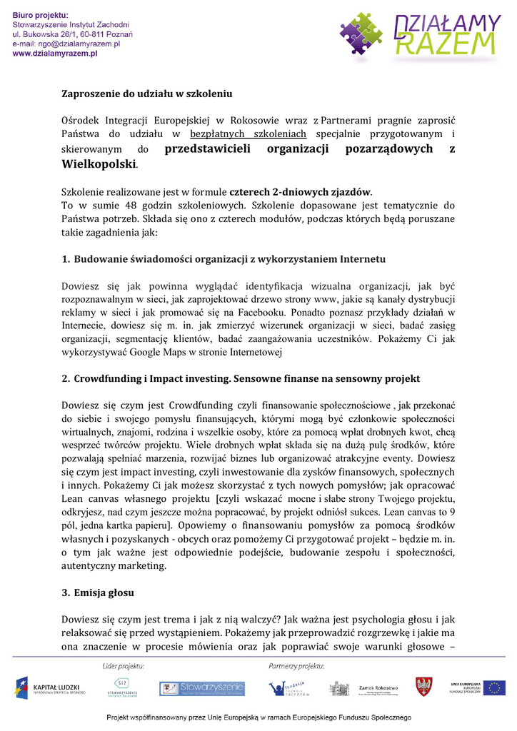 Zaproszenie do udziału w szkoleniu Ośrodek Integracji Europejskiej w Rokosowie wraz z Partnerami pragnie zaprosić Państwa do udziału w bezpłatnych szkoleniach specjalnie przygotowanym i skierowanym do przedstawicieli organizacji pozarządowych z Wielkopolski. Szkolenie realizowane jest w formule czterech 2-dniowych zjazdów. To w sumie 48 godzin szkoleniowych. Szkolenie dopasowane jest tematycznie do Państwa potrzeb. Składa się ono z czterech modułów, podczas których będą poruszane takie zagadnienia jak: 1. Budowanie świadomości organizacji z wykorzystaniem Internetu Dowiesz się jak powinna wyglądać identyfikacja wizualna organizacji, jak być rozpoznawalnym w sieci, jak zaprojektować drzewo strony www, jakie są kanały dystrybucji reklamy w sieci i jak promować się na Facebooku. Ponadto poznasz przykłady działań w Internecie, dowiesz się m. in. jak zmierzyć wizerunek organizacji w sieci, badać zasięg organizacji, segmentację klientów, badać zaangażowania uczestników. Pokażemy Ci jak wykorzystywać Google Maps w stronie Internetowej 2. Crowdfunding i Impact investing. Sensowne finanse na sensowny projekt Dowiesz się czym jest Crowdfunding czyli finansowanie społecznościowe , jak przekonać do siebie i swojego pomysłu finansujących, którymi mogą być członkowie społeczności wirtualnych, znajomi, rodzina i wszelkie osoby, które za pomocą wpłat drobnych kwot, chcą wesprzeć twórców projektu. Wiele drobnych wpłat składa się na dużą pulę środków, które pozwalają spełniać marzenia, rozwijać biznes lub organizować atrakcyjne eventy. Dowiesz się czym jest impact investing, czyli inwestowanie dla zysków finansowych, społecznych i innych. Pokażemy Ci jak możesz skorzystać z tych nowych pomysłów; jak opracować Lean canvas własnego projektu [czyli wskazać mocne i słabe strony Twojego projektu, odkryjesz, nad czym jeszcze można popracować, by projekt odniósł sukces. Lean canvas to 9 pól, jedna kartka papieru]. Opowiemy o finansowaniu pomysłów za pomocą środków własnych i pozyskanych - obcych oraz pomożemy Ci przygotować projekt – będzie m. in. o tym jak ważne jest odpowiednie podejście, budowanie zespołu i społeczności, autentyczny marketing. 3. Emisja głosu Dowiesz się czym jest trema i jak z nią walczyć? Jak ważna jest psychologia głosu i jak relaksować się przed wystąpieniem. Pokażemy jak przeprowadzić rozgrzewkę i jakie ma ona znaczenie w procesie mówienia oraz jak poprawiać swoje warunki głosowe – ćwiczenia (oddechowe, artykulacyjne, dykcyjne, fonacyjne). Powiemy jak ważna jest higiena głosu 4. Jak zarządzać wolontariuszami w organizacji pozarządowej Dowiesz się jak rozpoznać własne motywacje i swoje miejsce w wolontariacie, potrzeby wolontariusza i potrzeby organizacji. Poznasz sposoby rekrutowania wolontariuszy i przeprowadzenie rozmowy kwalifikacyjnej. Pokażemy Ci najczęściej popełniane błędy w trakcie oceniania kandydata na wolontariusza oraz jak przygotować wolontariusza do pracy. Pokażemy jak sobie radzić z konfliktowymi sytuacjami z wolontariuszem oraz jak przygotować indywidualny program woluntarystyczny 5. Zagadnienia prawne Dowiesz się jak powinny wyglądać dokumenty organizacji i co możesz zmienić w tych, które już masz. Pokażemy Ci jak powinny wyglądać ogólne zasady załatwiania spraw oraz poznasz wymagania prawne związane z prawem pracy w organizacji. Ponadto wskażemy na przykłady dobrych i złych praktyk w organizacjach. Po ukończeniu szkolenia każdy uczestnik otrzyma zaświadczenie. TERMINY Szkolenia realizowane są w następujących terminach: ZJAZD NR 1 ZJAZD NR 2 ZJAZD NR 3 ZJAZD 4 28-29.11.2014 5-6.12.2014 13-14.02.2015 20-21.03.2015 W celu zapisania się na szkolenie: należy wypełnić formularz zgłoszeniowy i przesłać go do Organizatora drogą pocztową na adres: Rokosowo 1, 63-805 Łęka Mała / lub: mailowo na adres [email protected], lub: faksem 65-573-33-04. Rekrutację koordynuje Karolina Krawiec, tel.: 65-573-33-08. Wszelkie informacje o szkoleniach dostępne są na stronie www.rokosowo.pl oraz na stronie projektu www.dzialamyrazem.pl Liczba miejsc jest ograniczona. Szkolenie odbędzie się w Zamku w Rokosowie www.rokosowo.pl. Organizator gwarantuje bezpłatnie w ramach szkolenia: nocleg, wyżywienie, materiały szkoleniowe. Zapewniamy transport z Poznania do Rokosowa. Szkolenia będą prowadzone przez: Tomasz Sobol - Budowanie świadomości organizacji z wykorzystaniem internetu Absolwent Szkoły Liderów Społeczeństwa Obywatelskiego w Warszawie, trener i miłośnik nowych mediów, zawodowo związany z e-marketingiem. Posiada uprawnienia pedagogiczne, posiada wiedzę i doświadczenie w zakresie szkoleń dotyczących bezpieczeństwa w Internecie, tworzenia strategii biznesowych, oraz wykorzystania nowych technologii na potrzeby firmy. Od 2008r. prezes zarządu Fundacji Varietae. Dawid Sokołowski - Crowdfunding i Impact investing. Sensowne finanse na sensowny projekt Założyciel Sieci Sensownego Biznesu. Pracował w Gildii Aniołów Biznesu oraz funduszu VC ZernikeMeta Ventures gdzie oceniał oraz pracował z projektami startupowymi. Przez jego ręce przeszło ok. 700-800 projektów. Wielokrotnie prowadził warsztaty i prezentacje dotyczące rynku startupów i inwestycji w Polsce oraz ich przygotowania do inwestycji kapitałowych. Ma także na swoim koncie lekcje z dwóch nieudanych własnych projektów co sprawia, że oprócz profesjonalnego doświadczenia inwestorskiego nauczył się wiele na własnej skórze. Jako wielki zwolennik interdyscyplinarności czerpie doświadczenia i umiejętności z wielu źródeł. Jego zainteresowania dotyczą m.in. crowdsourcingu, ekonomii współpracy, przedsiębiorczości społecznej, kreatywności, studiów przyszłości, ale także filozofii wschodu, psychologii czy zdrowego stylu życia. Ewa Jarmakowska – Kolanus - emisja głosu Filolog klasyczny, muzyk instrumentalista; ab