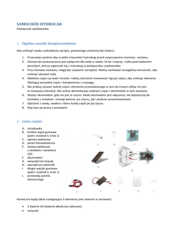 SAMOCHÓD HYDROCAR Podręcznik użytkownika 1. Ogólne zasady bezpieczeństwa Aby uniknąć ryzyka uszkodzenia sprzętu, poważnego zranienia lub śmierci: 1. Przeczytaj uważnie aby w pełni zrozumieć instrukcję przed rozpoczęciem montażu zestawu. 2. Zestaw ten przeznaczony jest wyłącznie dla osób w wieku 14 lat i więcej, i tylko pod nadzorem dorosłych, którzy zapoznali się z instrukcją w podręczniku użytkownika. 3. Przy montażu zestawu, mogą być używane narzędzia. Należy zachować szczególną ostrożność, aby uniknąć obrażeń ciała. 4. Niektóre części są małe i kruche: należy ostrożnie montować i łączyć części, aby uniknąć złamania. Obsługuj wszystkie części i komponenty z rozwagą. 5. Nie próbuj używać żadnej części, elementu przewidzianego w tym do innych celów niż jest w niniejszej instrukcji. Nie wolno demontować żadnych części i elementów w tym zestawie. 6. Wyłącz akumulator, gdy nie jest w użyciu. Kiedy akumulator jest włączony, nie dopuszczaj do kontaktu z metalem. Usunąć baterie, po użyciu, jak i podczas przechowywania. 7. Opróżnić z wody, wodoru i tlenu każdą część po jej użyciu. 8. Myj ręce po pracy z zestawem. 2. Lista części A. strzykawka B. krótkie węże gumowe (patrz rozdział 3, krok 1) C. ogniwo paliwowe D. panel fotowoltaiczny E. zestaw podwozia z silnikiem i światłami LED F. akumulator G. wewnętrzne kopuły H. zewnętrzne zbiorniki I. długie wężyki gumowe (patrz rozdział 3, krok 1) J. przewody panelu słonecznego Konieczne będą także następujące 3 elementy (nie zawarte w zestawie): 2 baterie AA (baterie alkaliczne zalecane) nożyczki 100 ml wody destylowanej* Aby optymalnie wykorzystać możliwości samochodu zalecana jest woda destylowana* 3. Montaż zestawu Krok 1: Użyj nożyczek (nie dołączone w zestawie), aby wyciąć dwa odcinki o długościach 4 cm z długiego gumowego wężyka zawartego w zestawie. Umieść czerwony korek na jednym końcu 4 cm wężyka, a czarny korek w drugim 4 cm wężyku. Te krótkie gumowe wężyki są częścią (B) w zestawie. Pozostały wężyk przetnij na dwie równe części. Te dwa elementy zostaną zastosowane do stworzenia części (I) zestawu. Krok 2: Podłącz krótki gumowy wężyk (B) z czarnym korkiem do króćca na górze po stronie wodoru w ogniwie paliwowym (oznaczone H2). Podłącz drugi krótki gumowy wężyk (B) z czerwonym korkiem do króćca na górze po stronie tlenu (oznaczone O2). Krok 3: Umieścić ogniwo paliwowe (C) z dołączonymi wężykami (B) w gnieździe w prostokątnej podstawce (E). Krok 4: W zbiornikach umieszczamy kopuły, dzięki którym w trakcie wprowadzania gazu do zbiorników, możliwe będzie podwyższenie poziomu wody, która będzie znajdowała się w zbiornikach, co pozwoli nam kontrolować ilość zbieranych gazów. Każda z kopuł posiada 2 wycięcia, które trzeba tak umieścić w zbiorniku, aby umożliwić bezproblemowy przepływ wody pod kopułę. Ważne, aby każda z kopuł była wypełniona wodą, w kopułach nie może być powietrza. Zbiorniki uzupełniamy wodą do poziomu 0. Zbiorniki łączymy z elektrolizerem za pomocą wężyków. Zbiornik na wodór łączymy z elektrolizerem po stronie katody. Krok 5: Jeden koniec wężyka montujemy na kopule w zbiorniku na wodór, drugi koniec na dolnym króćcu po stronie katody. Zbiornik na tlen łączymy z elektrolizerem po stronie anody. Jeden koniec wężyka montujemy na kopule w zbiorniku na tlen, drugi koniec na dolnym króćcu po stronie anody. Krok 6: Dobra przewodność jonowa jest krytyczna dla wydajności ogniwa. W celu zapewnienia dobrego przewodzenia ciepła, membrana ogniwa paliwowego musi być odpowiednio nawilżona. W celu nawodnienia ogniwa paliwowego, należy wykonać poniższą instrukcję: Użyj strzykawki (A) do zasysania wody destylowanej (do nabycia osobno). Kiedy strzykawka jest wypełniona wodą destylowaną, podłącz ją do dolnego króćca po stronie tlenu (C) i wlej wodę do połowy elektrolizera. Zostaw ogniwo paliwowe na 5 do 10 minut, aby w pełni się nawodniło. 4. Elektroliza: tworzenie wodoru z wody Elektroliza jest procesem przetwarzania energii elektrycznej w energię chemiczną. Gdy ładunek elektryczny jest wprowadzany do wody, ładowanie przerywa wiązanie chemiczne pomiędzy wodorem i tlenem, tak że tworzą się naładowane cząstki, tak zwane jony. W tym przypadku, naładowane dodatnio jony wodoru i ujemnie naładowane jony są uformowane. Elektrolizer ma 2 elektrody gdzie są tworzone jony. Jedna elektroda, zwana anodą, jest naładowana dodatnio i przyciąga ujemnie naładowane jony. Druga elektroda zwana katodą przyciąga dodatnio naładowane jony wodoru. Odwracalne ogniwa paliwowe mogą być używane do wykonywania elektrolizy. W ogniwie paliwowym, elektrolit jest częścią zespołu membranowego. Po podaniu napięcia do ogniwa paliwowego, w procesie elektrolizy wody wytworzy się wodór po stronie katody i tlen, po stronie anody. Uwaga: Poniższe etapy instrukcji tylko po wykonaniu wszystkich czynności opisanych w rozdziale: "Montaż zestawu". Sprawdź, czy ogniwo jest uwodnione przez wstrzykiwanie wody za pomocą strzykawki, przed przystąpieniem do elektrolizy. Ostrzeżenie: Stosowanie niedestylowanej wody uszkadza elektrody w ogniwach paliwowych. Ogniwa paliwowe w skali nano używają węgiel wspierany platyną jako katalizatora, a te cząstki są bardzo wrażliwe na zanieczyszczenia znajdujące się w wodzie niedestylowanej. W zestawach ,,Hydrocar”, może być również wykorzystana wysokiej jakości woda pitna lub woda z kranu, o niskiej zawartości soli mineralnych – jednakże skraca to znacznie żywotność zestawu. Ogniwo paliwowe musi być tylko nawilżone po stronie “O2”, a nie po stronie “H2”. Niespełnienie tego wymogu spowoduje zablokowanie przepływu wodoru. a) Elektroliza z wykorzystaniem panelu słonecznego Zestaw “Hydrocar” może korzystać z małego panelu fotowoltaiczne