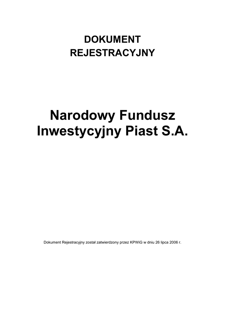 DOKUMENT REJESTRACYJNY Narodowy Fundusz Inwestycyjny Piast S.A. Dokument Rejestracyjny został zatwierdzony przez KPWiG w dniu 26 lipca 2006 r. Dokument Rejestracyjny NFI Piast SPIS TREŚCI 1 CZYNNIKI RYZYKA .................................................................................................................................. 6 1.1 CZYNNIKI RYZYKA ZWIĄZANE Z OTOCZENIEM, W JAKIM EMITENT PROWADZI DZIAŁALNOŚĆ .................. 6 1.1.1 Ryzyko konkurencji.......................................................................................................................... 6 1.1.2 Ryzyko związane z koniunkturą gospodarczą w Polsce................................................................... 6 1.1.3 Ryzyko niekorzystnych zmian przepisów podatkowych ................................................................... 6 1.1.4 Ryzyko wystąpienia nieprzewidywalnych zdarzeń........................................................................... 6 1.2 CZYNNIKI RYZYKA ZWIĄZANE BEZPOŚREDNIO Z DZIAŁALNOŚCIĄ EMITENTA .......................................... 6 1.2.1 Ryzyka związane z przedsięwzięciami realizowanym na rynku nieruchomości............................... 6 1.2.2 Ryzyka związane z inwestycjami Emitenta w spółki celowe ............................................................ 8 1.2.3 Ryzyko związane z partnerem biznesowym...................................................................................... 9 1.2.4 Ryzyko związane z utratą kluczowych pracowników....................................................................... 9 1.2.5 Ryzyko związane z udzielonymi poŜyczkami.................................................................................... 9 1.2.6 Ryzyka związane z finansowaniem dłuŜnym działalności Emitenta lub spółek celowych................ 9 1.2.7 Ryzyko kursowe ............................................................................................................................. 10 1.2.8 Ryzyko związane z umową z TTC .................................................................................................. 10 2 OSOBY ODPOWIEDZIALNE ZA INFORMACJE ZAMIESZCZONE W DOKUMENCIE REJESTRACYJNYM ........................................................................................................................................ 11 3 BIEGLI REWIDENCI................................................................................................................................ 12 3.1 3.2 3.3 4 WYBRANE DANE FINANSOWE EMITENTA ..................................................................................... 12 4.1 5 BADANIA SPRAWOZDAŃ FINANSOWYCH ZA ROK 2003 ........................................................................... 12 BADANIE SPRAWOZDAŃ FINANSOWYCH ZA ROK 2004 ........................................................................... 12 BADANIE SPRAWOZDAŃ FINANSOWYCH ZA ROK 2005 ........................................................................... 12 WYBRANE DANE FINANSOWE EMITENTA ............................................................................................... 12 INFORMACJE O EMITENCIE ............................................................................................................... 13 5.1 HISTORIA I ROZWÓJ EMITENTA .............................................................................................................. 13 5.1.1 Statutowa i handlowa nazwa Emitenta ......................................................................................... 13 5.1.2 Miejsce rejestracji Emitenta oraz numer rejestracyjny................................................................. 13 5.1.3 Data utworzenia Emitenta............................................................................................................. 13 5.1.4 Siedziba i forma prawna Emitenta, przepisy prawa, na podstawie których i zgodnie z którymi działa Emitent, kraj siedziby oraz adres i numer telefonu jego siedziby....................................................... 13 5.1.5 Istotne zdarzenia w rozwoju gospodarczym Emitenta................................................................... 14 5.2 INWESTYCJE EMITENTA ......................................................................................................................... 15 5.2.1 Opis głównych inwestycji .............................................................................................................. 15 5.2.2 Opis obecnie prowadzonych inwestycji Emitenta ......................................................................... 15 5.2.3 Opis przyszłych inwestycji, co do których organy zarządzające Emitenta podjęły wiąŜące juŜ zobowiązania................................................................................................................................................. 17 6 ZARYS OGÓLNY DZIAŁALNOŚCI EMITENTA ................................................................................ 17 6.1 DZIAŁALNOŚĆ PODSTAWOWA ................................................................................................................ 17 6.1.1 Opis i główne czynniki charakteryzujące podstawowe obszary działalności oraz rodzaj prowadzonej przez Emitenta działalności operacyjnej. Podstawowe kategorie sprzedawanych produktów i usług ....................................................................................................................................................... 17 6.1.2 Nowe produkty i usługi. Zakres informacji dla spółek rozpoczynających działalność gospodarczą (start-up) zgodnie z rekomendacją CESR w sprawie spójnej implementacji Rozporządzenia Komisji Europejskiej nr 809/2004 o prospekcie......................................................................................................... 22 6.2 GŁÓWNE RYNKI, NA KTÓRYCH EMITENT PROWADZI DZIAŁALNOŚĆ ....................................................... 26 6.2