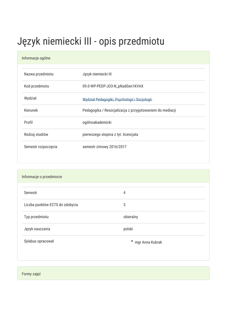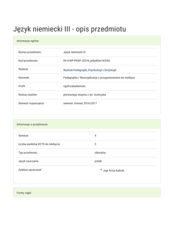 Język niemiecki III - opis przedmiotu Informacje ogólne Nazwa przedmiotu Język niemiecki III Kod przedmiotu 09.0-WP-PEDP-JO3-N_pNadGen1KVAX Wydział Wydział Pedagogiki, Psychologii i Socjologii Kierunek Pedagogika / Resocjalizacja z przygotowaniem do mediacji Profil ogólnoakademicki Rodzaj studiów pierwszego stopnia z tyt. licencjata Semestr rozpoczęcia semestr zimowy 2016/2017 Informacje o przedmiocie Semestr 4 Liczba punktów ECTS do zdobycia 3 Typ przedmiotu obieralny Język nauczania polski Sylabus opracował Formy zajęć mgr Anna Kubrak Forma zajęć Konwersatorium Liczba godzin Liczba godzin Liczba godzin w Liczba godzin w Forma w semestrze w tygodniu semestrze tygodniu zaliczenia (stacjonarne) (stacjonarne) (niestacjonarne) (niestacjonarne) 30 2 18 1,2 Egzamin Cel przedmiotu Celem kursu jest podniesienie kompetencji językowej i komunikacyjnej w zakresie odpowiadającym poziomowi B2 według Europejskiego Systemu Opisu Kształcenia Językowego w stopniu umożliwiającym: wykorzystanie języka obcego dla potrzeb studiowania, a w szczególności umiejętne korzystanie z różnorodnych obcojęzycznych materiałów źródłowych, mediów, literatury popularnonaukowej i specjalistycznej; kontynuację nauki w ramach wybranej specjalizacji na uczelniach zagranicznych; wykonywanie pracy zawodowej lub naukowej z wykorzystaniem języka obcego. Wymagania wstępne Znajomość języka obcego na poziomie B1. Zakres tematyczny Zachowania społeczne. Osobowość. Stereotypy narodowe, różnice kulturowe. Różne sposoby komunikacji werbalnej i niewerbalnej. Metody kształcenia Metoda komunikacyjna, dyskusja, praca z tekstem naukowym w j. obcym, praca w grupach, burza mózgów. Efekty kształcenia i metody weryfikacji osiągania efektów kształcenia Opis efektu Symbole efektów Metody weryfikacji Forma zajęć Opis efektu Symbole Metody weryfikacji Forma zajęć efektów Potrafi w sposób precyzyjny i spójny K_U06 kolokwium wypowiadać się w języku obcym w obserwacja i ocena mowie i piśmie na tematy dotyczące aktywności na wybranych zagadnień pedagogicznych zajęciach Konwersatorium obserwacje i ocena umiejętności praktycznych studenta sprawdzian z progami punktowymi konwesracja Student potrafi samodzielnie K_U04 obserwacja i ocena zdobywać wiedzę, rozwijać swoje aktywności na profesjonalne umiejętności zajęciach korzystając z różnych źródeł w języku konwersacja Konwersatorium obcym; posiada umiejętności językowe na poziomie B2 Warunki zaliczenia Konwersatoria Konwersatoria kończą się egzaminem. Metodą weryfikacji efektów kształcenia jest egzamin pisemny i ustny sprawdzający znajomość języka specjalistycznego na poziomie B2 z uwzględnieniem specyfiki kierunku studiów. Egzamin składa się z 4 części: czytania, pisania, słuchania i mówienia. Student otrzymuje ocenę z egzaminu wg następujących progów punktowych: 50-60% dostateczny, 61-70% dostateczny plus, 71-80% dobry, 81-90% dobry plus, 91100% bardzo dobry. Ocena z konwersatoriów jest oceną z egzaminu. Ocena końcowa Ocena końcowa jest oceną z egzaminu. Obciążenie pracą Obciążenie pracą Studia Studia niestacjonarne stacjonarne (w godz.) (w godz.) Godziny kontaktowe (udział w zajęciach; konsultacjach; egzaminie, itp.) 40 25 Samodzielna praca studenta (przygotowanie do: zajęć, kolokwium, 50 65 Łącznie 90 90 Punkty ECTS Studia Studia niestacjonarne egzaminu; studiowanie literatury przygotowanie: pracy pisemnej, projektu, prezentacji, raportu, wystąpienia; itp.) stacjonarne Zajęcia z udziałem nauczyciela akademickiego 1 1 Zajęcia bez udziału nauczyciela akademickiego 2 2 Łącznie 3 3 Literatura podstawowa 1. DaF kompakt A1-B1 Kursbuch mit 3 Audio-CDs + Übungsbuch mit 2 Audio-CDs, Verlag Klett, 2011. 2. MEMO Lehr-und Übungsbuch mit 2CDs,Wortschatz- und Fertigkeitstrainin zum Zertifikat Deutsch als Fremdsprache + MEMO Lernwortschatz Deutsch-Polnisch, VerlagLangenscheidt, 2006. 3. em Brückenkurs-Deutsch als Fremdsprache für die Mittelstufe mit 2CDs + Arbeitsbuch, Max Hueber Verlag, 2006. 4. em Hauptkurs + Arbeitsbuch mit 2CDs, Max Hueber Verlag, 2009. 5. em Abschlusskurs mit 2CDs, Max Hueber Verlag, 2009. 6. Themen 2/3 neu, Lehrwerk für Deutsch als Fremdsprache + Arbeitsbuch mit 2CDs + Lehrerhandbuch A,B, Max Hueber Verlag, 2007. 7. Bęza S., Repetytorium gramatyki języka niemieckiego. 8. Apelt M.L., Apelt H.P., Wagner M., Grammatik a la carte! Das Übungsbuch zur Grundgrammatik Deutsch,Verlag Moritz Diesterweg/Verlag Sauerländer. 9. Grammatikbogen-Fiktionele Texte mit Aufgaben und Lösungsschlüseln für den Unterricht Deutsch als Fremdsprache, Langenscheidt, 1998. Literatura uzupełniająca Brak Uwagi Zmodyfikowane przez dr Anita Famuła-Jurczak (ostatnia modyfikacja: 20-07-2016 21:23)
