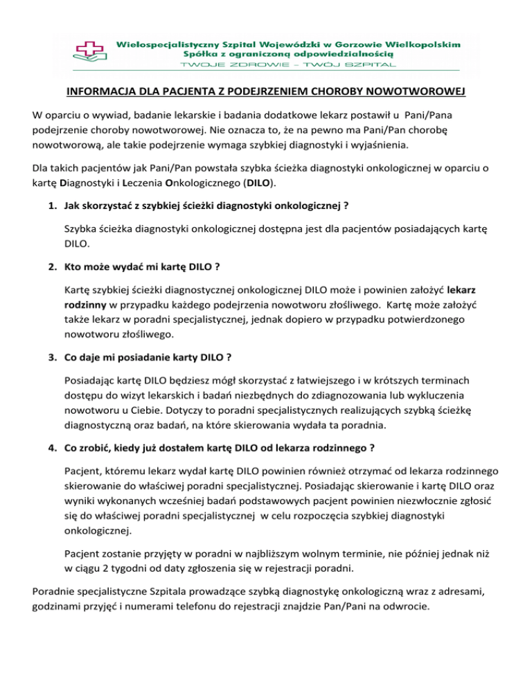 INFORMACJA DLA PACJENTA Z PODEJRZENIEM CHOROBY NOWOTWOROWEJ W oparciu o wywiad, badanie lekarskie i badania dodatkowe lekarz postawił u Pani/Pana podejrzenie choroby nowotworowej. Nie oznacza to, że na pewno ma Pani/Pan chorobę nowotworową, ale takie podejrzenie wymaga szybkiej diagnostyki i wyjaśnienia. Dla takich pacjentów jak Pani/Pan powstała szybka ścieżka diagnostyki onkologicznej w oparciu o kartę Diagnostyki i Leczenia Onkologicznego (DILO). 1. Jak skorzystać z szybkiej ścieżki diagnostyki onkologicznej ? Szybka ścieżka diagnostyki onkologicznej dostępna jest dla pacjentów posiadających kartę DILO. 2. Kto może wydać mi kartę DILO ? Kartę szybkiej ścieżki diagnostycznej onkologicznej DILO może i powinien założyć lekarz rodzinny w przypadku każdego podejrzenia nowotworu złośliwego. Kartę może założyć także lekarz w poradni specjalistycznej, jednak dopiero w przypadku potwierdzonego nowotworu złośliwego. 3. Co daje mi posiadanie karty DILO ? Posiadając kartę DILO będziesz mógł skorzystać z łatwiejszego i w krótszych terminach dostępu do wizyt lekarskich i badań niezbędnych do zdiagnozowania lub wykluczenia nowotworu u Ciebie. Dotyczy to poradni specjalistycznych realizujących szybką ścieżkę diagnostyczną oraz badań, na które skierowania wydała ta poradnia. 4. Co zrobić, kiedy już dostałem kartę DILO od lekarza rodzinnego ? Pacjent, któremu lekarz wydał kartę DILO powinien również otrzymać od lekarza rodzinnego skierowanie do właściwej poradni specjalistycznej. Posiadając skierowanie i kartę DILO oraz wyniki wykonanych wcześniej badań podstawowych pacjent powinien niezwłocznie zgłosić się do właściwej poradni specjalistycznej w celu rozpoczęcia szybkiej diagnostyki onkologicznej. Pacjent zostanie przyjęty w poradni w najbliższym wolnym terminie, nie później jednak niż w ciągu 2 tygodni od daty zgłoszenia się w rejestracji poradni. Poradnie specjalistyczne Szpitala prowadzące szybką diagnostykę onkologiczną wraz z adresami, godzinami przyjęć i numerami telefonu do rejestracji znajdzie Pan/Pani na odwrocie. Poradnia Adres Poradnia Chirurgii Ogólnej ul. Walczaka 42, Gorzów Wlkp. Poradnia Gastroenterologiczna ul. Walczaka 42, Gorzów Wlkp. Poradnia Urologiczna ul. Walczaka 42, Gorzów Wlkp. Poradnia Laryngologiczna ul. Walczaka 42, Gorzów Wlkp. Poradnia Gruźlicy i Chorób Płuc ul. Walczaka 42, Gorzów Wlkp. Poradnia Chirurgii Onkologicznej ul. Walczaka 42, Gorzów Wlkp. Poradnia Onkologiczna ul. Walczaka 42, Gorzów Wlkp. Godziny przyjęć Poniedziałek: godz. 15.00 - 19.00 Wtorek: godz. 08.30 - 12.30 Środa: godz. 08.30 - 12.30 Czwartek: godz. 08.30 - 12.30 Piątek: godz. 08.30 - 12.30 Poniedziałek: 12:00 - 16:00 Czwartek: 14:00 - 18:00 Piątek: 10:00 - 15:00 Poniedziałek: godz. 15.00 - 19.00 Wtorek: godz. 15.00 - 19.00 Środa: godz. 15.00 - 19.00 Czwartek: godz. 15.00 - 19.00 Piątek: godz. 10.00 - 14.00 Poniedziałek: godz. 15.00 - 19.00 Wtorek: godz. 08.00 - 12.00 Czwartek: godz. 13.30 - 18.00 Poniedziałek: 8:00 - 13:30 Wtorek: 14:00 - 18:00 Środa: 8:00-13:30 Czwartek: 8:00-13:30 Piątek: 8:00-13:30 Środa: godz. 15:00 - 19:30 Czwartek: godz. 9:00 - 19:30 Piątek: godz. 9:00 - 14:30 Gabinet onkologii klinicznej Pon-Pt : godz. 8:30 - 14:30 Gabinet onkologiczny (profilaktyka) Poniedziałek: godz. 15.30-18.00 Wtorek: godz. 15.30 - 19.00 Gabinet onkologiczny (ginekologia) Poniedziałek: godz. 8.00 - 14.00 Rejestracja 95 7331 518 95 7331 518 95 7331 862 95 7331 809 95 7331 862 95 7331 810 osobista godz. 7.30 - 9.00 telefoniczna godz. 9.00 12.00 95 7331 810
